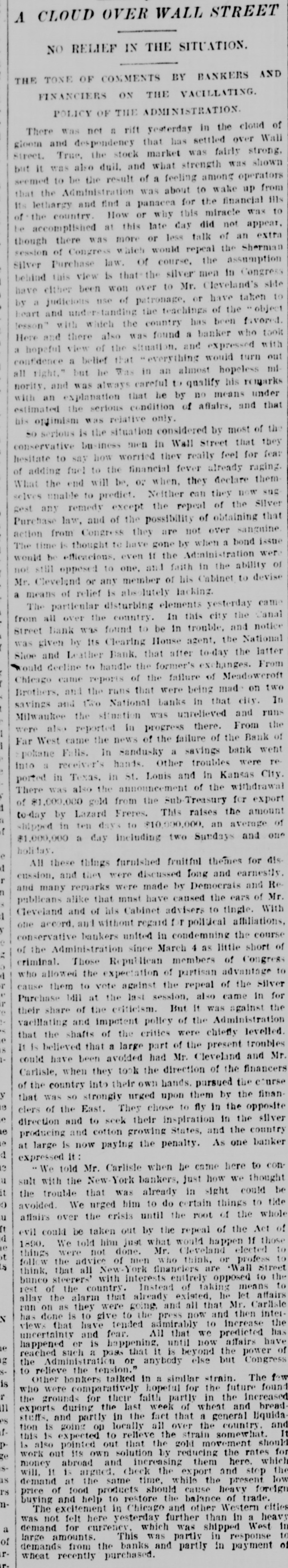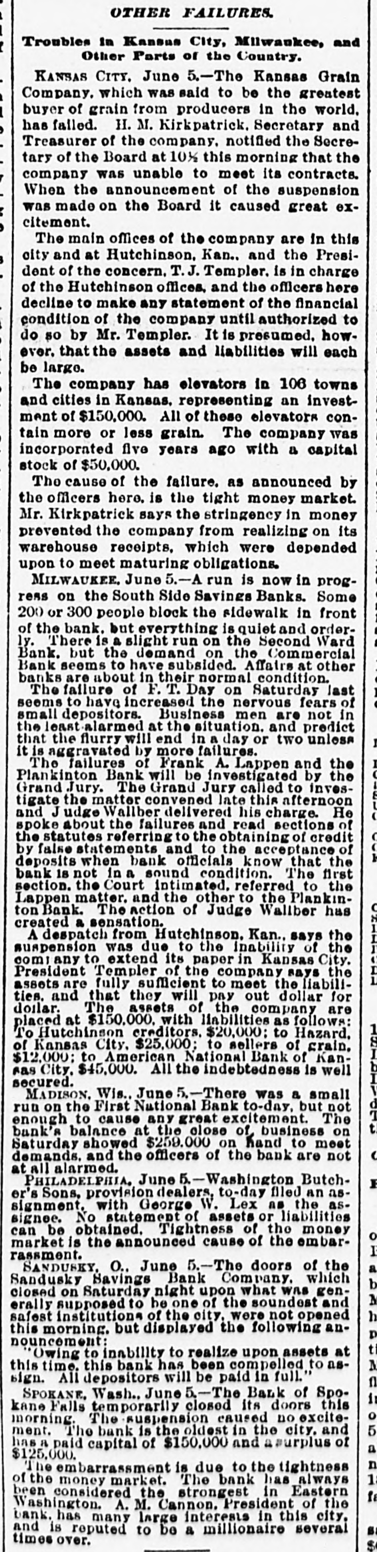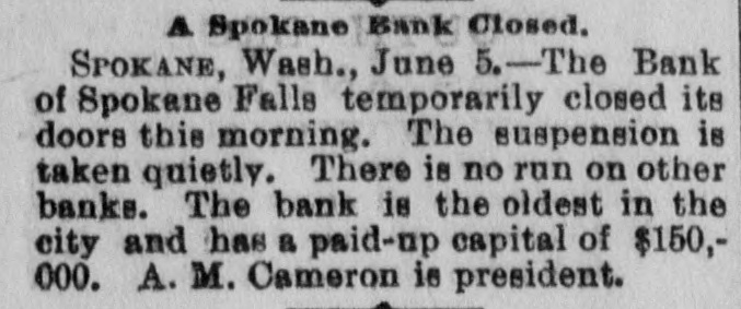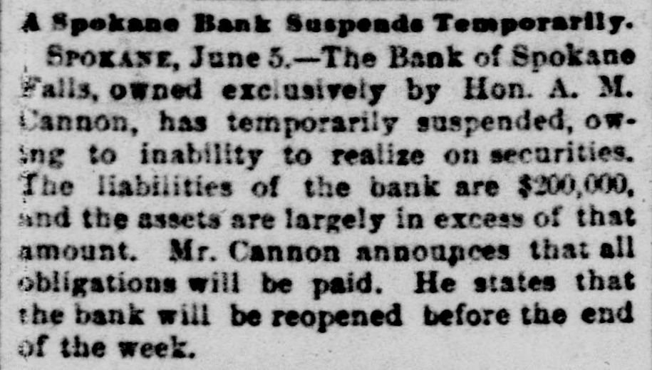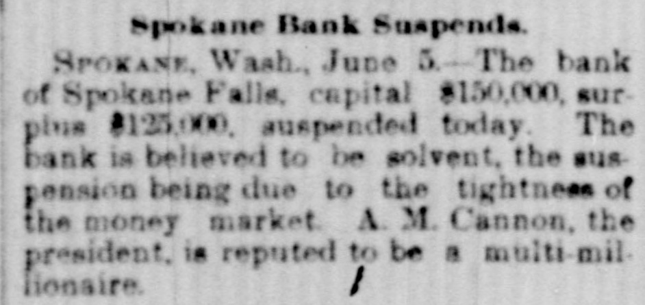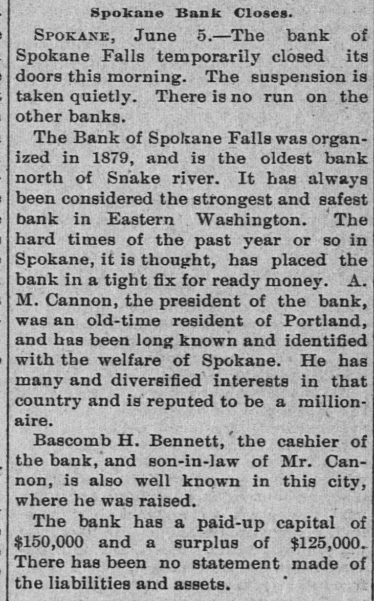 know nothing of his whereabouts. 1218 stated that he left his business affairs in bad condition. His property has been attached in a suit brought by Mrs. Charlotte Baker to recover $12,000 given to Mr. Merrill to urchase shares of stock for her. but since that time he has failed to turn them over to her. Other attachments are: Sarah A. Cohen. $40,000; Hepsebeth Fenton, $5,000; Susan D. B. Webber, $10,000; Robert M. Morse, $25,000; Lucia A. D. Long, $100,000. John F. Hooper. Mr. Merrill's private secretary, said to-day that Mr. Merrill had gone away for rest, on the advice of a physician. His financial affairs, his secretary says, are in good condition. and all claims against him will be promptly paid when he returns. Winthorp M. Merrill said to-day: "1 think it would be safe to estimate that after all my father's liabilities are met he would be worth from $100,000 to $200,000." Three More Spokane Banks Closed. SPOKANE, Wash., June 6.-As a result of the suspension of the Pank of Spokane Falls yesterday, three other banks in this city closed their doors to-day. They are the Washington National, the Washington Savings and the Citizens' National. A. M. Cannon, president of the Bank of Spokane Falls, is vice president of both the Washington National and Washington Savings Bank and the failure is due directly to the failure of the Bank of Spokane Falls. There great excitement during the run occurred on day and was a Washington nearly every Nabank in the city. The tional has a paid-up capital of $100,000, and according to a recent statement has deto $326,000. posits amounting The capital Wash- of 1D g ton Savings has a paid-up $50,000 and deposits of $100,000. The Citiof $150,000 and to about zens' deposits National amounting has a capital $400,000. It is believed all the banks are perfectly solvent and will resume in a few days. The Palonse City Bank of Palouse City, also closed its doors to-day. Bedford Bank Forced to Suspend. Special to the Indianapolis Journal BEDFORD, Ind., June 6.-The Bedford Bank this morning closed its doors. The president claims that owing to an unprecedented heavy run on the Chicago banks yesterday, which had promised assistance, the bank was forced to suspend. Depositors are promised to receive full value for every dollar. The bank 18 one of the oldest in the State. The exact amount of deposits 18 not known at present, but are supposed to be large. Packing House Attached. WICHITA, Kan., June 6.-The Laclede and Third National Banks, of St. Louis, and the Bank of Commerce, of Kansas City, to-day sued out attachments for $50.000 and $25,000, and $50,000, respectively, against the Francis Whittaker & Sone house. Late this evening N. packing of the property. The sheriff is in possession W. Levy, president of the Wichita National Bank, was appointed receiver. The plant here is valued at $200,000. Assignment of New England Publishers. BOSTON, June 5.-Potter & Potter, publishers of the New England Magazine, the Yankee Blade, the Woman's Home Journal, the American Vehicle and the Amesbury, have assigned to W. J. Clark, of this city. Isaac J. Potter said that the New England Magazine had broken the firm. and that the other publications were in good condition. The liabilities are between $75,000 and $100,000. A Wisconsin Bank Suspends. Lane The State