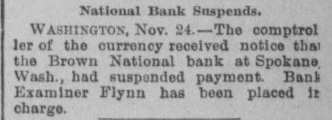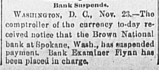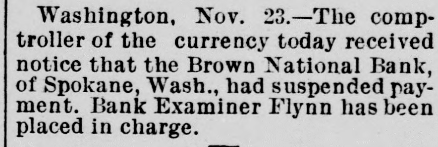 SPOKANE BANK BURSTS. Spokane, Nov. 23.-The Brown National bank closed its doors today and went into insolvency. The failure was not a surprise, as the bank was known to be cramped for funds. The suspension caused no flurry in business circles. There was a small withdrawal from other banks, but they are in no danger. Individual deposits, subject to check at the time of the last published statement, amounted to $43,000, as the bank had long ago paid off most of the depositors. Cashier Shaw put the assets at $11.650; liabilities, $77,900; deposits, $29,800. The bank was organized in 1889. J. J. Browne was chief stockholder and its president.