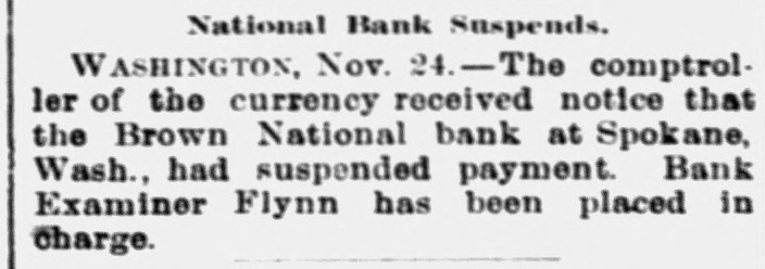 National Bank Suspends. W ASHINGTON, Nov. 24.-The comptroller of the currency received notice that the Brown National bank at Spokane, Wash., had suspended payment. Bank Examiner Flynn has been placed in charge.