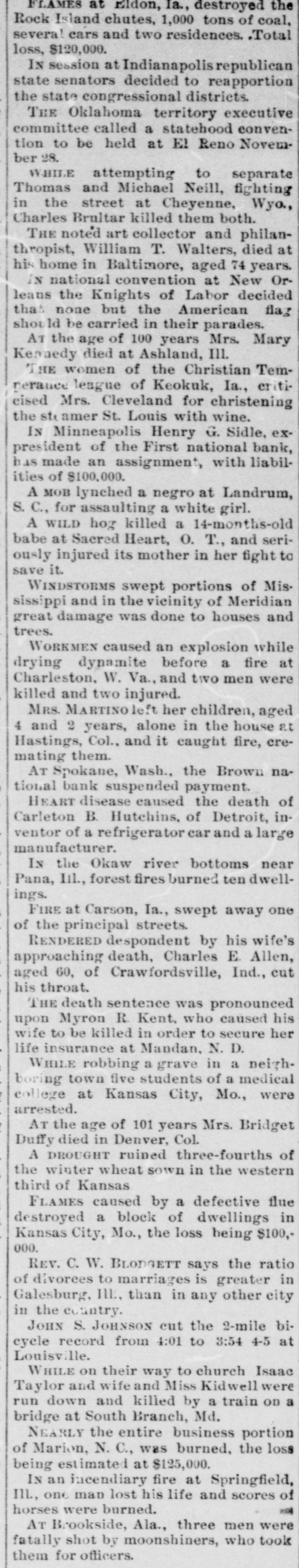 IN session at Indianapolis republican state senators decided to reapportion the state congressional districts. THE Oklahoma territory executive committee called a statehood convention to be held at El Reno November 28. WHILE attempting to separate Thomas and Michael Neill, fighting in the street at Cheyenne, Wyo., Charles Brultar killed them both. THE noted art collector and philanthropist, William T. Walters, died at his home in Baltimore, aged 74 years. IN national convention at New Orleans the Knights of Labor decided that none but the American flag shou Id be carried in their parades. AT the age of 100 years Mrs. Mary Kennedy died at Ashland, III. THE women of the Christian Temperance league of Keokuk, Ia., criticised Mrs. Cleveland for christening the ste amer St. Louis with wine. IN Minneapolis Henry G. Sidle, expresident of the First national bank, has made an assignment, with liabilities of $100,000. A MOB lynched a negro at Landrum, S. C., for assaulting a white girl. A WILD hog killed a 14-months-old babe at Sacred Heart, O. T., and seriously injured its mother in her fight to save it. WINDSTORMS swept portions of Mississippi and in the vicinity of Meridian great damage was done to houses and trees. WORKMEN caused an explosion while drying dynamite before a fire at Charleston, W. Va., and two men were killed and two injured. MRS. MARTINO left her children, aged 4 and 2 years, alone in the house at Hastings, Col., and it caught fire, cremating them. AT Spokane, Wash., the Brown national bank suspended payment. HEART disease caused the death of Carleton B. Hutchins, of Detroit, inventor of a refrigerator car and a large manufacturer. IN the Okaw river bottoms near Pana, Ill., forest fires burned ten dwellings. FIRE at Carson, Ia., swept away one of the principal streets. RENDERED despondent by his wife's approaching death, Charles E. Allen, aged 60, of Crawfordsville, Ind., cut his throat. THE death sentence was pronounced upon Myron R. Kent. who caused his wife to be killed in order to secure her life insurance at Mandan, N. D. WHILE robbing a grave in a neighboring town five students of a medical college at Kansas City, Mo., were arrested. AT the age of 101 years Mrs. Bridget Duffy died in Denver, Col. A DROUGHT ruined three-fourths of the winter wheat sown in the western third of Kansas FLAMES caused by a defective flue destroyed a block of dwellings in Kansas City, Mo., the loss being $100,000. REV. C. W. BLODGETT says the ratio of divorces to marriages is greater in Galesburg, III., than in any other city in the country. JOHN S. JOHNSON cut the 2-mile bicycle record from 4:01 to 3:54 4-5 at Louisville. WHILE on their way to church Isaac Taylor and wife and Miss Kidwell were run down and killed by a train on a bridge at South Branch, Md. NEARLY the entire business portion of Marion, N. C., was burned, the loss being estimated at $125,000. IN an incendiary fire at Springfield, III., one man lost his life and scores of horses were burned. 1 AT Brookside, Ala., three men were fatally shot by moonshiners, who took them f