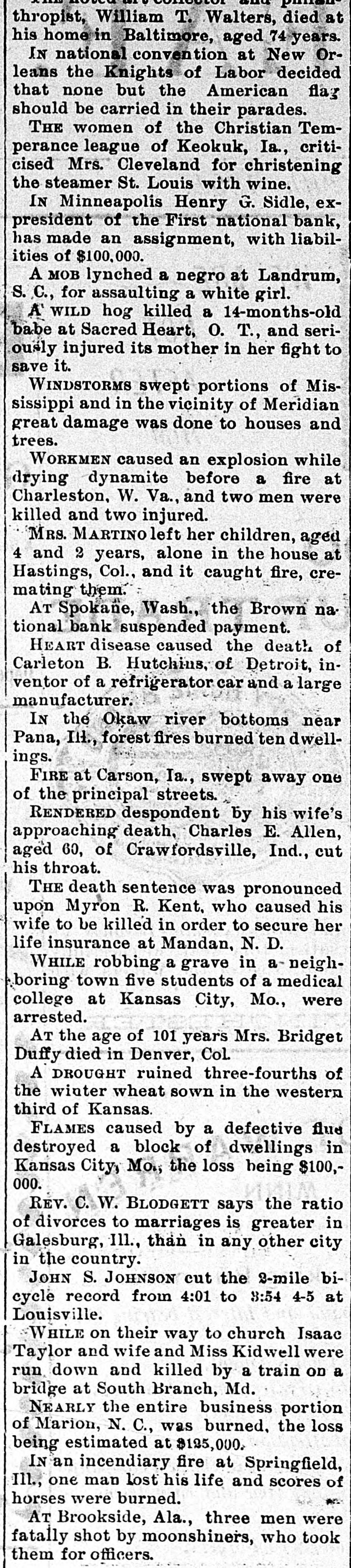 thropist, William T. Walters, died at his home in Baltimore, aged 74 years. IN national convention at New Orleans the Knights of Labor decided that none but the American flag should be carried in their parades. THE women of the Christian Temperance league of Keokuk, Ia., criticised Mrs. Cleveland for christening the steamer St. Louis with wine. IN Minneapolis Henry G. Sidle, expresident of the First national bank, has made an assignment, with liabilities of $100,000. A MoB lynched a negro at Landrum, S. C., for assaulting a white girl. A' WILD hog killed a 14-months-old babe at Sacred Heart, O. T., and seriously injured its mother in her fight to save it. WINDSTORMS swept portions of Mississippi and in the vicinity of Meridian great damage was done to houses and trees. WORKMEN caused an explosion while drying dynamite before a fire at Charleston, W. Va., and two men were killed and two injured. MRS. MARTINO left her children, aged 4 and 2 years, alone in the house at Hastings, Col., and it caught fire, cremating them. AT Spokane, Wash. the Brown national bank suspended payment. HEART disease caused the death of Carleton B. Hutchins, of Detroit, inventor of a refrigerator car and a large manufacturer. IN the Okaw river bottoms near Pana, IH., forest fires burned ten dwellings. FIRE at Carson, Ia., swept away one of the principal streets. RENDERED despondent by his wife's approaching death, Charles E. Allen, aged 60, of Crawfordsville, Ind., cut his throat. THE death sentence was pronounced upon Myron R. Kent. who caused his wife to be killed in order to secure her life insurance at Mandan, N. D. WHILE robbing a grave in a- neighboring town five students of a medical college at Kansas City, Mo., were arrested. AT the age of 101 years Mrs. Bridget Duffy died in Denver, Col. A DROUGHT ruined three-fourths of the winter wheat sown in the western third of Kansas. FLAMES caused by a defective flue destroyed a block of dwellings in Kansas City, Mo., the loss being $100,000. REV. C. W. BLODGETT says the ratio of divorces to marriages is greater in Galesburg, Ill., than in any other city in the country. JOHN S. JOHNSON cut the 2-mile bicycle record from 4:01 to 3:54 4-5 at Louisville. WHILE on their way to church Isaac Taylor and wife and Miss Kidwell were run down and killed by a train on a bridge at South Branch, Md. NEARLY the entire business portion of Marion, N. C., was burned, the loss being estimated at $125,000. IN an incendiary fire at Springfield, Ill., one man lost his life and scores of horses were burned. il AT Brookside, Ala., three men were fatally shot by moonshiners, who took them for officers.