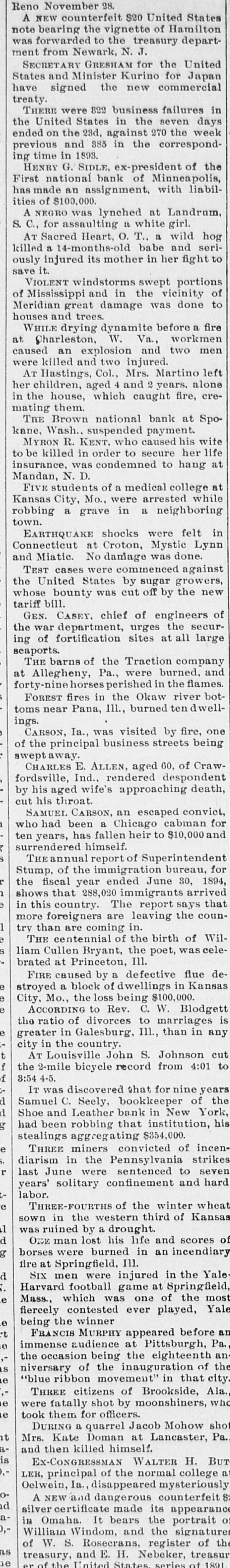 Reno November 28. A NEW counterfeit $20 United States note bearing the vignette of Hamilton was forwarded to the treasury department from Newark, N. J. SECRETARY GRESHAM for the United States and Minister Kurino for Japan have signed the new commercial treaty. THERE were 822 business failures in the United States in the seven days ended on the 23d, against 270 the week previous and 885 in the corresponding time in 1893. HENRY G. SIDLE, ex-president of the First national bank of Minneapolis, has made an assignment, with liabilities of $100,000. ANEGRO was lynched at Landrum, S. C., for assaulting a white girl. AT Sacred Heart, O. T., a wild hog killed a 14-months-old babe and seriously injured its mother in her fight to save it. VIOLENT windstorms swept portions of Mississippi and in the vicinity of Meridian great damage was done to houses and trees. WHILE drying dynamite before a fire at Charleston, W. Va., workmen caused an explosion and two men and two injured. Col., Mrs. her 4 2 years. were AT children, Hastings, killed aged and Martino alone left in the house, which caught fire, cremating them. THE Brown national bank at Spokane, Wash., suspended payment. MYRON R. KENT. who caused his wife to be killed in order to secure her life insurance, was condemned to hang at Mandan, N. D. FIVE students of a medical college at Kansas City, Mo., were arrested while robbing a grave in a neighboring town. EARTHQUAKE shocks were felt in Connecticut at Croton, Mystic Lynn and Miatic. No damage was done. TEST cases were commenced against the United States by sugar growers, whose bounty was cut off by the new tariff bill. GEN. CASEY, chief of engineers of the war department, urges the securing of fortification sites at all large seaports. THE barns of the Traction company at Allegheny, Pa., were burned, and forty-nine horses perished in the flames. FOREST fires in the Okaw river bottoms near Pana, III., burned ten dwellings. CARSON, Ia., was visited by fire, one of the principal business streets being swept away. CHARLES E. ALLEN, aged 60, of Crawfordsville, Ind., rendered despondent by his aged wife's approaching death, cut his throat. SAMUEL CARSON, an escaped convict, who had been a Chicago cabman for ten years, has fallen heir to $10,000 and surrendered himself. Theannual report of Superintendent Stump, of the immigration bureau, for the fiscal year ended June 30, 1894, shows that 288,020 immigrants arrived in this country. The report says that more foreigners are leaving the country than are coming in. THE centennial of the birth of William Cullen Bryant, the poet, was celebrated at Princeton, Ill. FIRE caused by a defective flue dee stroyed a block of dwellings in Kansas e City. Mo., the loss being $100,000. ACCORDING to Rev. C. W. Blodgett the ratio of divorces to marriages is greater in Galesburg, Ill., than in any city in the country. t AT Louisville John S. Johnson cut f the 2-mile bicycle record from 4:01 to 8:54 4-5. f IT was discovered that for nine years d Samuel C. Seely, bookkeeper of the d Shoe and Leather bank in New York, had been robbing that institution, his stealings aggregating $354,000. THREE miners convicted of incene diarism in the Pennsylvania strikes r last June were sentenced to seven years' solitary confinement and hard labor. THREE-FOURTHS of the winter wheat e sown in the western third of Kansas 1 was ruined by a drought. d ONE man lost his life and scores of borses were burned in an incendiary g fire at Springfield, Ill. d Six men were injured in the Yale Harvard football game at Springfield, e Mass., which was one of the most fiercely contested ever played, Yale e being the winner t FRANCIS MURPHY appeared before an le immense audience at Pittsburgh, Pa. the occasion being the eighteenth is niversary of the inauguration of the "blue ribbon movement" in that city. e THREE citizens of Brookside, Ala. e were fatally shot by moonshiners, who e took them for officers. DURING a quarrel Jacob Mohow shot t Mrs. Kate Doman at Lancaster, Pa. aand then killed himself. is Ex-CONGRESSMAN WALTER H. BUT LER, principal of the normal college Oelwein, Ia., disappeared mysteriously oA NEW and dangerous counterfeit d silver certificate made its appearance ain Omaha. It bears the portrait , William Windom, and the signatures of W. S. Rosecrans, register of the as treasury, and E. H. Nebeker, treasur e United States series.of 1891