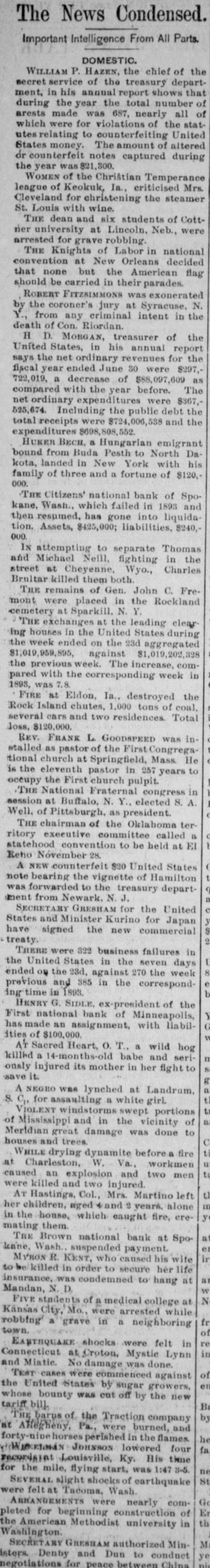 The News Condensed. Important Intelligence From All Parts. DOMESTIC. WILLIAM P. HAZEN, the chief of the secret service of the treasury department, in his annual report shows that during the year the total number of arests made was 687, nearly all of which were for violations of the statutes relating to counterfeiting United States money. The amount of altered or counterfeit notes captured during the year was $21,300. WOMEN of the Christian Temperance league of Keokuk, Ia., criticised Mrs. Cleveland for christening the steamer St. Louis with wine. THE dean and six students of Cottner university at Lincoln. Neb., were arrested for grave robbing. THE Knights of Labor in national convention at New Orleans decided that none but the American flag should be carried in their parades. ROBERT FITZSIMMONS was exonerated by the coroner's jury at Syracuse, N. Y., from any criminal intent in the death of Con. Riordan. H D. MORGAN, treasurer of the United States, in his annual report says the net ordinary revenues for the fiscal year ended June 30 were $297,722,019, a decrease of $88,097,609 as compared with the year before. The net ordinary expenditures were $367,525,674. Including the public debt the total receipts were $724,006,538 and the expenditures $698,808,552. HUKER BECH. a Hungarian emigrant bound from Buda Pesth to North Dakota, landed in New York with his family of three and a fortune of $120,000. THE Citizens' national bank of Spokane, Wash., which failed in 1893 and then resumed, has gone into liquidation. Assets, $425,000; liabilities, $240,000. IN attempting to separate Thomas and Michael Neill, fighting in the street at Cheyenne, Wyo., Charles Brultar killed them both. THE remains of Gen. John C. Fremont were placed in the Rockland cemetery at Sparkill. N. Y. THE exchanges at the leading clear. ing houses in the United States during the week ended on the 23d aggregated $1,019,959,895, against $1,019,202,328 the previous week. The increase, compared with the corresponding week in 1893, was 7.8. FIRE at Eldon, Ia., destroyed the Rock Island chutes, 1,000 tons of coal, several cars and two residences. Total loss, $120,000. REV. FRANK L. GOODSPEED was installed as pastor of the 'irst Congregational church at Springfield, Mass. He is the eleventh pastor in 257 years to occupy the First church pulpit. THE National Fraternal congress in session at Buffalo, N. Y., elected S. A. Well. of Pittsburgh, as president. THE chairman of the Oklahoma territory executive committee called a statehood convention to be held at El Reho November 28. A NEW counterfeit $20 United States note bearing the vignette of Hamilton was forwarded to the treasury department from Newark. N. J. SECRETARY GRESHAM for the United States and Minister Kurino for Japan have signed the new commercial treaty. THERE were 322 business failures in I the United States in the seven days ended on the 23d, against 270 the week previous and 385 in the correspondb ing time in 1893. HENRY G. SIDLE. ex-president of the y First national bank of Minneapolis, G has made an assignment, with liabilities of $100,000. AT Sacred Heart, O. T., a wild hog II killed a 14-months-old babe and seriS onsly injured its mother in her fight to save it. g a A NEGRO was lynched at Landrum. t S. C,, for assaulting a white girl. ti VIOLENT windstorms swept portions a of Mississippi and in the vicinity of Meridian great damage was done to C houses and trees. ti WHILE drying dynamite before fire at u Charleston, W, Va., workmen to caused an explosion and two men were killed and two injured. t.l AT Hastings, Col., Mrs. Martino left m her children, aged 4and 2 years, alone y in the house, which eaught fire, eremating them. a THE Brown national bank at Spoknne, Wash. suspended payment. in MYRON R. KENT, who caused his wife to killed in order to secure her life at insurance, was condemned to hang at W Mandan, N. D. N FIVE students of a medical college at Kansas City, Mo., were arrested while fr robbing a grave in a neighboring town. of re EARTHQUAKE shocks were felt in in Connecticut at Croton, Mystic Lynn and Miatic. No damage was done. of TEST cases were commenced against en the United States by sugar growers,
