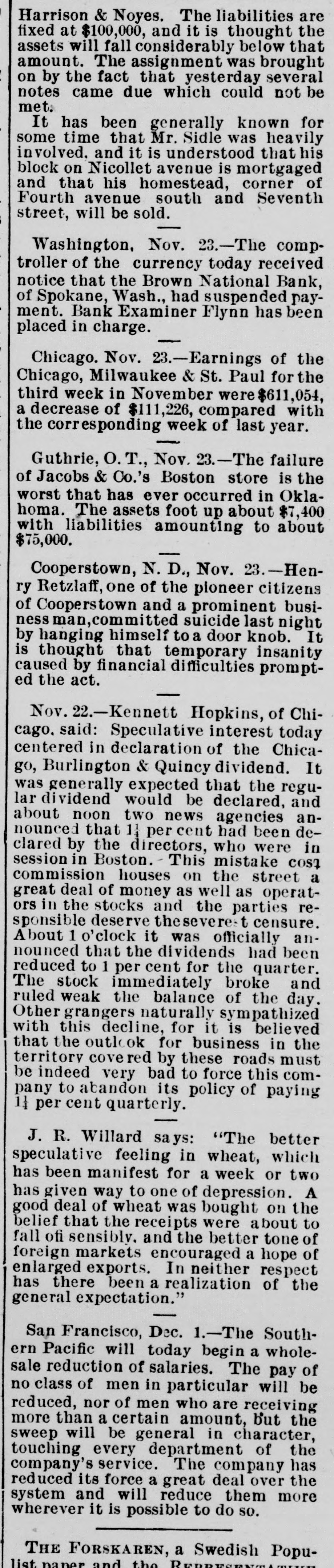 Harrison & Noyes. The liabilities are fixed at $100,000, and it is thought the assets will fall considerably below that amount. The assignment was brought on by the fact that yesterday several notes came due which could not be met. It has been generally known for some time that Mr. Sidle was heavily involved. and it is understood that his block on Nicollet avenue is mortgaged and that his homestead, corner of Fourth avenue south and Seventh street, will be sold. Washington, Nov. 23.-The comptroller of the currency today received notice that the Brown National Bank, of Spokane, Wash., had suspended payment. Bank Examiner Flynn has been placed in charge. Chicago. Nov. 23.-Earnings of the Chicago, Milwaukee & St. Paul for the third week in November were $611,054, a decrease of $111,226, compared with the corresponding week of last year. 1 Guthrie, O.T., Nov. 23.-The failure of Jacobs & Co.'s Boston store is the worst that has ever occurred in Oklahoma. The assets foot up about $7,400 with liabilities amounting to about $75,000. Cooperstown, N. D., Nov. 23.-Henry Retzlaff, one of the pioneer citizens of Cooperstown and a prominent busicommitted suicide last night by hanging himself to a door knob. It is thought that temporary insanity caused by financial difficulties prompted the act. Nov. 22.-Kennett Hopkins, of Chicago, said: Speculative interest today centered in declaration of the Chicago, Burlington & Quincy dividend. It was generally expected that the regular dividend would be declared, and about noon two news agencies announced that 11 per cent had been declared by the directors, who were in session in Boston. This mistake cost commission houses on the street a great deal of money as well as operators in the stocks and the parties responsible deserve theseveres censure. About 1 o'clock it was officially announced that the dividends had been reduced to 1 per cent for the quarter. The stock immediately broke and ruled weak the balance of the day. Other grangers naturally sympathized with this decline, for it is believed that the outlook for business in the territory cove by these roads must be indeed very bad to force this company to abandon its policy of paying 11 per cent quarterly. J. R. Willard says: "The better speculative feeling in wheat, which has been manifest for a week or two has given way to one of depression. A good deal of wheat was bought on the belief that the receipts were about to fall ofi sensibly. and the better tone of foreign markets encouraged a hope of enlarged exports. In neither respect has there been a realization of the general expectation." San Francisco, Dec. 1.-The Southern Pacific will today begin a wholesale reduction of salaries. The pay of no class of men in particular will be reduced, nor of men who are receiving more than a certain amount, but the sweep will be general in character, touching every department of the company's service. The company has reduced its force a great deal over the system and will reduce them more wherever it is possible to do so. THE FORSKAREN, a Swedish Populist paper and the REPRESENTA