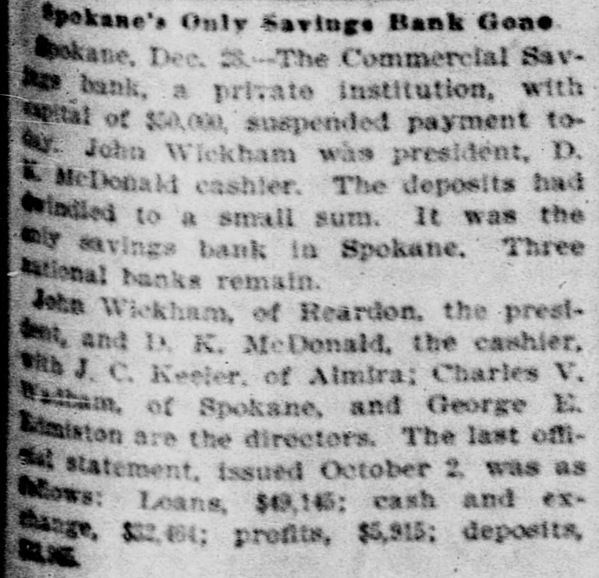 Spokane's Only Savings Bank Gone bokane, Dec. 28-The Commercial Savbank, a private institution, with expital of $50,000, suspended payment tow. is y. John Wickham was president, D. McDonald cashier. The deposits had indied to a small sum. It was the only savings bank in Spokane, Three national banks remain. John Wickham, of Reardon. the prestent, and D. K. McDonald, the cashier, with J. C. Keeler, of Almira: Charles V. Washin, of Spokane, and George E. Edmiston are the directors. The last offistatement, issued October 2 was as Mows: Loans, $49,145: cash and exchange, $32,464; profits, $5,915; deposits,