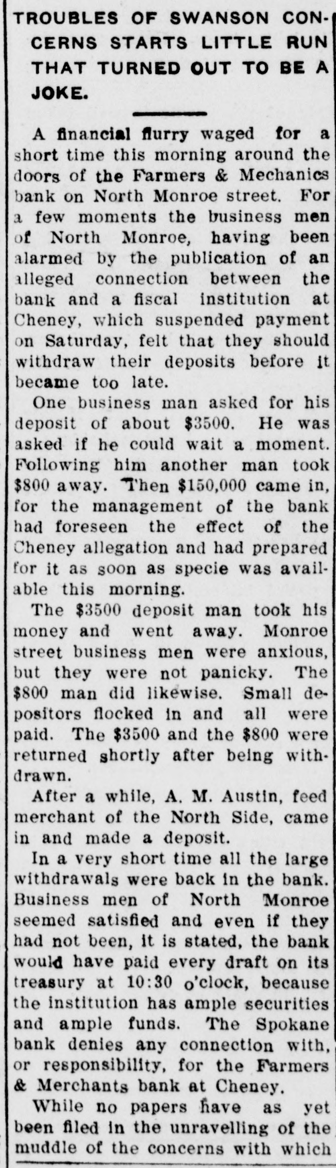 TROUBLES OF SWANSON CONCERNS STARTS LITTLE RUN THAT TURNED OUT TO BE A JOKE. A financial flurry waged for a short time this morning around the doors of the Farmers & Mechanics bank on North Monroe street. For a few moments the business men of North Monroe, having been alarmed by the publication of an alleged connection between the bank and a fiscal institution at Cheney, which suspended payment on Saturday, felt that they should withdraw their deposits before it became too late. One business man asked for his deposit of about $3500. He was asked if he could wait a moment. Following him another man took $800 away. Then $150,000 came in, for the management of the bank had foreseen the effect of the Cheney allegation and had prepared for it as soon as specie was available this morning. The $3500 deposit man took his money and went away. Monroe street business men were anxious, but they were not panicky. The $800 man did likewise. Small depositors flocked in and all were paid. The $3500 and the $800 were returned shortly after being withdrawn. After a while, A. M. Austin, feed merchant of the North Side, came in and made a deposit. In a very short time all the large withdrawals were back in the bank. Business men of North Monroe seemed satisfied and even if they had not been, it is stated, the bank would have paid every draft on its treasury at 10:30 o'clock, because the institution has ample securities and ample funds. The Spokane bank denies any connection with, or responsibility, for the Farmers & Merchants bank at Cheney. While no papers have as yet been filed in the unravelling of the muddle of the concerns with which