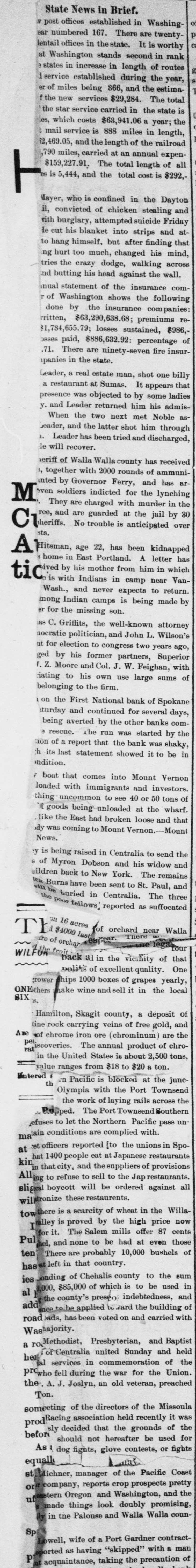 Hitsman, age 22, has been kidnapped 3 home in East Portland. A letter has by his mother from him in which Me is with Indians in camp near Van-Wash., and never expects to return. mong Indian camps is being made by er for the missing son.