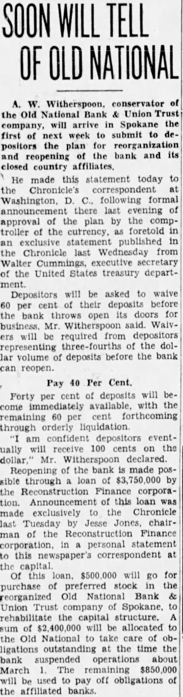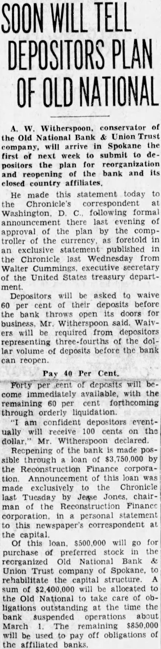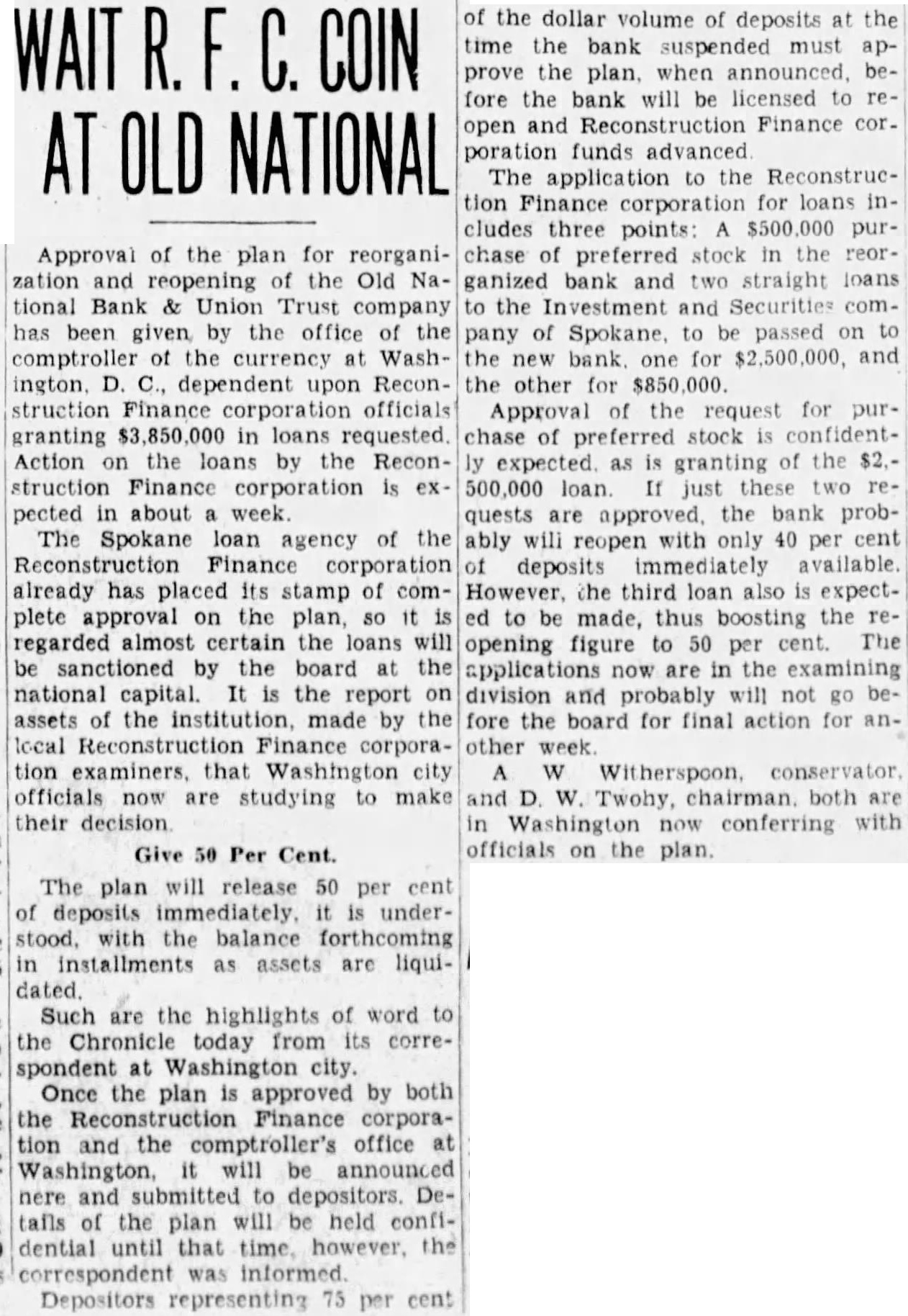 WAIT C. COIN AT OLD NATIONAL Approval of the plan for reorganization reopening of the Old National Bank & Union Trust company has been given by the office of the comptroller the currency at Washington. dependent upon Reconstruction Finance corporation officials granting $3,850,000 in loans requested Action on the loans by the Reconstruction Finance corporation is ex pected about week The Spokane loan agency of the Reconstruction Finance corporation already has placed its stamp of complete approval on the plan, so regarded the loans will be sanctioned by the board at the national It the report assets of the institution, made by the local Finance corporation examiners, that Washington city officials now are studying to make their decision Give 50 Per Cent. The plan will release 50 per cent of deposits immediately. it is understood. with the balance forthcoming in installments as assets are liquidated. Such are the highlights of word to the Chronicle today from its correspondent at Washington city. Once the plan is approved by both the Reconstruction Finance corporation and the comptroller's office at Washington, it will be announced nere and submitted to depositors Details of the plan will be held confidential until that time. however. the correspondent was informed Depositors representing 75 per cent of the dollar volume of deposits at the time the bank suspended must approve the plan, when announced, before the bank will be licensed to open and Reconstruction Finance cor. poration funds advanced The application to the Reconstruetion Finance corporation for loans includes three points: purchase preferred stock in the reorganized bank and two straight loans to the Investment and Securities company of Spokane, to be passed on to the one for and the other for Approval the request for purchase of preferred stock confidently expected as granting of the $2.500,000 loan. If just these two requests are approved. the bank probably will reopen only 40 per cent deposits immediately available. However, the third loan also expected to be made, thus boosting the reopening figure to 50 per cent. The applications now are in the examining division and will not go before the board for final action for another and D. W. Twohy both are in Washington conferring with officials on the