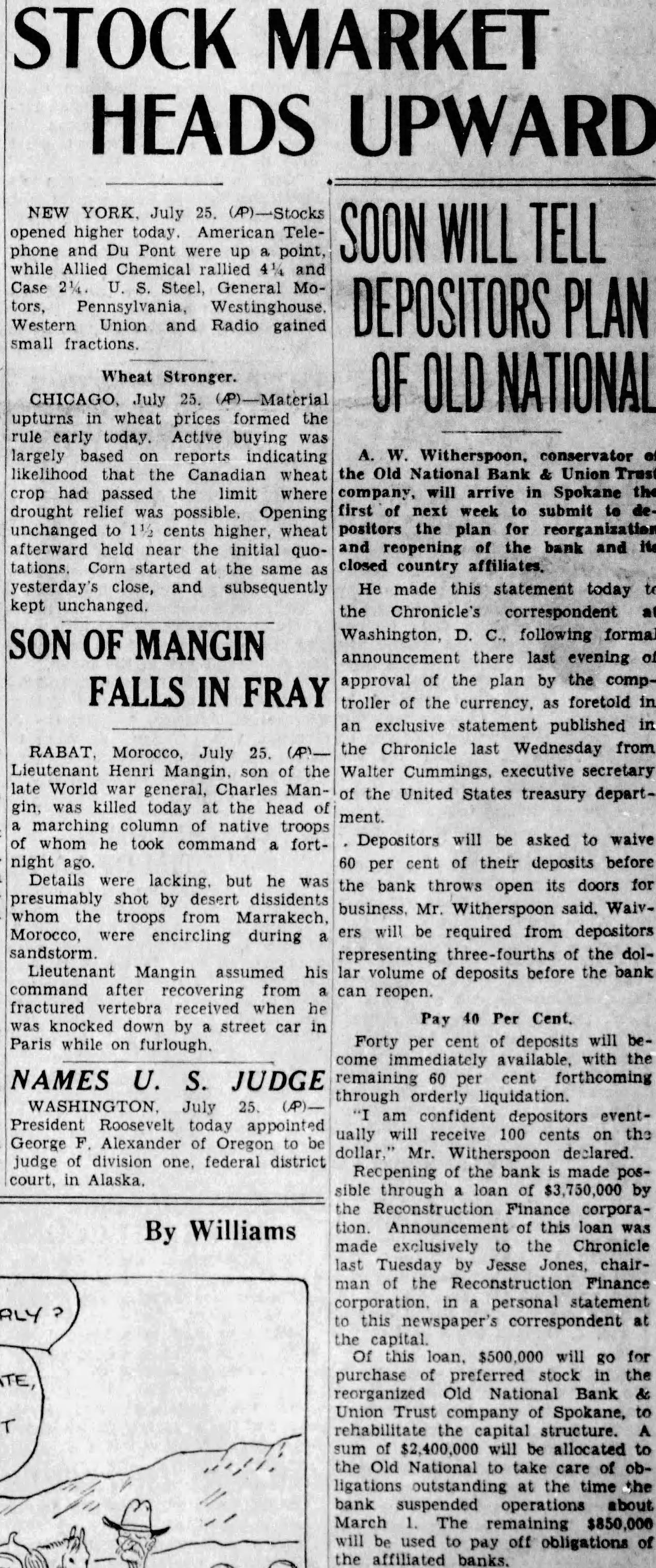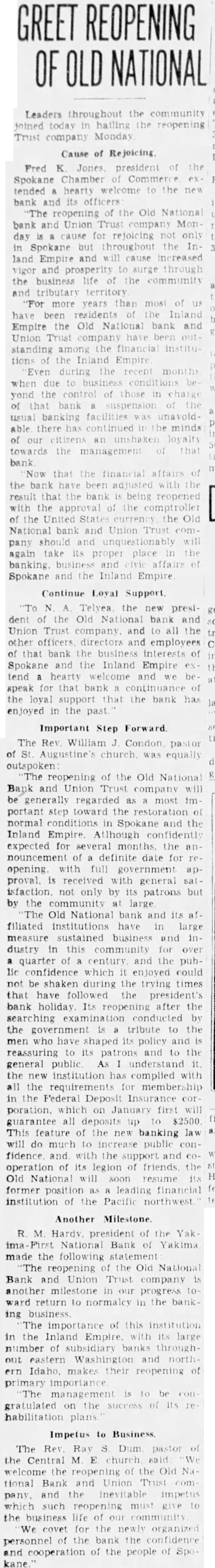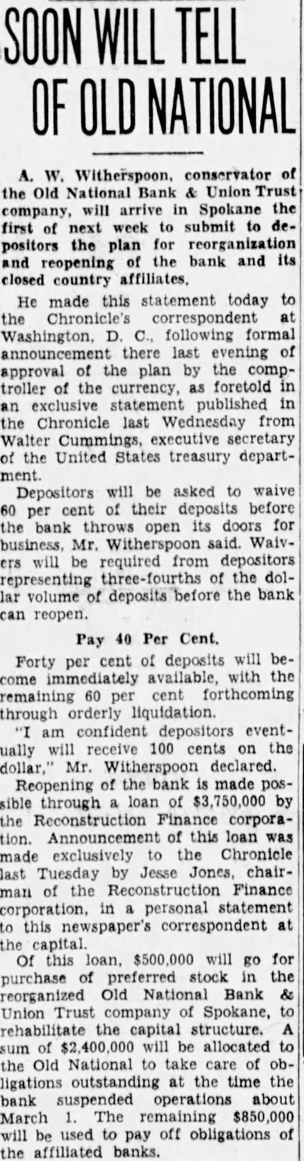 WAIT C. COIN AT OLD NATIONAL Approval of the plan for reorganization reopening of the Old National Bank & Union Trust company has been given by the office of the comptroller the currency at Washington. dependent upon Reconstruction Finance corporation officials granting $3,850,000 in loans requested Action on the loans by the Reconstruction Finance corporation is ex pected about week The Spokane loan agency of the Reconstruction Finance corporation already has placed its stamp of complete approval on the plan, so regarded the loans will be sanctioned by the board at the national It the report assets of the institution, made by the local Finance corporation examiners, that Washington city officials now are studying to make their decision Give 50 Per Cent. The plan will release 50 per cent of deposits immediately. it is understood. with the balance forthcoming in installments as assets are liquidated. Such are the highlights of word to the Chronicle today from its correspondent at Washington city. Once the plan is approved by both the Reconstruction Finance corporation and the comptroller's office at Washington, it will be announced nere and submitted to depositors Details of the plan will be held confidential until that time. however. the correspondent was informed Depositors representing 75 per cent of the dollar volume of deposits at the time the bank suspended must approve the plan, when announced, before the bank will be licensed to open and Reconstruction Finance cor. poration funds advanced The application to the Reconstruetion Finance corporation for loans includes three points: purchase preferred stock in the reorganized bank and two straight loans to the Investment and Securities company of Spokane, to be passed on to the one for and the other for Approval the request for purchase of preferred stock confidently expected as granting of the $2.500,000 loan. If just these two requests are approved. the bank probably will reopen only 40 per cent deposits immediately available. However, the third loan also expected to be made, thus boosting the reopening figure to 50 per cent. The applications now are in the examining division and will not go before the board for final action for another and D. W. Twohy both are in Washington conferring with officials on the