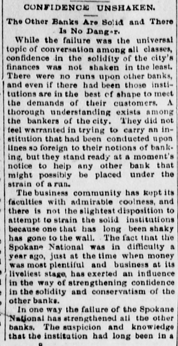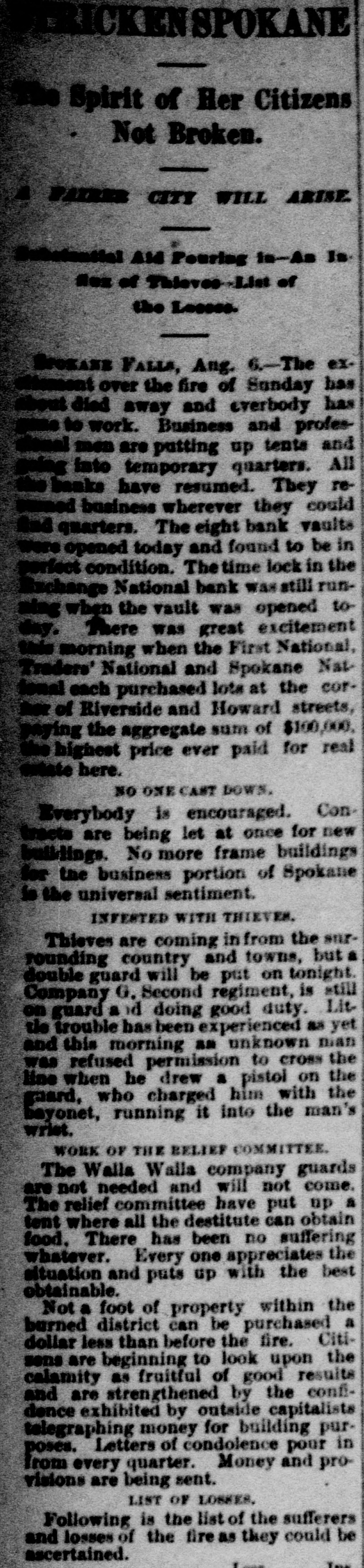 Spirit of Her Citizens Not Broken. PAIRER CITY WILL ARISE. Substantial ANd Pouring In-As Is. Rex of Thieves-List of the Lesses. Brokane FALLS, Aug. 6.-The exdifement over the fire of Sunday has about died away and everbody has to work. Business and profesdenal men are putting up tents and into temporary quarters. All a banks have resumed. They resurned business wherever they could And quarters. The eight bank vaults were opened today and found to be in perfect condition. The time lock in the Exchange National bank was still running when the vault was opened today. There was great excitement this morning when the First National, Traders' National and Spokane Natfonal each purchased lots at the corher of Riverside and Howard streets, paying the aggregate sum of $100,000, the highest price ever paid for real mate here. NO ONE CAST DOWN. Everybody is encouraged. Contracts are being let at once for new buildings. No more frame buildings for the business portion of Spokane is the universal sentiment. INFESTED WITH THIEVES. Thieves are coming in from the surrounding country and towns, but a double guard will be put on tonight. Company G. Second regiment, is still on guard a d doing good duty. Litthe trouble has been experienced as yet and this morning as unknown man was refused permission to cross the line when he drew a pistol on the guard, who charged him with the bayonet, running it into the man's wrist. WORK OF THE BELIEF COMMITTEE. The Walla Walla company guards are not needed and will not come. The relief committee have put up a tent where all the destitute can obtain food. There has been no suffering whatever. Every one appreciates the situation and puts up with the best obtainable. Not a foot of property within the burned district can be purchased a dollar less than before the fire. Citisens are beginning to look upon the calamity as fruitful of good results and are strengthened by the confidence exhibited by outside capitalists telegraphing money for building purposes. Letters of condolence pour in from every quarter. Money and provisions are being sent. LIST OF LOSSES. Following is the list of the sufferers and losses of the fire as they could be