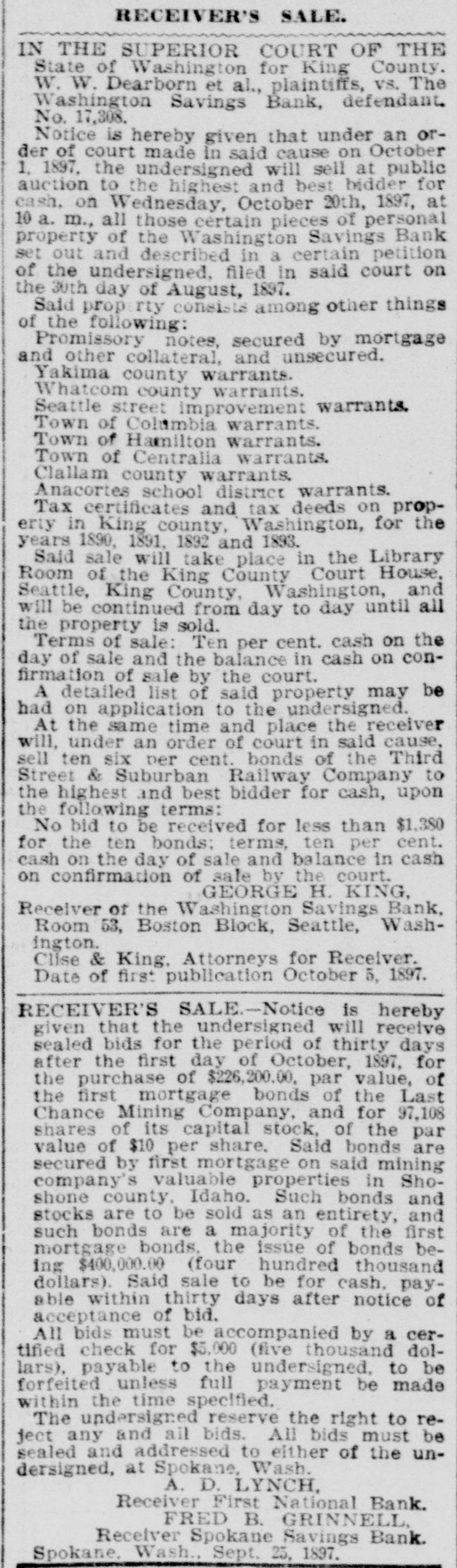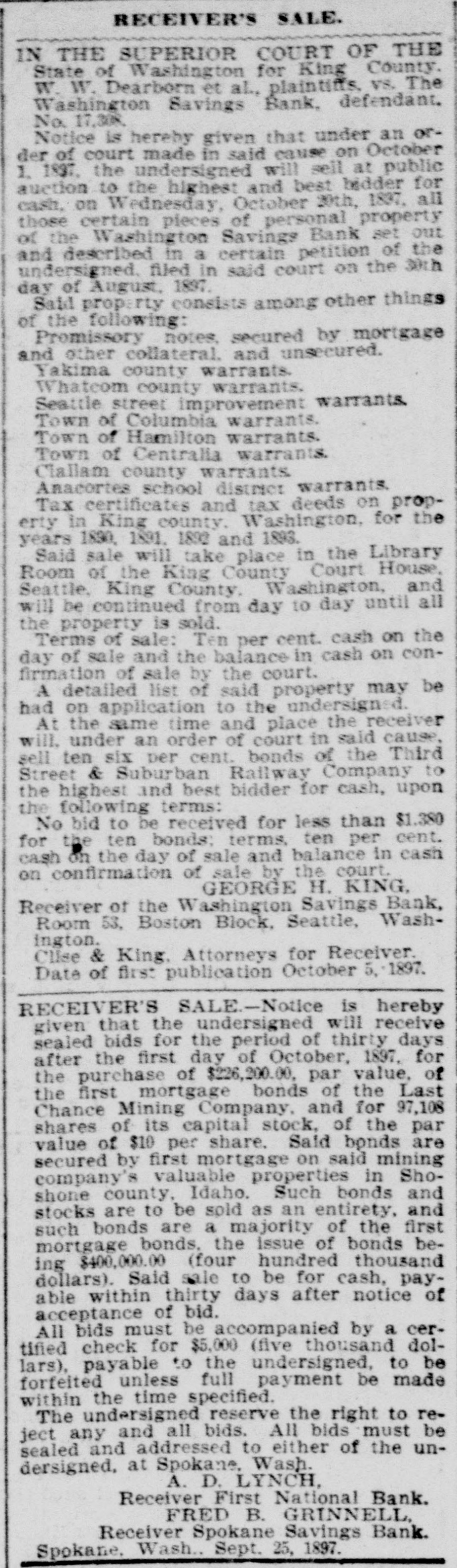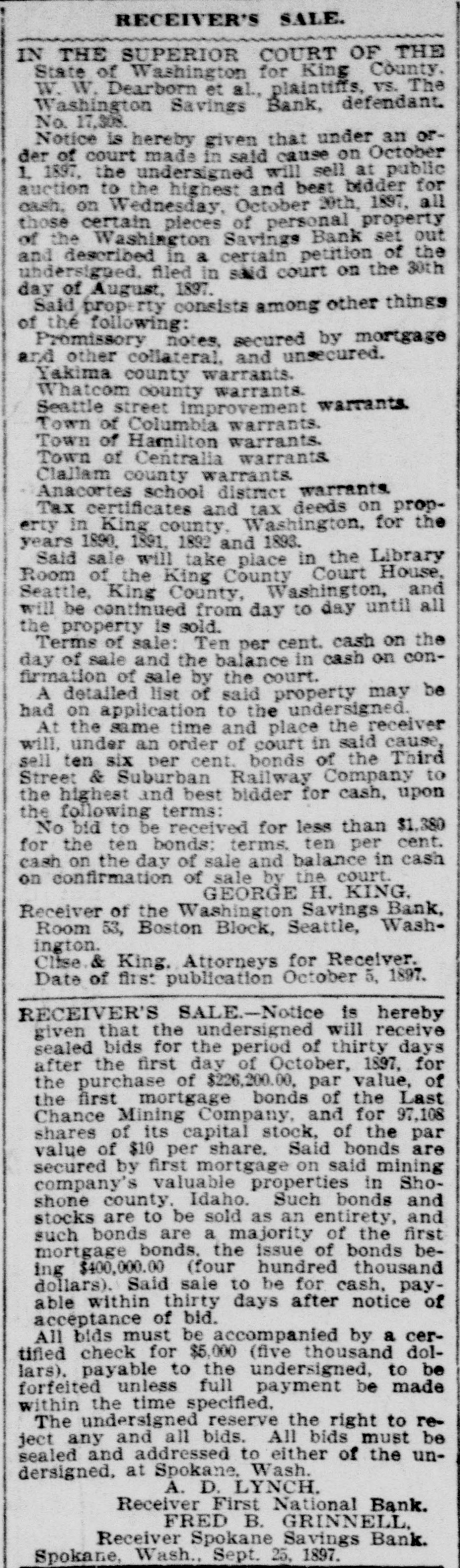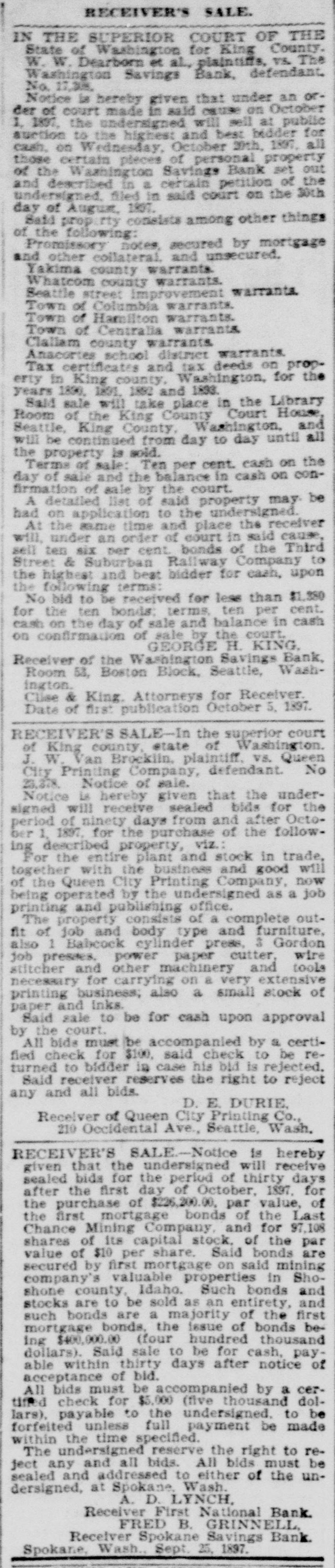 RECEIVER'S SALE. IN THE SUPERIOR COURT OF THE State of Washington for King County. W. W. Dearborn et al., plaintiffs, vs. The Washington Savings Bank, defendant. No. 17,308, Notice is hereby given that under an order of court made in said cause on October 1, 1897, the undersigned will sell at public suction to the highest and best bidder for cash, on Wednesday, October 20th, 1897, all those certain pieces of personal property of the Washington Savings Bank set out and described in a certain petition of the undersigned, filed in said court on the 30th day of August, 1807. Said prop rty consists among other things of the following: Promissory notes, secured by mortgage and other collateral. and unsecured. Yakima county warrants. Whatcom county warrants. Seattle street improvement warrants. Town of Columbia warrants. Town of Hamilton warrants. Town of Centralia warrants. Clallam county warrants. Anacortes school district warrants. Tax certificates and tax deeds on property in King county, Washington, for the years 1890, 1891. 1892 and 1833. Said sale will take place in the Library Room of the King County Court House, Beattle, King County, Washington, and will be continued from day to day until all the property is sold. Terms of sale: Ten per cent. cash on the day of sale and the balance in cash on confirmation of sale by the court. A detailed list of said property may be had on application to the undersigned. At the same time and place the receiver will, under an order of court in said cause, sell ten six per cent. bonds of the Third Street & Suburban Railway Company to the highest and best bidder for cash, upon the following terms: No bid to be received for less than $1,380 for the ten bonds: terms, ten per cent. cash on the day of sale and balance in cash on confirmation of sale by the court. GEORGE H. KING. Receiver of the Washington Savings Bank, Room 53, Boston Block, Seattle, Washington. Clise & King. Attorneys for Receiver. Date of first publication October 5, 1897. RECEIVER'S SALE-In the superior court of King county, state of Washington. J. W. Van Brocklin, plaintiff, vs. Queen City Printing Company, defendant. No 23,378. Notice of sale. Notice is hereby given that the undersigned will receive sealed bids for the period of ninety days from and after October 1, 1897, for the purchase of the following described property, viz.: For the entire plant and stock in trade, together with the business and good will of the Queen City Printing Company, now being operated by the undersigned as a job printing and publishing office. The property consists of a complete outfit of job and body type and furniture, also 1 Babcock cylinder press, 3 Gordon job preses. power paper cutter, wire stitcher and other machinery and tools necessary for carrying on a very extensive printing business; also a small stock of paper and inks. Said sale to be for cash upon approval by the court. All bids must be accompanied by a certified check for $100, said check to be returned to bidder in case his bid is rejected. Said receiver reserves the right to reject any and all bids. D. E. DURIE, Receiver of Queen City Printing Co., 210 Occidental Ave., Seattle, Wash. RECEIVER'S SALE-Notice is hereby given that the undersigned will receive sealed bids for the period of thirty days after the first day of October, 1897, for the purchase of $226,200.00, par value, of the first mortgage bonds of the Last Chance Mining Company, and for 97,108 shares of its capital stock, of the par value of $10 per share. Said bonds are secured by first mortgage on said mining company's valuable properties in Shoshone county, Idaho. Such bonds and stocks are to be sold as an entirety, and such bonds are a majority of the first mortgage bonds, the issue of bonds being $400,000.00 (four hundred thousand dollars). Said sale to be for cash, payable within thirty days after notice of acceptance of bid. All bids must be accompanied by a certimed check for $5,000 (five thousand dollars). payable to the undersigned. to be forfeited unless full payment be made within the time specified. The undersigned reserve the right to reject any and all bids. All bids must be sealed and addressed to either of the undersigned, at Spokane Wash. A. D. LYNCH, Receiver First National Bank. FRED B. GRINNELL Receiver Spokane Savings Bank. Spokane, Wash., Sept. 25, 1897.