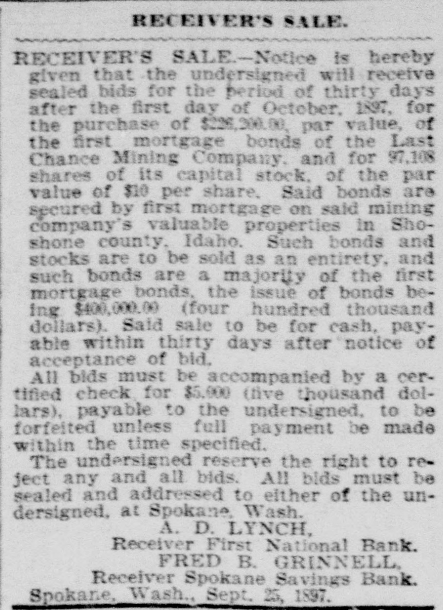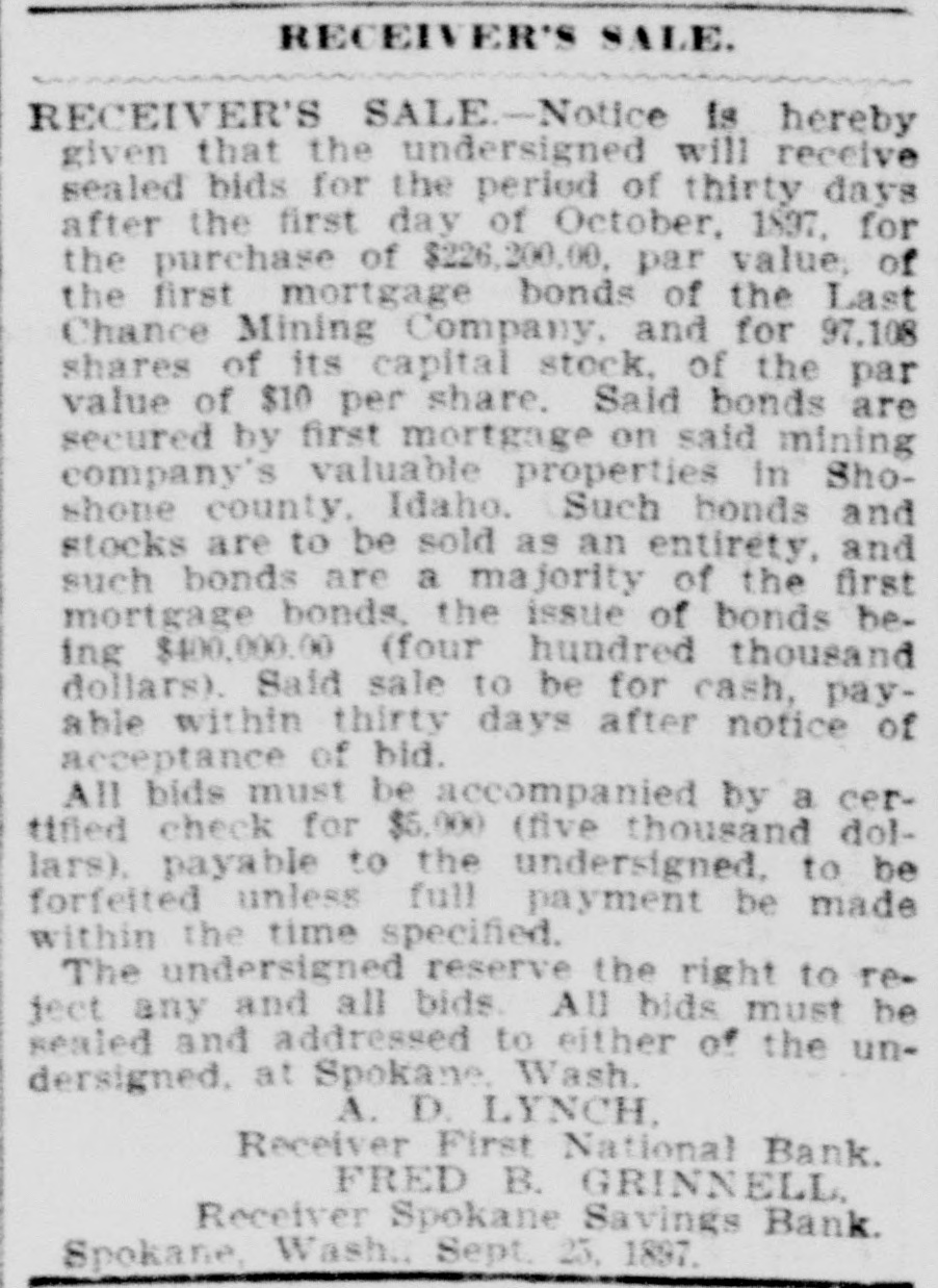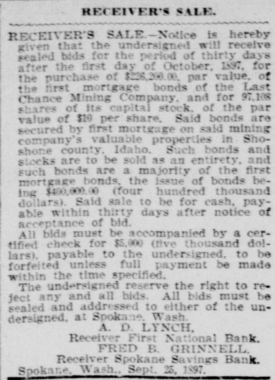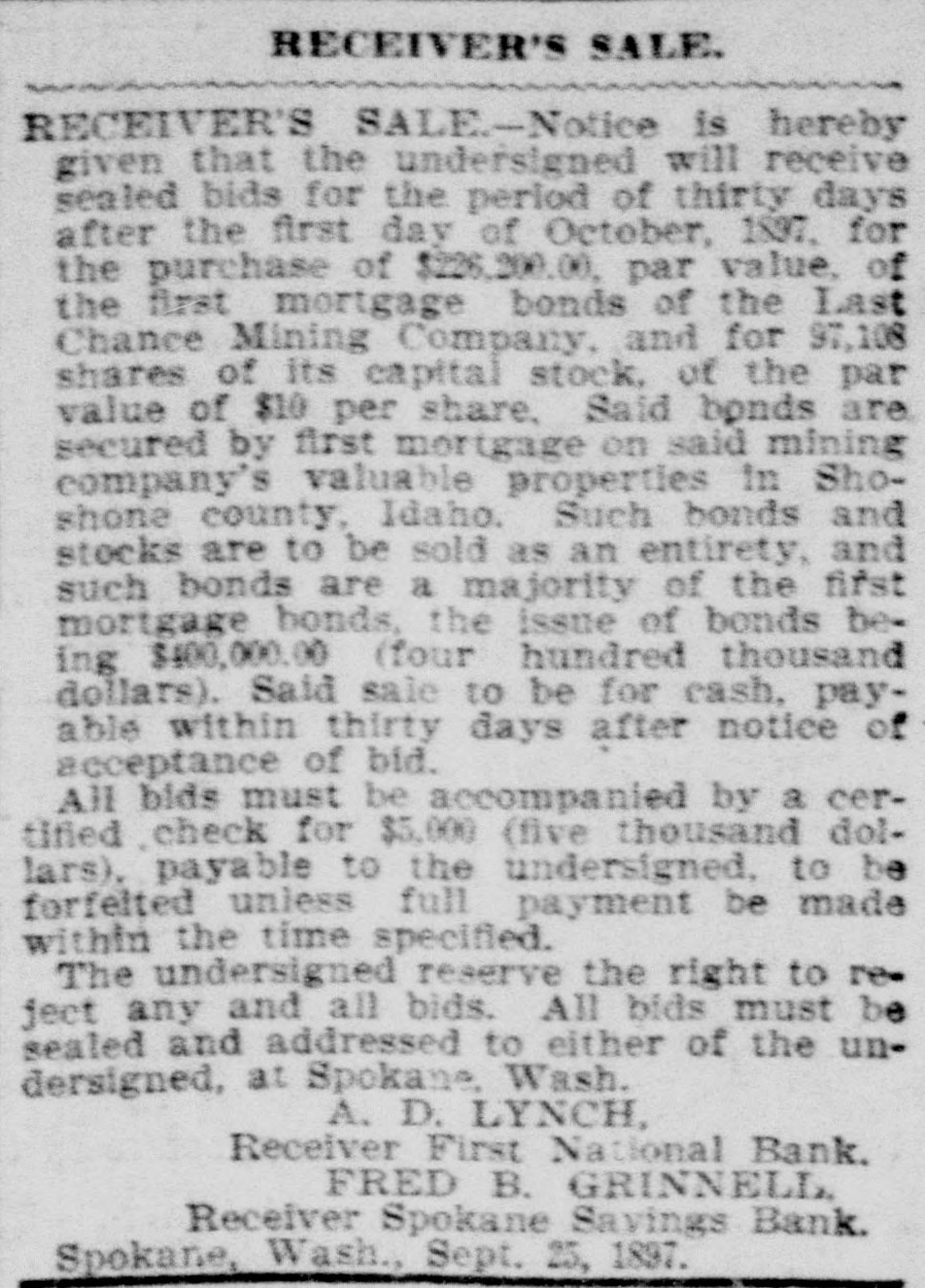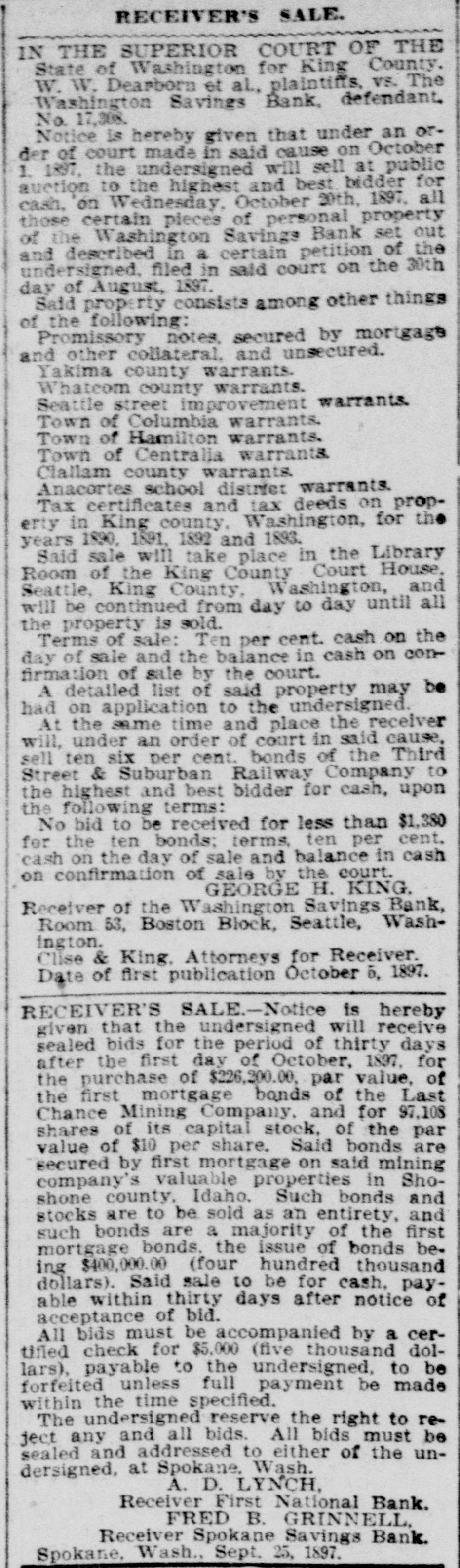 RECEIVER'S SALE. IN THE SUPERIOR COURT OF THE State of Washington for King County. W. W. Dearborn et al., plaintiffs, vs. The Washington Savings Bank, defendant. No. 17,308, Notice is hereby given that under an order of court made in said cause on October 1, 1897, the undersigned will sell at public suction to the highest and best bidder for cash, on Wednesday, October 20th, 1897, all those certain pieces of personal property of the Washington Savings Bank set out and described in a certain petition of the undersigned, filed in said court on the 30th day of August, 1807. Said prop rty consists among other things of the following: Promissory notes, secured by mortgage and other collateral. and unsecured. Yakima county warrants. Whatcom county warrants. Seattle street improvement warrants. Town of Columbia warrants. Town of Hamilton warrants. Town of Centralia warrants. Clallam county warrants. Anacortes school district warrants. Tax certificates and tax deeds on property in King county, Washington, for the years 1890, 1891. 1892 and 1833. Said sale will take place in the Library Room of the King County Court House, Beattle, King County, Washington, and will be continued from day to day until all the property is sold. Terms of sale: Ten per cent. cash on the day of sale and the balance in cash on confirmation of sale by the court. A detailed list of said property may be had on application to the undersigned. At the same time and place the receiver will, under an order of court in said cause, sell ten six per cent. bonds of the Third Street & Suburban Railway Company to the highest and best bidder for cash, upon the following terms: No bid to be received for less than $1,380 for the ten bonds: terms, ten per cent. cash on the day of sale and balance in cash on confirmation of sale by the court. GEORGE H. KING. Receiver of the Washington Savings Bank, Room 53, Boston Block, Seattle, Washington. Clise & King. Attorneys for Receiver. Date of first publication October 5, 1897. RECEIVER'S SALE-In the superior court of King county, state of Washington. J. W. Van Brocklin, plaintiff, vs. Queen City Printing Company, defendant. No 23,378. Notice of sale. Notice is hereby given that the undersigned will receive sealed bids for the period of ninety days from and after October 1, 1897, for the purchase of the following described property, viz.: For the entire plant and stock in trade, together with the business and good will of the Queen City Printing Company, now being operated by the undersigned as a job printing and publishing office. The property consists of a complete outfit of job and body type and furniture, also 1 Babcock cylinder press, 3 Gordon job preses. power paper cutter, wire stitcher and other machinery and tools necessary for carrying on a very extensive printing business; also a small stock of paper and inks. Said sale to be for cash upon approval by the court. All bids must be accompanied by a certified check for $100, said check to be returned to bidder in case his bid is rejected. Said receiver reserves the right to reject any and all bids. D. E. DURIE, Receiver of Queen City Printing Co., 210 Occidental Ave., Seattle, Wash. RECEIVER'S SALE-Notice is hereby given that the undersigned will receive sealed bids for the period of thirty days after the first day of October, 1897, for the purchase of $226,200.00, par value, of the first mortgage bonds of the Last Chance Mining Company, and for 97,108 shares of its capital stock, of the par value of $10 per share. Said bonds are secured by first mortgage on said mining company's valuable properties in Shoshone county, Idaho. Such bonds and stocks are to be sold as an entirety, and such bonds are a majority of the first mortgage bonds, the issue of bonds being $400,000.00 (four hundred thousand dollars). Said sale to be for cash, payable within thirty days after notice of acceptance of bid. All bids must be accompanied by a certimed check for $5,000 (five thousand dollars). payable to the undersigned. to be forfeited unless full payment be made within the time specified. The undersigned reserve the right to reject any and all bids. All bids must be sealed and addressed to either of the undersigned, at Spokane Wash. A. D. LYNCH, Receiver First National Bank. FRED B. GRINNELL Receiver Spokane Savings Bank. Spokane, Wash., Sept. 25, 1897.