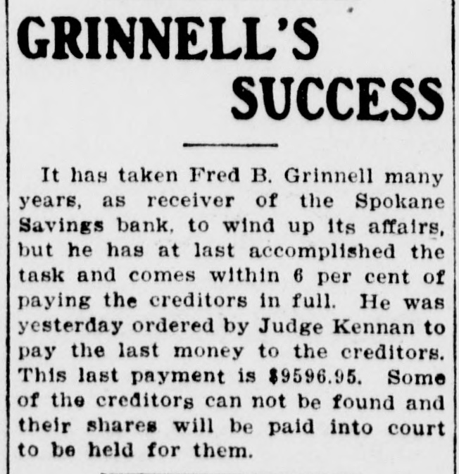 GRINNELL'S SUCCESS It has taken Fred B. Grinnell many years, as receiver of the Spokane Savings bank, to wind up its affairs, but he has at last accomplished the task and comes within 6 per cent of paying the creditors in full. He was yesterday ordered by Judge Kennan to pay the last money to the creditors. This last payment is $9596.95. Some of the creditors can not be found and their shares will be paid into court to be held for them.