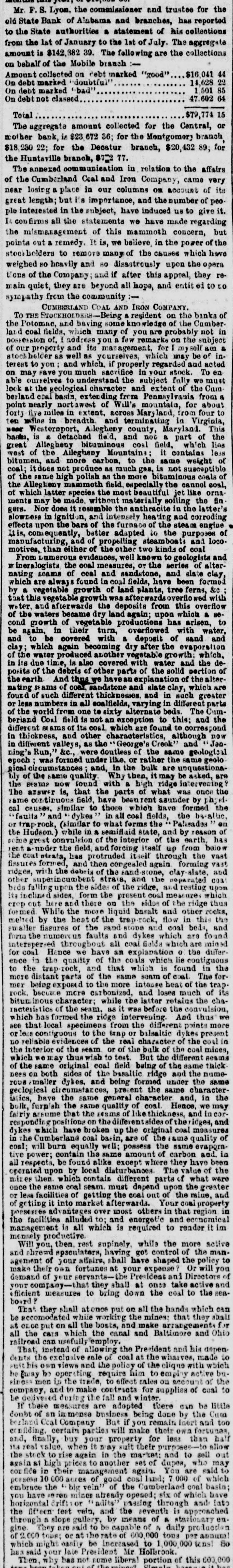 Mr. F. S. Lyon, the commissioner and trustee for the old State Bank of Alabama and branches, has reported to the State authorities a statement of his collections from the 1st of January to the lat of July. The aggregate amount is $142,382 39. The following are the collections on behalf of the Mobile branch:- Amount collected on debt marked "good"....$16,041 44 On debt marked "doubtful" 14,628 22 On debt marked "bad" 1 501 85 On debt not classed 47.602 64 Total $79,774 15 The aggregate amount collected for the Central, or mother bank, is $23,672 36; for the Montgomery branch $18,280 22; for the Decatur branch, $20,432 89; for the Huntsville branch, $72 77. The annexed communication in relation to the affairs of the Cumberland Coal and Iron Company, came very near losing a place in our columns om account of its great length; but i's importance, and the number of peo- ple interested in the subject, have induced us to give it. Is confirms all the statements we have made regarding the mismanagement of this mammoth concern, but points out a remedy. It is, we believe, in the power of the stockholders to remove many of the causes which have weighed so heavily and so disastrously upon the opera- tions of the Company; and if after this appeal, they re- main quiet, they are beyond all hope, and entit ed to to sympathy from the community:- # CUMBERLAND COAL AND IRON COMPANY. TO THE STOCKHOLDERS-Being a resident on the banks of the Potomac, and baving some knowledge of the Cumber- land coal fields, which many of you are probably not in possession of, I address you a few remarks on the subject of our property and its management, for I myself am a stockholder as well as yourselves, which may be of in- terest to you; and which, if properly regarded and acted on may save you much sacrifice in your stock. To en- able ourselves to understand the subject fully we must look at the geological character and extent of the Cun- berland coal basin, extending from Pennsylvania from a point nearly northwest of Will's mountain, for about forty five miles in extent, across Maryland, from four to ten miles in breadth, and terminating in Virginia, near Westernport, Allegheny county, Maryland. This basin, is a detached field, and not a part of the great Allegheny bituminous coal field, which lies west of the Allegheny Mountains; it contains less bitumen, and more carbon, to the same weight of coal; it does not produce as much gas, is not susceptible of the same high polish as the more bituminous coals of the Allegheny mammoth field, especially the cannel coal, of which latter species the most beautiful jet like orna- ments may be made, without materially soiling the fin- gers. Nor does it resemble the anthracite in the latter's slowness in ignition, and intensely heating and corroding effects upon the bars of the furnace of the steam engine It is, consequently, better adapted to the purposes of manufacturing, and of propelling steamboats and loco- motives, than either of the other two kinds of coal From numerous evidences, well known to geologists and mineralogists, the coal measures, or the series of alter- nating seams of coal and sandstone, and slate clay, which are always found in coal fields, have been formed by a vegetable growth of land plants, tree ferns, &c; that this vegetable growth was afterwards overflowed with water, and afterwards the deposits from this overflow of the waters became dry land again; upon which a se- cond growth of vegetable productions has arisen, to be again, in their turn, overflowed with water, and to be covered with a deposit of sand and clay; which again becoming dry after the evaporation of the water produced another vegetable growth; which, in its due time, is also covered with water and the de- posits of the debris of other parts of the solid portion of the earth And thus we have an explanation of the alter- nating seams of coal, sandstone and slate clay, which are found of such different thicknesses, and in such greater or less numbers in all coalfields, varying in different parts of the world from one to sixty alternate beds. The Cum- berland Coal field is not an exception to this; and the different seams of its coal, which are found to correspond in thickness, and other characteristics, although now in different valleys, as the "George's Creek" and "Jan- ning's Run," &c., &c., were doubtless of the same geological epoch; was formed under like, or rather the same geolo- gical circumstances; and, in the bulk are unquestiona- bly of the same quality. Why then, it may be asked, are the seams now found with a high ridge intervening? The answer is, that the parts of what was once the same continuous field, have been rent asunder by physi- cal causes, similar to those which have formed the "faults" and "dykes" in all coal fields, the basaltic, or trap-rock, (similar to what forms the "Palisades" on the Hudson,) while in a semifluid state, and by reason of some great convulsion of the interior of the earth, has rent asunder the field, and forcing itself up from below the coal strata, has protruded itself through the vast fissures formed, and then congealed again forming vast ridges, with the debris of the sand-stone, clay-slate, and other superincumbent strata, and the separated coal beds falling upon the sides of the ridge, and resting upon its inclined sides, form the present coal measures which crop out here and there on the sides of the ridge thus formed. While the more liquid basalt and other rocks, melted by the heat of the trap-rock, flow in this the smaller fissures of the sand stone and coal beds, and form the numerous faults and dykes which are found interspersed throughout all coal fields which are mined for coal Hence we have an explanation of the differ- ence in the quality of the coals which lie contiguous to the trap-rock, and that which is found in the more distant parts of the same seam of coal. The for- mer being exposed to the more intense heat of the trap- rock, beco
