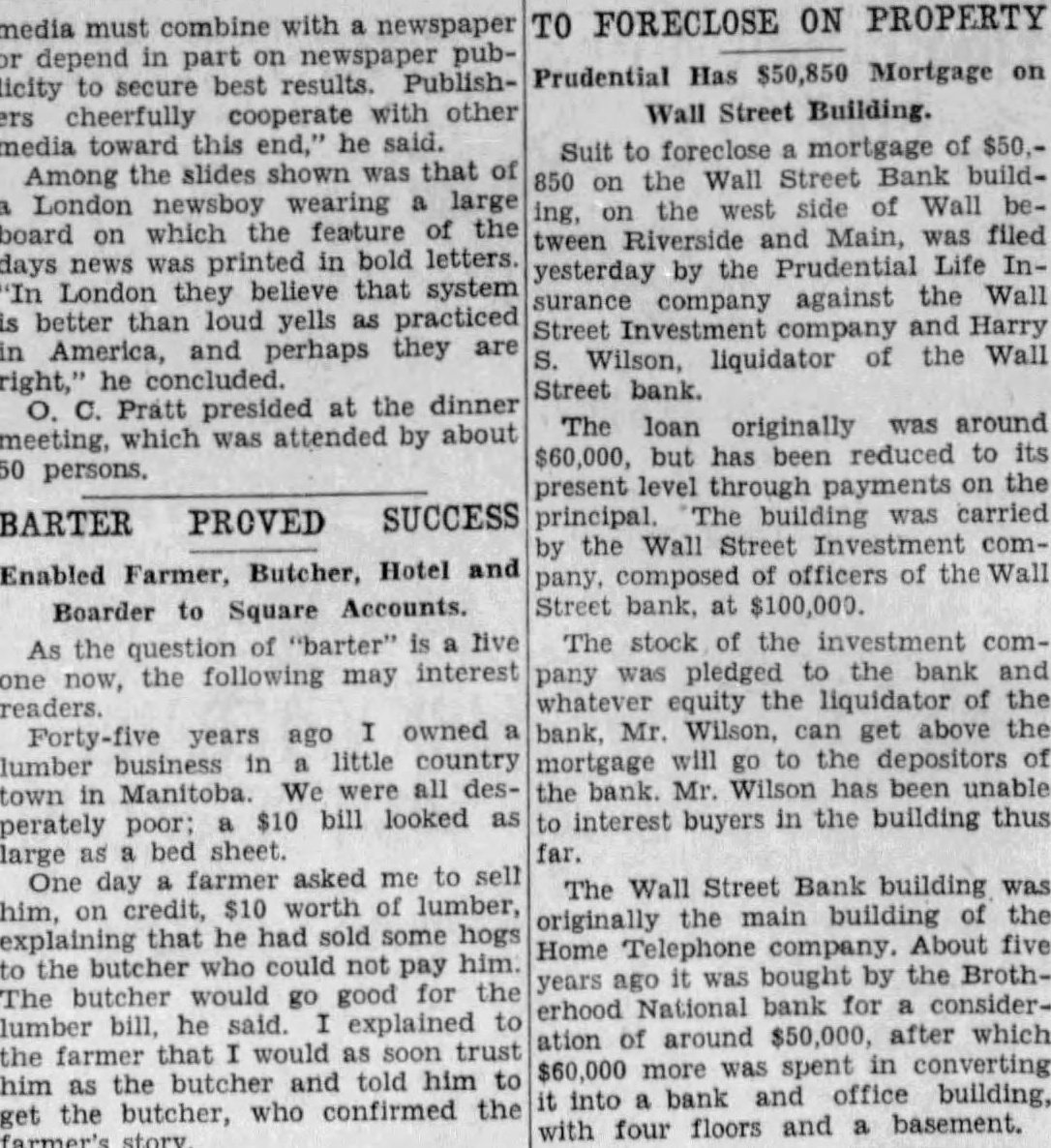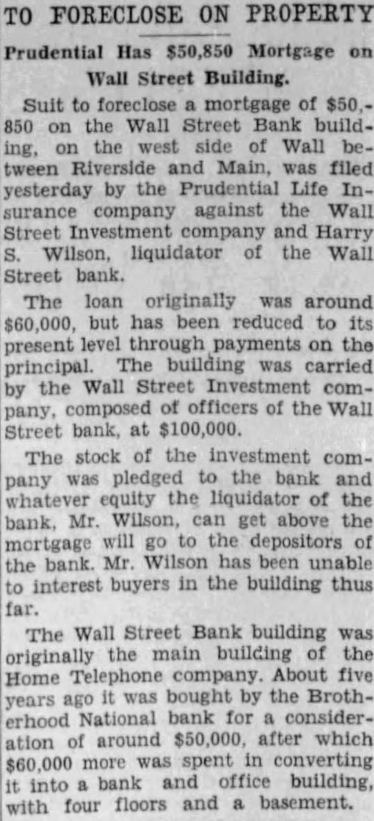 Wall Bank buildthe Wall Main, was filed yesterday by the Life Insurance against the Street and Harry Wilson, liquidator the Street bank. The originally was around but has been reduced present through the principal building carried Wall Street officers of Wall pany, bank, at $100,000. The stock the company pledged bank and equity the liquidator the bank, Mr. Wilson, can get above the mortgage will the depositors the bank. Wilson has been unable to interest buyers in the building thus The Wall Street Bank building originally building the Home About five bought the Brothyears erhood National for ation around $50,000, after which $60,000 spent converting bank and building, with four floors and basement.