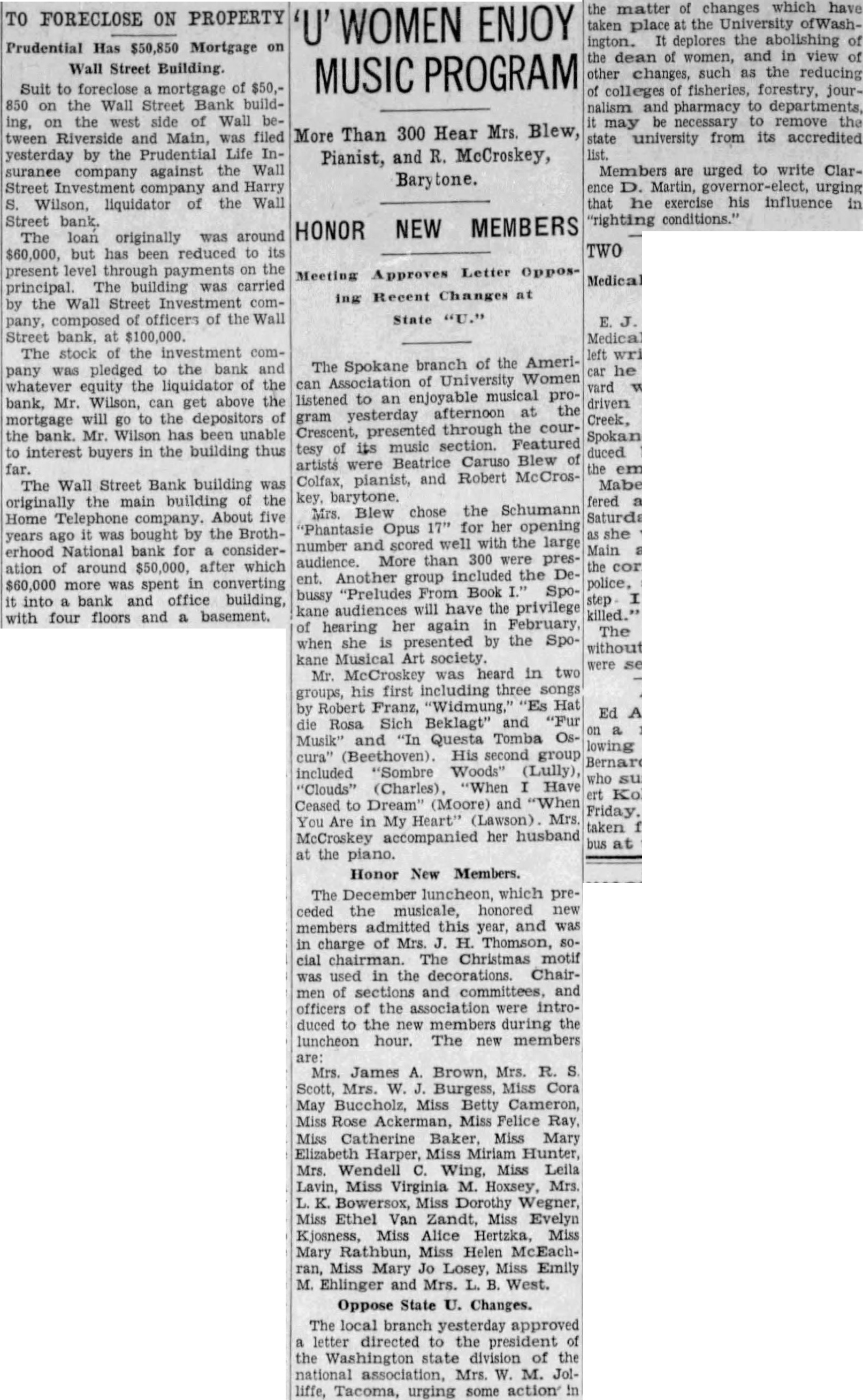 The December which ceded musicale, honored new members admitted this year, and charge Mrs. Thomson, chairman. The Christmas in the decorations. Chairof and officers the association were duced the new during the luncheon hour. The new members Mrs. James Brown, Mrs. Burgess, Cora May Miss Betty Rose Miss Felice Ray Miss Catherine Harper, Hunter, Mrs. Wendell Miss Leila Miss Virginia M. Mrs. Dorothy Wegner, Miss Ethel Zandt, Miss Evelyn Kjosness, Alice Mary Rathbun, Miss Helen McEachMiss Mary Jo Losey, Miss Emily M. Ehlinger and Mrs. West. Oppose State Changes. The local branch approved directed the the division of the association, M. Jolliffe, Tacoma, urging some action matter changes which the the in view changes, such the reducing fisheries, forestry, journalism pharmacy may remove from its accredited Members urged to write ClarMartin, urging exercise his influence "righting conditions."