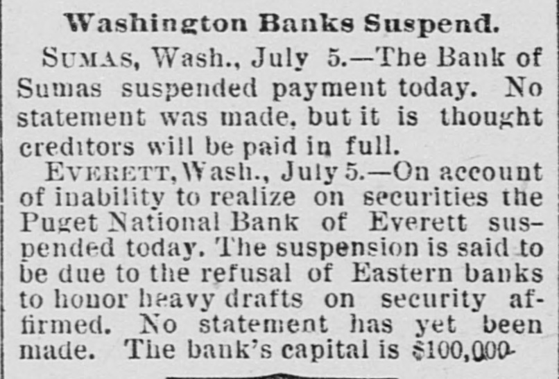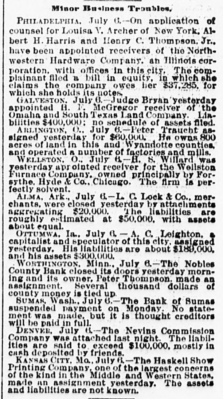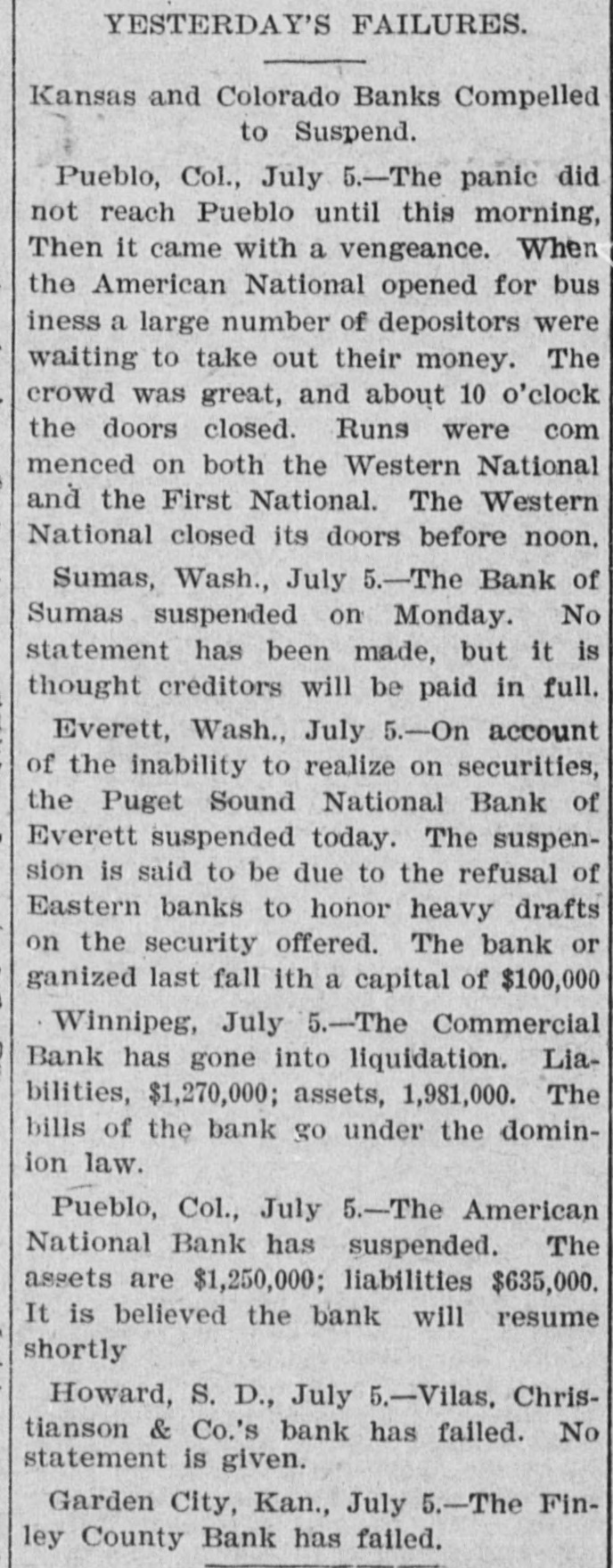 RESOLUTIONS BY THE NEW YORK CHAMBER OF COMMERCE Demanding a Speedy Repeal of the Sherman Purchasing Act Adopted With Only Three Negatives. NEW YORK, July 6.-The special meeting of the Chamber of Commerce to consider the present disturbed condition of the finances of the country, which was called at 12:30 o'clock this afternoon, was largely attended. The first vice-president, Alexander E. Orr, presided. John Claffin, the dry goods merchant, offered the following: Whereas, this country has often suffered greatly by reason of hasty and illadvised financial legislation; and, Whereas, it is now suffering from the effects of the silver purchasing clause of the Sherman act, which, by creating distrust as to the interchangeability of our currency based on gold, has caused widespread alarm, and has almost created a commercial panic; and, Whereas, in consequence of this alarm, money is withdrawn from circulation, business is greatly depressed, many mills and manufactories are closing or preparing to close, and thousands of laboring men are about to be thrown out of employment; and, Whereas, business enterprises will not be resumed, nor labor be steadily employed until money can be obtained by manufacturers and by merchants at moderate rates: and, Whereas, ordinary Interest rates cannot be expected until confidence in the stability of all the money of the country shall be thoroughly re-established, so the lender may not fear payment in dollars less valuable than those he lends. Now, be It Resolved 1. That the repeal of the silver purchasing clause of the Sherman act, which month by month renders increasingly difficult the maintenance of the parity of each dollar with every other dollar, is essential to the prompt restoration of national prosperity. This chamber, therefore. urges the speedy and unconditional repeal of such silver purchasing clause. Resolved, 2. That in the judgment of this chamber a representative commission should be appointed by Congress at the special session about to convene, which commission should diligently study the whole body of coinage and currency laws of the United States and of other countries and report at the regular session of Congress, to the end that a comprehensive, elastic currency may be carefully matured in the light of the world's experience. Louis Windmuller moved an addition, as follows: "Resolved, That a committee of seven be appointed by the Chair to co-operate with other commercial bodles representing similar Interests of this chamber in Washington, with power to use all legitimate means for the promptarepeal of the Sherman law." Mr. Windmuller's amendment was accepted as an amendment to the original 'resolution. The resolutions were declared adopted, there being, but three votes in the negative. The nays were William I. St. John, A. Foster Higgins and J. 13. Colgate C.N. Bliss offered a resolution, which was unanimously adopted. which instructed the secretary to send a copy of the resolutions to the President. each memher of Congress, and to all the chambers of commerce and other commercial bodies throughout the United States, requesting early action on this subject by their respective associations. The following committee, called for by Mr Windmuller's resolution. was appointed: John Claftin, Henry Hentz, G. H. Schwab, W. L. Trenholm, C. N. Bliss, J. E Simmons and John Sloan. The chamber then adjourned. PENSACOLA, FLA., July 6.-At a large meeting of the Chamber of Commerce to-day resolutions, asking the repeal of the Sherman law were unanimously adopted. More Bank Failures. TOPEKA, KAN., July 6.-Two Kansas banks closed their doors yesterday. The failure of Finney County Bank at Garden City was not unexpected, as the bank has for some time been in a bad condition. The Bank of Leroy, Coffey county, has also closed. OMAHA, July 6.-The American Savings Bank suspended this morning with deposits of $153,000 and assets of $259,000. It was involved In the embarrassment of the American Loan and Trust Company, through the latter's enterprise, the Omaha and South Texas Land Company EVERETT. WASH., July 6.-On account of Inability to realize on securities, the Puget Sound National Bank, of Everett. suspended yesterday. WORTHINGTON, MINN., July S-The Nobles County Bank closed its doors yesterday morning. Its owner, Peter Thompson, made an assignment. Several thousand dollars of the county's money is tied up. SUMAS, WASH. July 6.-The Bank of Sumas suspended payment Monday. No is statement has been made, but it thought the creditors will be paid in full. Governor Flower to the Reseue. WATERTOWN N. Y., July 6.-A run has been started on the Jefferson County Savings Bank in this city. Governor Flower was a witness of the run, and this afternoon, the rush continuing, Governor Flower, J. R. Stebbins, president of the Atricultural Insurance Company, and 201 e al preminent bankers and financiera signed and published a statement personally guaranteeing that the depositors shall be paid in full. It is believed that this will stop the run.