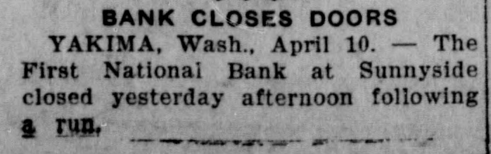 P BANK CLOSES DOORS YAKIMA, Wash., April 10. - The First National Bank at Sunnyside closed yesterday afternoon following a run.