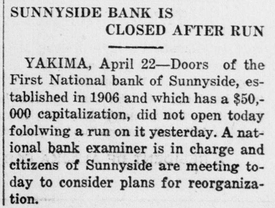 SUNNYSIDE BANK IS CLOSED AFTER RUN YAKIMA, April 22-Doors of the First National bank of Sunnyside, established in 1906 and which has a $50,000 capitalization, did not open today fololwing a run on it yesterday. A national bank examiner is in charge and citizens of Sunnyside are meeting today to consider plans for reorganization.
