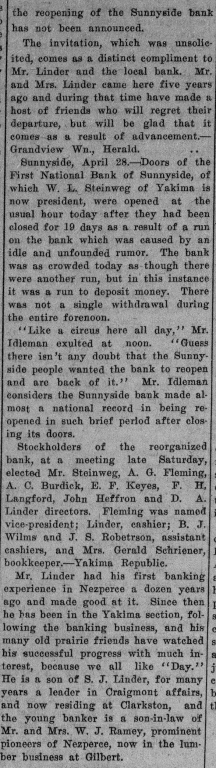the reopening of the Sunnyside bank has not been announced. The invitation, which was unsolicited, comes as a distinct compliment to Mr. Linder and the local bank. Mr. and Mrs. Linder came here five years ago and during that time have made a host of friends who will regret their departure, but will be glad that it comes as a result of advancement.Grandview Wn., Herald. Sunnyside, April 28.-Doors of the First National Bank of Sunnyside, of which W. L. Steinweg of Yakima is now president, were opened at the usual hour today after they had been closed for 19 days as a result of a run on the bank which was caused by an idle and unfounded rumor. The bank was as crowded today as though there were another run, but in this instance it was a run to deposit money. There was not a single withdrawal during the entire forenoon. "Like a circus here all day," Mr. Idleman exulted at noon. "Guess there isn't any doubt that the Sunnyside people wanted the bank to reopen and are back of it." Mr. Idleman considers the Sunnyside bank made almost a national record in being reopened in such brief period after closing its doors. Stockholders of the reorganized bank, at a meeting late Saturday, elected Mr. Steinweg, A. G. Fleming, A. C. Burdick, E. F. Keyes, F. H, Langford, John Heffron and D. A. Linder directors. Fleming was named vice-president; Linder, cashier; B. J. Wilms and J. S. Robetrson, assistant cashiers, and Mrs. Gerald Schriener, bookkeeper.-Yakima Republic. Mr. Linder had his first banking h experience in Nezperce a dozen years ago and made good at it. Since then I S he has been in the Yakima section, following the banking business, and his S many old prairie friends have watched his successful progress with much interest, because we all like "Day." j c He is a son of S. J. Linder, for many b years a leader in Craigmont affairs, tl and now residing at Clarkston, and the young banker is a son-in-law of Mr. and Mrs. W. J. Ramey, prominent pioneers of Nezperce, now in the lumber business at Gilbert.