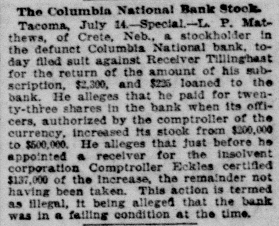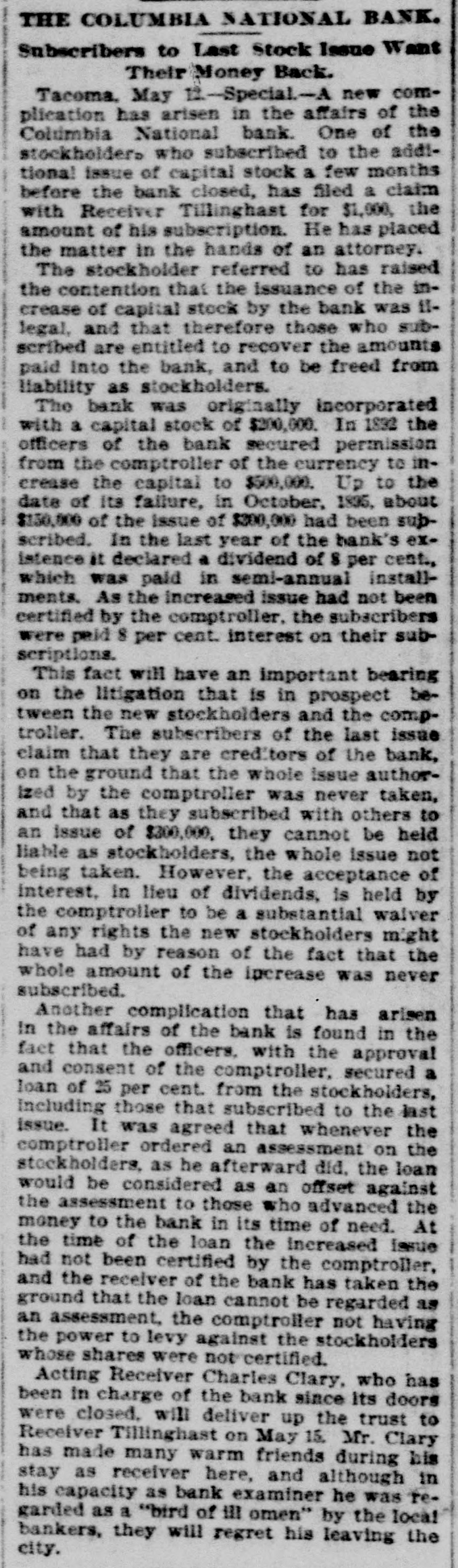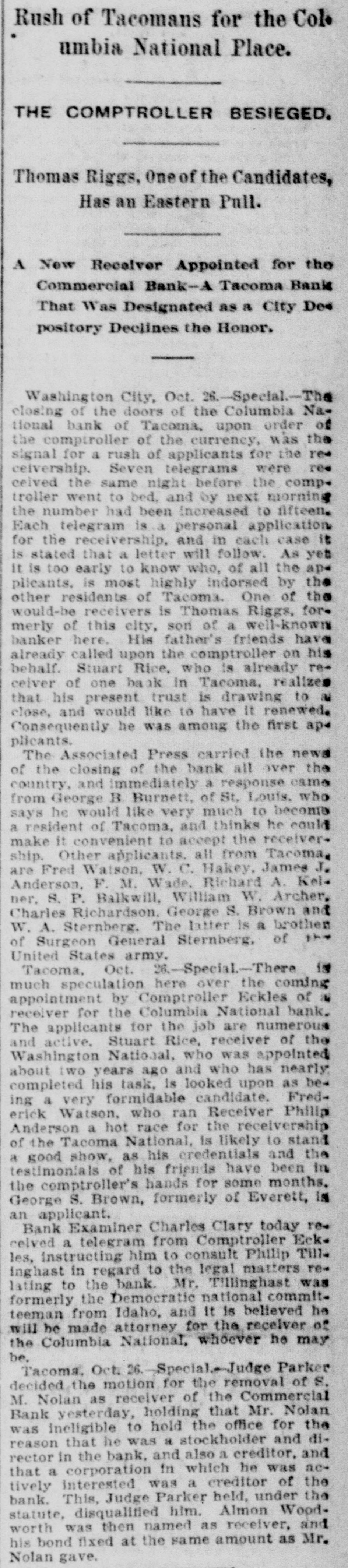 Political strings began to be pulled on the Controller of the Currency to compel him to appoint a receiver for the Columbia. The bank, however, had strong alliances East and a counter pressure was being exerted. However, Bank Examiner Clary was enlisted and he telegraphed his superior, with the result that he was ordered to take possession. No receiver has yet been appointed.