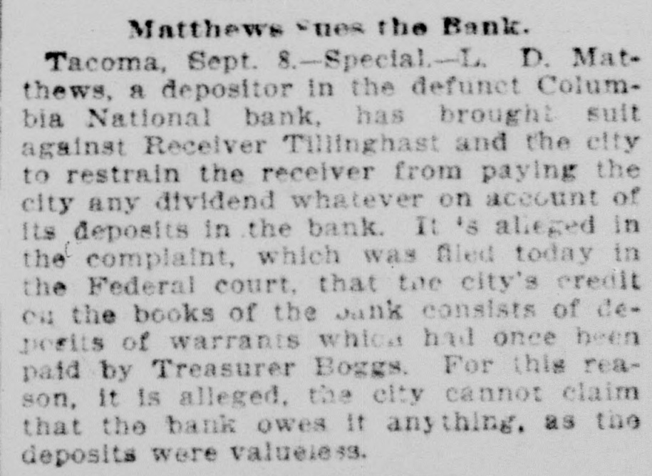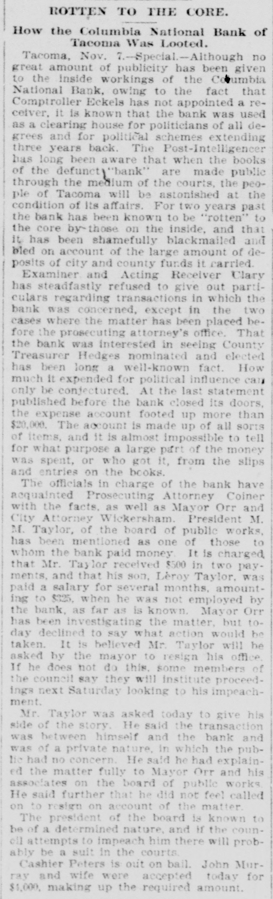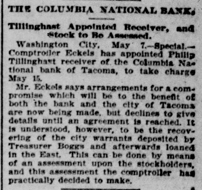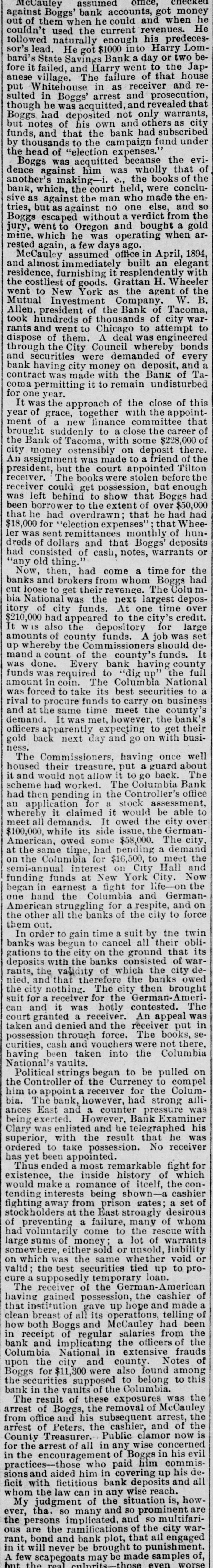 It was the approach of the close of this year of grace, together with the appointment of a new finance committee that brought suddenly to a close the career of the Bank of Tacoma, with some $228,000 of city money ostensibly on deposit there. An assignment was made to a friend of the president, but the court appointed Tilton receiver. The books were stolen before the receiver could get possession, but enough was left behind to show that Boggs had been borrower to the extent of over $50,000 that he had overdrawn; that he had had $18,000 for "election expenses"; that Wheeler was sent remittances monthly of hundreds of dollars and that Boggs' deposits had consisted of cash, notes, warrants or "any old thing."