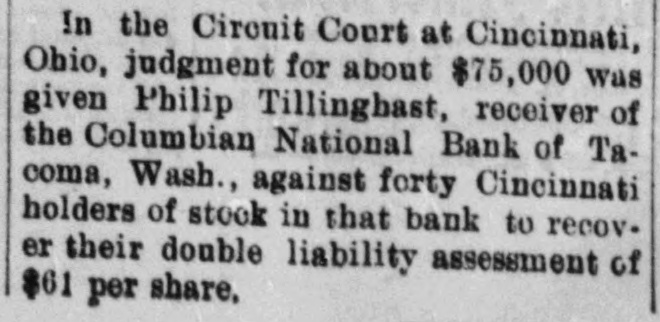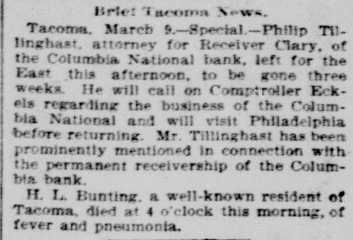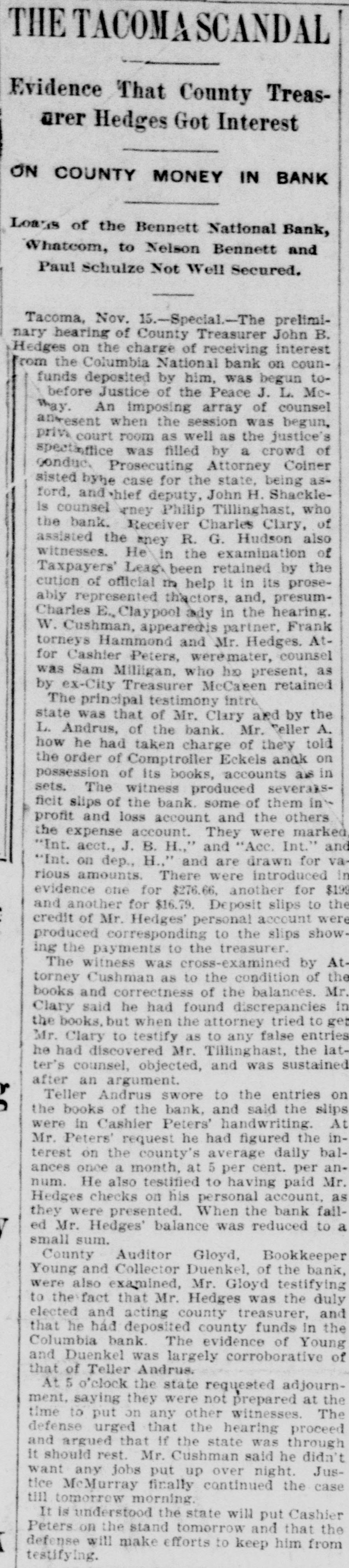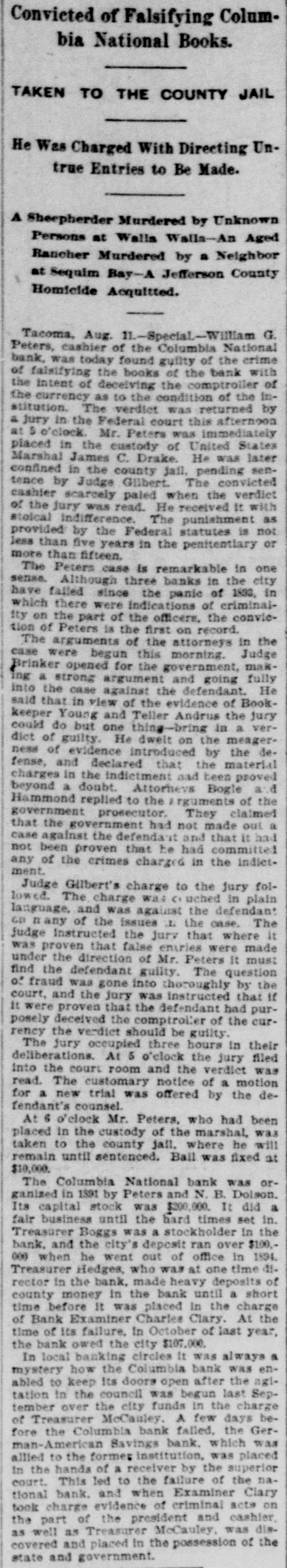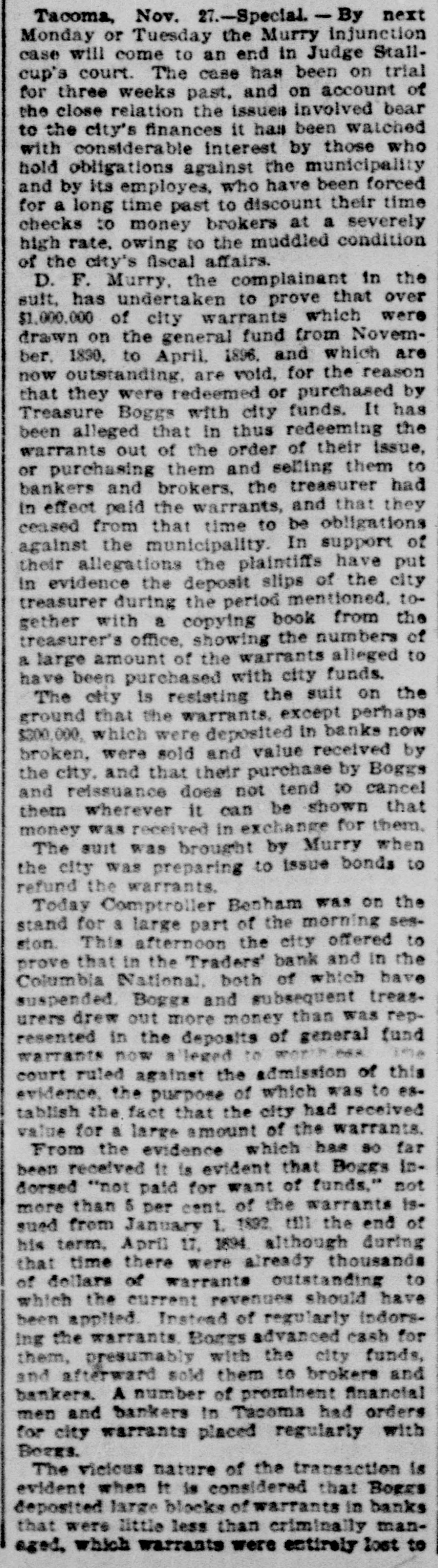 It was the approach of the close of this year of grace, together with the appointment of a new finance committee that brought suddenly to a close the career of the Bank of Tacoma, with some $228,000 of city money ostensibly on deposit there. An assignment was made to a friend of the president, but the court appointed Tilton receiver. The books were stolen before the receiver could get possession, but enough was left behind to show that Boggs had been borrower to the extent of over $50,000 that he had overdrawn; that he had had $18,000 for "election expenses"; that Wheeler was sent remittances monthly of hundreds of dollars and that Boggs' deposits had consisted of cash, notes, warrants or "any old thing."
