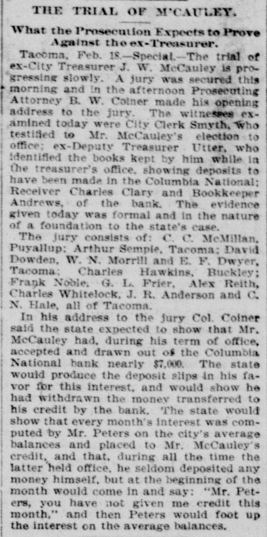 McCauley assumed office in April, 1894, and almost immediately built an elegant residence, furnishing it resplendently with the costliest of goods. Grattan H. Wheeler went to New York as the agent of the Mutual Investment Company. W. B. Allen, president of the Bank of Tacoma, took hundreds of thousands of city warrants and went to Chicago to attempt to dispose of them. A deal was engineered through the City Council whereby bonds and securities were demanded of every bank having city money on deposit, and a contract was made with the Bank of Tacoma permitting it to remain undisturbed for one year.