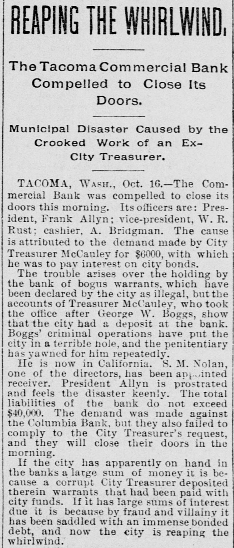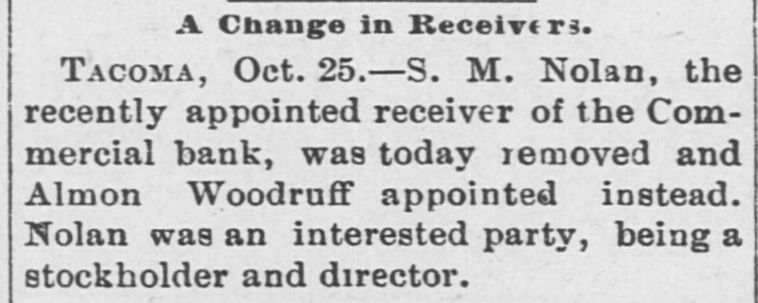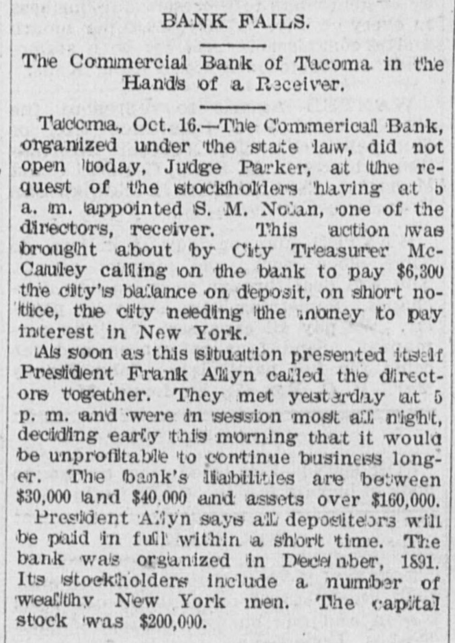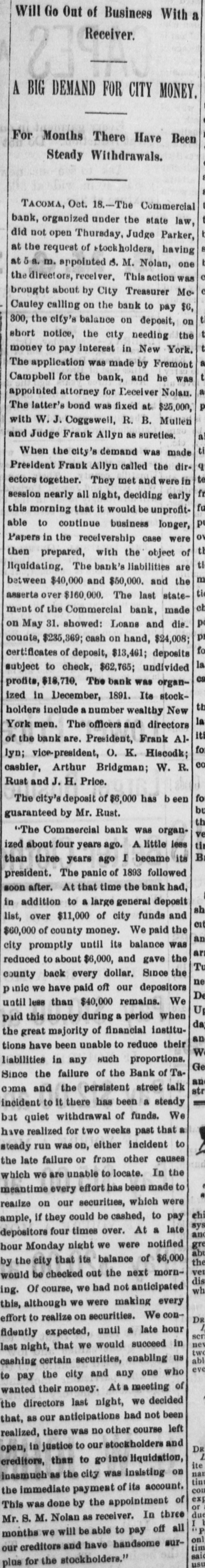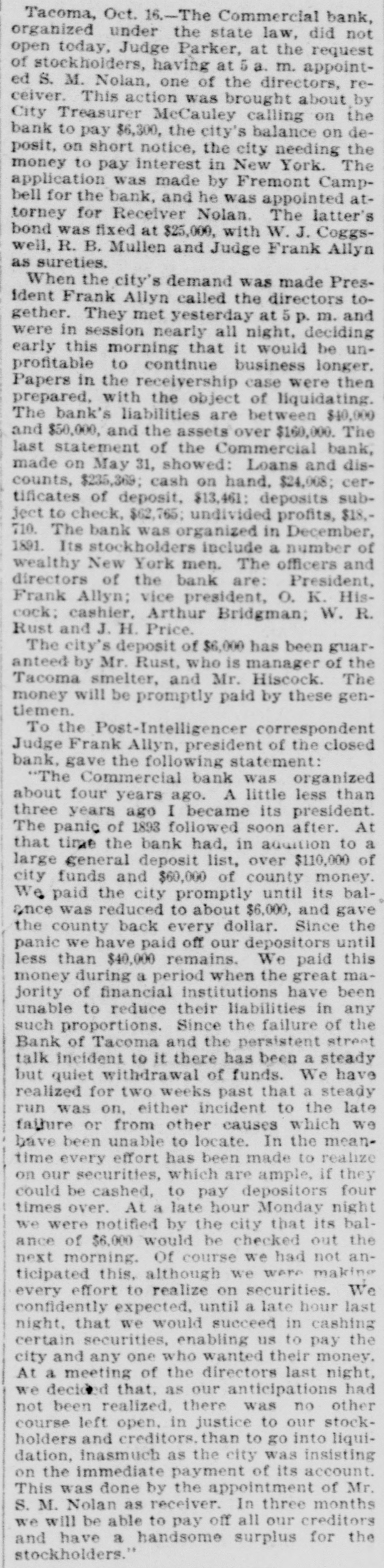 Tacoma, Oct. 16.-The Commercial bank, organized under the state law, did not open today, Judge Parker, at the request of stockholders, having at a. m. appointed S. M. Nolan, one of the directors, receiver. This action was brought about by City Treasurer McCauley calling on the bank to pay $6,300, the city's balance on deposit, on short notice, the city needing the money to pay interest in New York. The application was made by Fremont Campbell for the bank, and he was appointed attorney for Receiver Nolan. The latter's bond was fixed at $25,000, with W. J. Coggswell, R. B. Mullen and Judge Frank Allyn as sureties. When the city's demand was made President Frank Allyn called the directors together. They met yesterday at p. m. and were in session nearly all night, deciding early this morning that it would be unprofitable to continue business longer. Papers in the receivership case were then prepared, with the object of liquidating. The bank's liabilities are between $40,000 and $50,000, and the assets over $160,000. The last statement of the Commercial bank, made on May 31, showed: Loans and discounts, $235,369; cash on hand, $24,008; certificates of deposit, $13,461: deposits subject to check, $62,765; undivided profits, $18,710. The bank was organized in December, 1891. Its stockholders include a number of wealthy New York men. The officers and directors of the bank are: President, Frank Allyn; vice president, O. K. Hiscock: cashier, Arthur Bridgman; W. R. Rust and J. H. Price. The city's deposit of $6,000 has been guaranteed by Mr. Rust, who is manager of the Tacoma smelter, and Mr. Hiscock. The money will be promptly paid by these gentiemen. To the Post-Intelligencer correspondent Judge Frank Allyn, president of the closed bank, gave the following statement: "The Commercial bank was organized about four years ago. A little less than three years ago I became its president. The panic of 1893 followed soon after. At that time the bank had, in addition to a large general deposit list, over $110,000 of city funds and $60,000 of county money. We paid the city promptly until its balonce was reduced to about $6,000, and gave the county back every dollar. Since the panic we have paid off our depositors until less than $40,000 remains. We paid this money during a period when the great majority of financial institutions have been unable to reduce their liabilities in any such proportions. Since the failure of the Bank of Tacoma and the persistent street talk incident to it there has been a steady but quiet withdrawal of funds. We have realized for two weeks past that a steady run was on, either incident to the late failure or from other causes which we have been unable to locate. In the meantime every effort has been made to realize on our securities, which are ample, if they could be cashed, to pay depositors four times over. At a late hour Monday night we were notified by the city that its balance of $6,000 would be checked out the next morning. Of course we had not anticipated this, although we were making every effort to realize on securities. We confidently expected, until a late hour last night. that we would succeed in cashing certain securities, enabling us to pay the city and any one who wanted their money. At a meeting of the directors last night, we decided that, as our anticipations had not been realized, there was no other course left open. in justice to our stockholders and creditors. than to go into liquidation, inasmuch as the city was insisting on the immediate payment of its account. This was done by the appointment of Mr. S. M. Nolan as receiver. In three months we will be able to pay off all our creditors and have a handsome surplus for the stockholders."