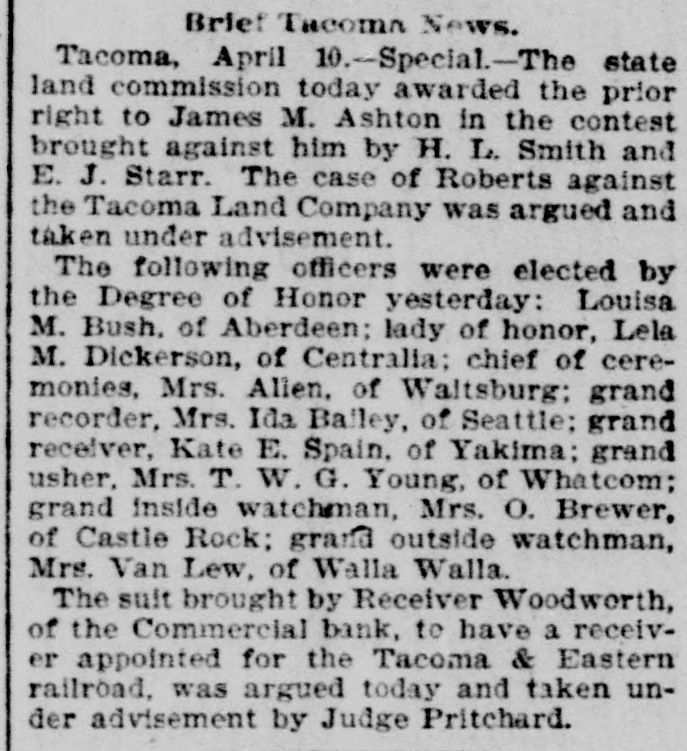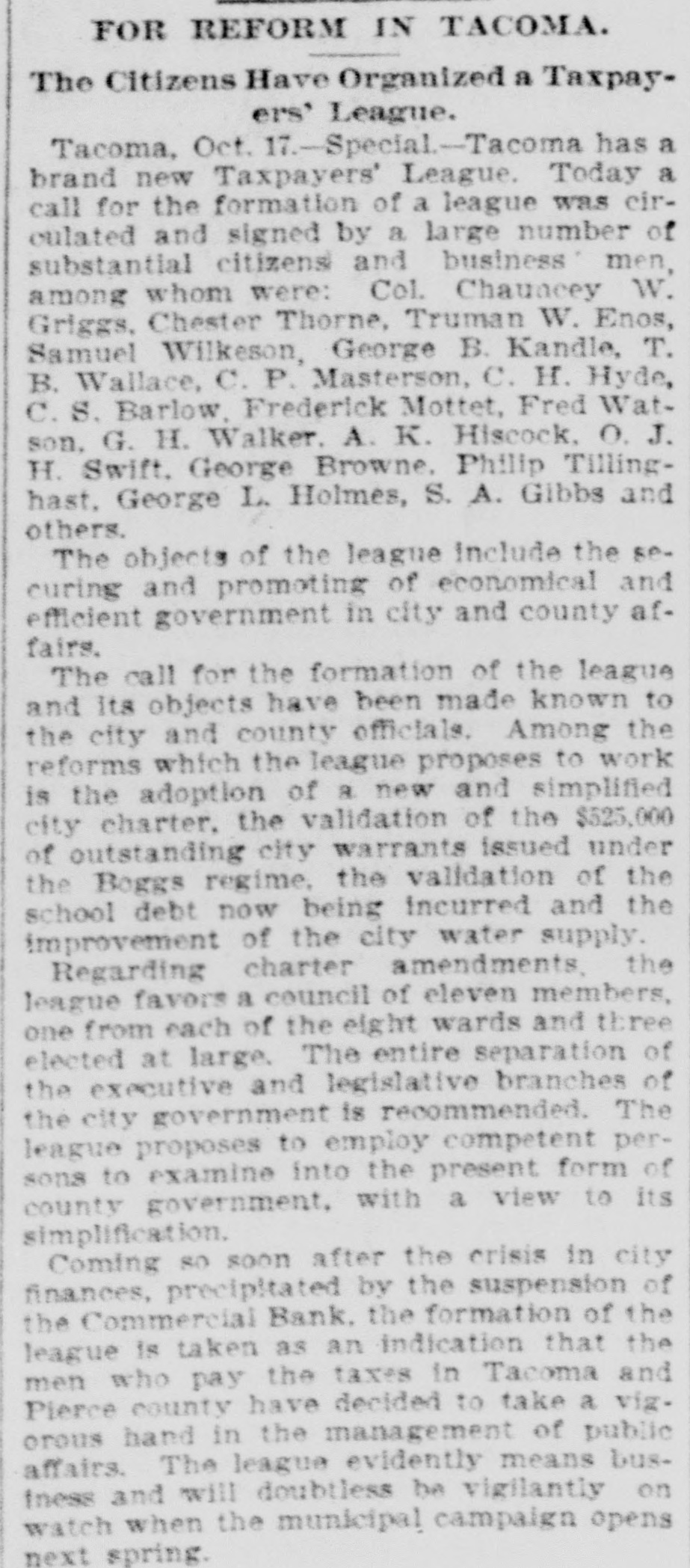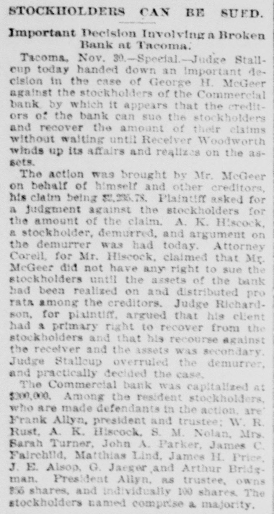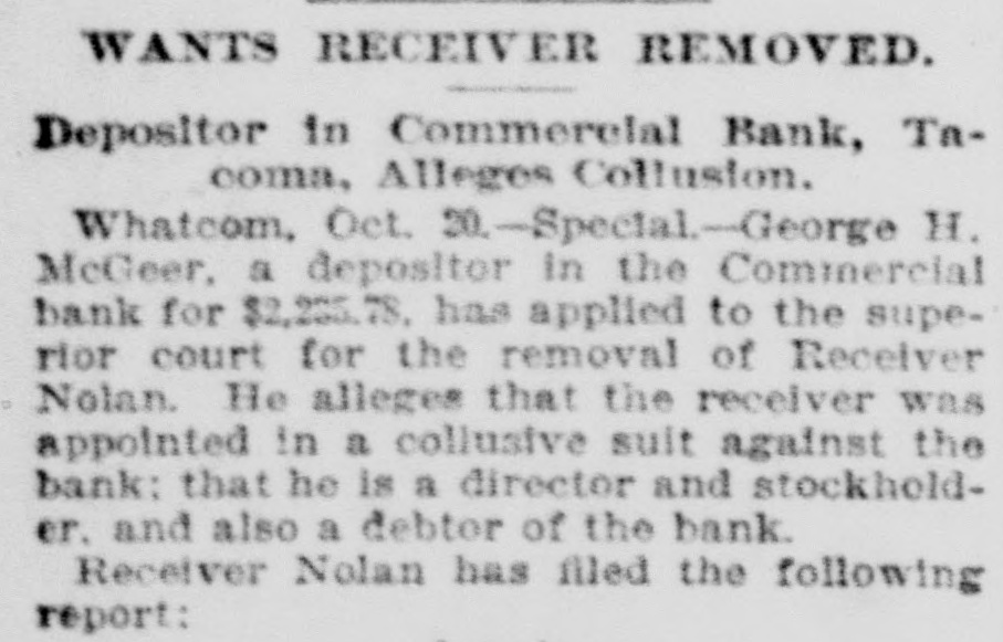 Tacoma, Oct. 16.-The Commercial bank, organized under the state law, did not open today, Judge Parker, at the request of stockholders, having at a. m. appointed S. M. Nolan, one of the directors, receiver. This action was brought about by City Treasurer McCauley calling on the bank to pay $6,300, the city's balance on deposit, on short notice, the city needing the money to pay interest in New York. The application was made by Fremont Campbell for the bank, and he was appointed attorney for Receiver Nolan. The latter's bond was fixed at $25,000, with W. J. Coggswell, R. B. Mullen and Judge Frank Allyn as sureties. When the city's demand was made President Frank Allyn called the directors together. They met yesterday at p. m. and were in session nearly all night, deciding early this morning that it would be unprofitable to continue business longer. Papers in the receivership case were then prepared, with the object of liquidating. The bank's liabilities are between $40,000 and $50,000, and the assets over $160,000. The last statement of the Commercial bank, made on May 31, showed: Loans and discounts, $235,369; cash on hand, $24,008; certificates of deposit, $13,461: deposits subject to check, $62,765; undivided profits, $18,710. The bank was organized in December, 1891. Its stockholders include a number of wealthy New York men. The officers and directors of the bank are: President, Frank Allyn; vice president, O. K. Hiscock: cashier, Arthur Bridgman; W. R. Rust and J. H. Price. The city's deposit of $6,000 has been guaranteed by Mr. Rust, who is manager of the Tacoma smelter, and Mr. Hiscock. The money will be promptly paid by these gentiemen. To the Post-Intelligencer correspondent Judge Frank Allyn, president of the closed bank, gave the following statement: "The Commercial bank was organized about four years ago. A little less than three years ago I became its president. The panic of 1893 followed soon after. At that time the bank had, in addition to a large general deposit list, over $110,000 of city funds and $60,000 of county money. We paid the city promptly until its balonce was reduced to about $6,000, and gave the county back every dollar. Since the panic we have paid off our depositors until less than $40,000 remains. We paid this money during a period when the great majority of financial institutions have been unable to reduce their liabilities in any such proportions. Since the failure of the Bank of Tacoma and the persistent street talk incident to it there has been a steady but quiet withdrawal of funds. We have realized for two weeks past that a steady run was on, either incident to the late failure or from other causes which we have been unable to locate. In the meantime every effort has been made to realize on our securities, which are ample, if they could be cashed, to pay depositors four times over. At a late hour Monday night we were notified by the city that its balance of $6,000 would be checked out the next morning. Of course we had not anticipated this, although we were making every effort to realize on securities. We confidently expected, until a late hour last night. that we would succeed in cashing certain securities, enabling us to pay the city and any one who wanted their money. At a meeting of the directors last night, we decided that, as our anticipations had not been realized, there was no other course left open. in justice to our stockholders and creditors. than to go into liquidation, inasmuch as the city was insisting on the immediate payment of its account. This was done by the appointment of Mr. S. M. Nolan as receiver. In three months we will be able to pay off all our creditors and have a handsome surplus for the stockholders."