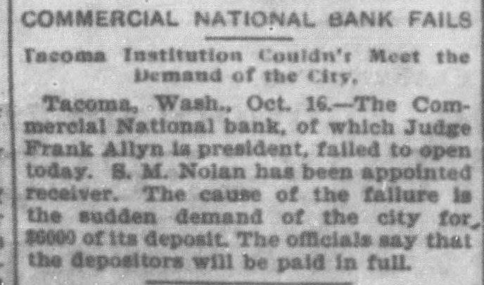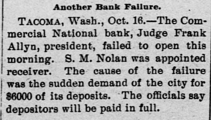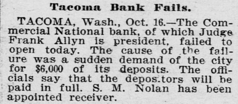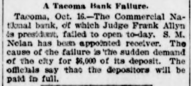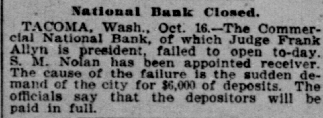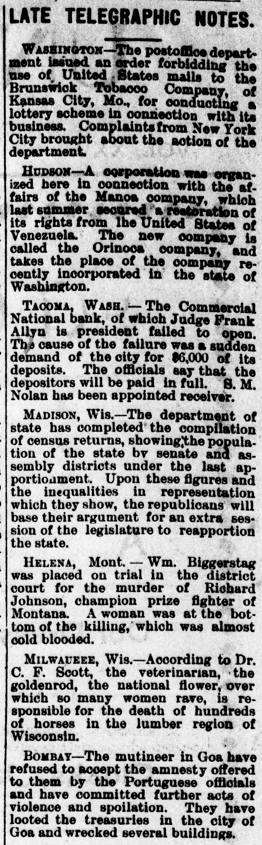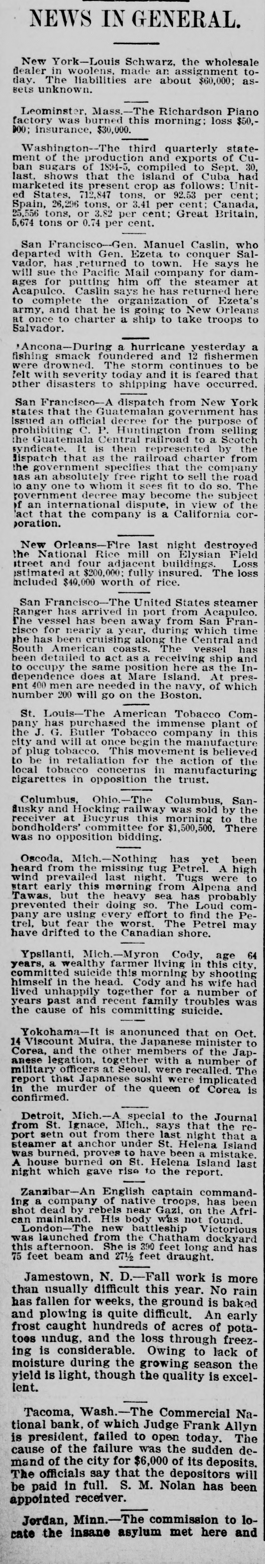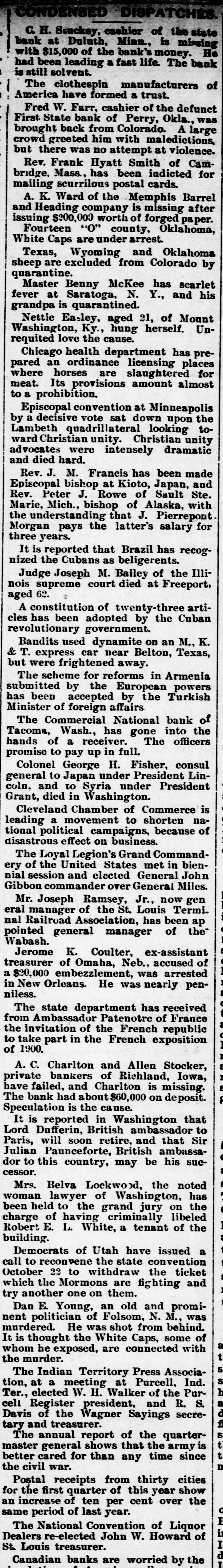 sia C. H. Stuckey, cashier of the state bank at Duluth, Minn., is missing He with $15,000 of the bank's money. had been leading a fast life. The bank is still solvent. The clothespin manufacturers of America have formed a trust. Fred W. Farr, cashier of the defunct First State bank of Perry, Okla., was brought back from Colorado. A large crowd greeted him with maledictions, but there was no attempt at violence. Rev. Frank Hyatt Smith of Cam- for bridge, Mass. has been indicted mailing scurrilous postal cards. K. Ward of the Memphis Barrel and A. Heading company is missing after issuing $200,000 worth of forged paper. Fourteen "O" county, Oklahoma, White Caps are under arrest. Texas, Wyoming and Oklahoma sheep are excluded from Colorado by Master quarantine. Benny McKee has scarlet his fever at Saratoga, N. Y., and grandpa is quarantined. Nettie Easley, aged 21, of Mount UnWashington, Ky., hung herself. requited love the cause. Chicago health department has prean ordinance licensing places for pared where horses are slaughtered meat. Its provisions amount almost to a prohibition. Episcopal convention at the Minneapolis sat down upon advocates were ward THE and died hard. J. M. Francis has been and made Rev. Episcopal bishop at Kioto, Japan, Ste. Peter J. Rowe of Sault Rev. Mich., bishop of Alaska, with Marie, understanding that J. for Pierrepont the Morgan pays the latter's salary three years. It is reported that Brazil has recognized the Cubans as beligerents. Judge Joseph M. Bailey of the Illinois supreme court died at Freeport, aged 62. constitution of twenty-three artiA cles has been adopted by the Cuban revolutionary government. Bandits used dynamite on an M., K. Texas, & T. express car near Belton, but were frightened away. The scheme for reforms in Armenia submitted by the European powers has been accepted by the Turkish Minister of foreign affairs Commercial National bank the of The Wash., has gone into officers hands Tacoma, of a receiver. The promise to pay up in full. Colonel George H. Fisher, consul Linto Japan under President coln, general and to Syria under President Grant, died in Washington. Cleveland Chamber of Commerce is a movement to shorten na- of tional leading political campaigns, because disastrous effect on business. The Loyal Legion's Grand bien- Commandof the United States met in John ery session and elected General Miles. nial Gibbon commander over General Mr. Joseph Ramsey, Jr., now gen eral manager of the St. Louis Termi. Railroad Association, has been ap the nal pointed general manager of Wabash. K. Coulter, ex-assistant of Jerome of Omaha, Neb., accused $20,000 treasurer embezzlement, was arrested a in New Orleans. He was nearly penThe niless. state department has received Ambassador Patenotre of France from invitation of the French republic of 1900. to the take part in the French exposition A. C. Charlton and Allen Stocker, bankers of Richland, Iowa, private failed, and Charlton is missing. The have bank had about$60,000 on deposit. Speculation is the cause. is reported in Washington that to It Dufferin, British ambassador Sir Lord will soon retire, and that Paris, Paunceforte, British ambassa- sucdor to Julian this country, may be his cessor. Belva Lockwood, the noted has Mrs. lawyer of Washington, the woman held to the grand jury on libeled been of having criminally the charge Robert E. L. White, a tenant of building. Democrats of Utah have issued a reconvene the state ticket convention call to 22 to withdraw the and which October the Mormons are fighting try another one on them. E. Young, an old and promi- was Dan politician of Folsom, N. M., behind. nent murdered. He was shot from of thought the White Caps, some with It is whom he exposed, are connected the murder. Indian Territory Press Ind. AssociaThe at a meeting at Purcell, PurS a the Jo Maller 'H M eleeted thoir Ter., Register president, and cell Davis of the Wagner Sayings secretary and annual treasurer. report of the quarter- is The general shows that the army since better master cared for than any time the civil war. Postal receipts from thirty cities show the first quarter of this year the for increase of ten per cent over an same period of last year. National Convention of Liquor of The Dealers re-elected John W. Howard St. Louis treasurer. Canadian banks are worried by the