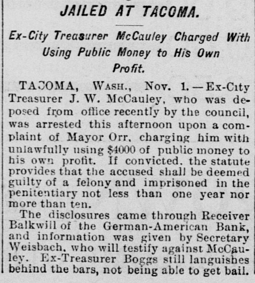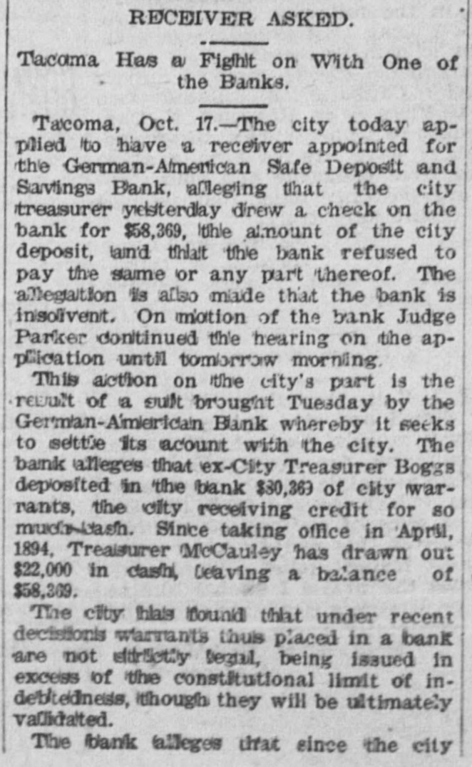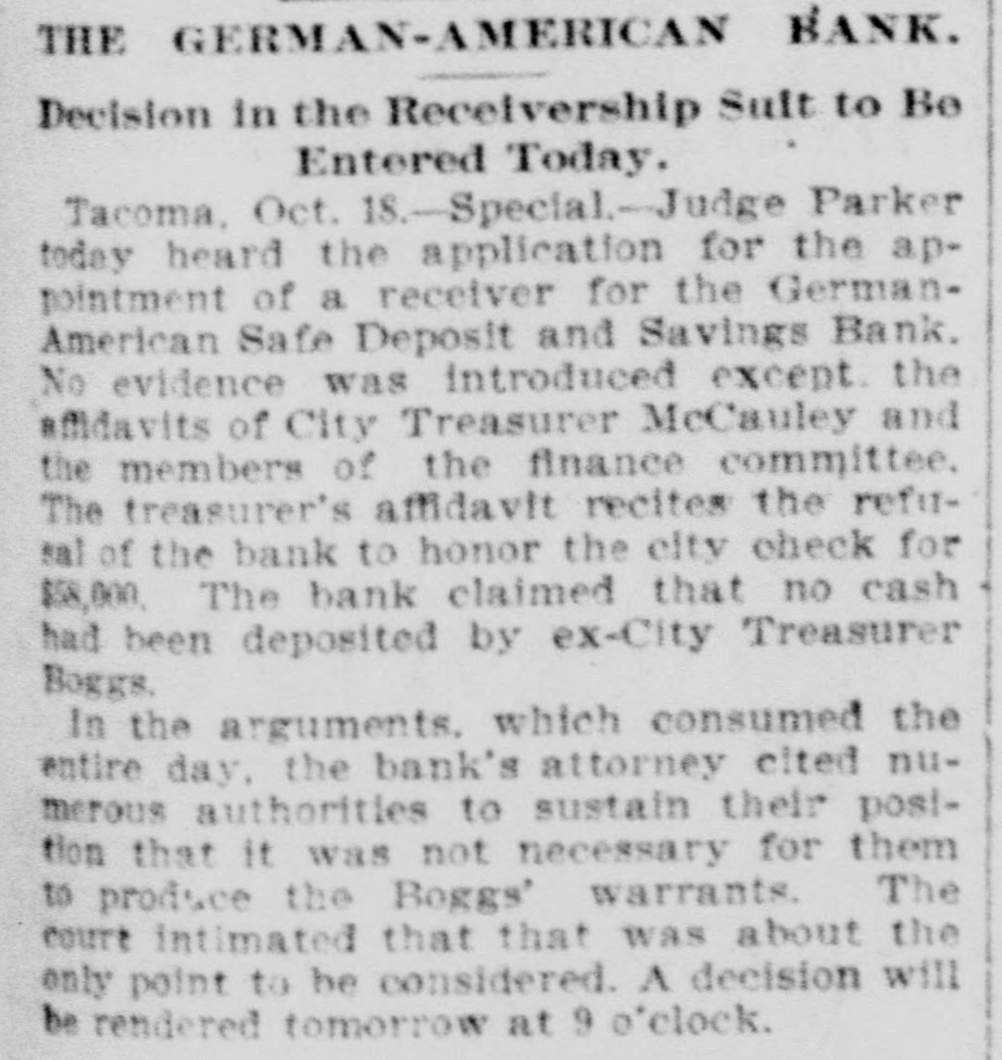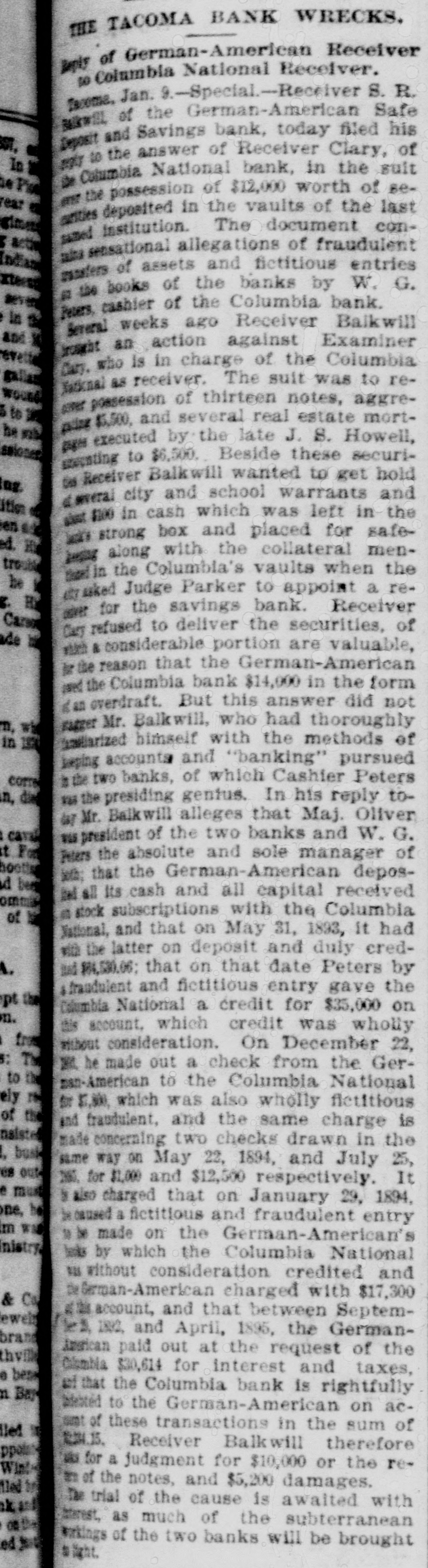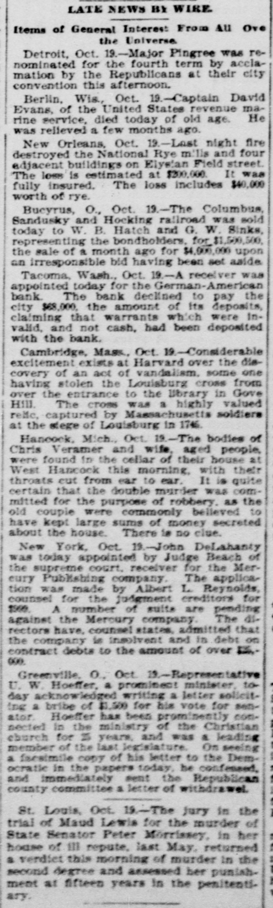 LATE NEWS BY WIRE. Items of General Interest From All Ove the Universe Detroit, Oct. 19.-Major Pingree was renominated for the fourth term by acelamation by the Republicans at their city convention this afternoon. Berlin, Wis, Oct. 19.-Captain David Evans, of the United States revenue marine service, died today of old age. He was relieved a few months ago. New Orleans, Oct. 19.-Last night fire destroyed the National Rye mills and four adjacent buildings on Elysian Field street. The less is estimated at $200,000. It was fully insured. The loss includes $40,000 worth of rye. Bucyrus, O., Oct. 19.-The Columbus, Sandusky and Hocking railroad was sold today to W. B. Hatch and G. W. Sinks, representing the bondholders, for $1,500,500, the sale of a month ago for $4,000,000 upon an irresponsible bid having been set aside Tacoma, Wash., Oct. 19-A receiver was appointed today for the German-American bank. The bank declined to pay the city $68,000, the amount of Its deposits, claiming that warrants which were Invalid, and not cash, had been deposited with the bank. Cambridge, Mass., Oct. 19.-Considerable excitement exists at Harvard over the diecovery of an act of vandalism. some one having stolen the Louisburg cross from over the entrance to the library in Gove Hill. The CTOSS was a highly valued reMc, captured by Massachusetts soldiers at the stege of Louisburg in 1746. Hancock, Mich., Oct. 19-The bodies of Chris Veramer and wife, aged people, were found in the cellar of their house at West Hancock this morning, with their throats cut from ear to ear. It is quite certain that the double murder was committed for the purpose of robbery. as the old couple were commonly believed to have kept large sums of money secreted about the house. There is no clue. New York, Oct. 19.-John DeLahanty was today appointed by Judge Beach of the supreme court, receiver for the Mereury Publishing company. The application was made by Albert L Reynolds, counsel for the judgment creditors for 1999. A number of suite are pending against the Mercury company. The directors have, counsel states, admitted that the company is insolvent and in debt on contract debts to the amount of over III,000. Greenville, 0., Oct. 19.-Representative U. W. Hoeffer, a prominent minister. today acknowledged writing a letter solicittng a bribe of $1,500 for his vote for Minator. Hoeffer has been prominently comnected In the ministry of the Christian eburch for n years, and was & leading member of the last legislature. On seeing a facsimile copy of his letter to the Democratic in the papers today, be confessed, and immediately sent the Republican county committee a letter of withdrawel. St. Louis, Oct. 19-The jury in the trial of Maud Lewis for the murder of State Senator Peter Morrissey, in her house of III repute, last May, returned a verdict this morning of murder in the second degree and assessed her punishment at fifteen years In the penitentiary.