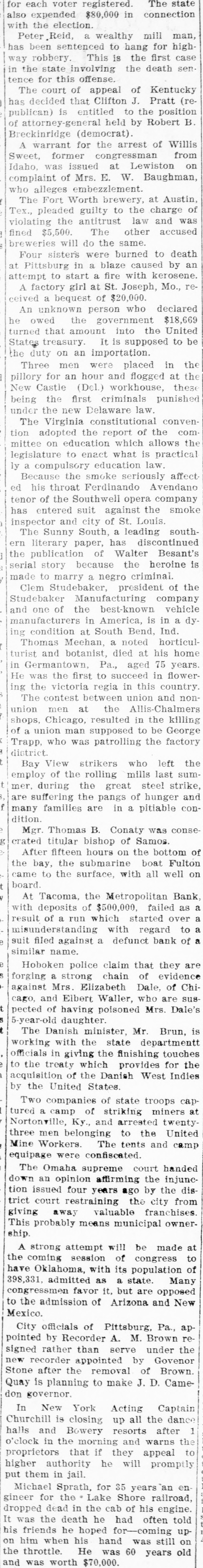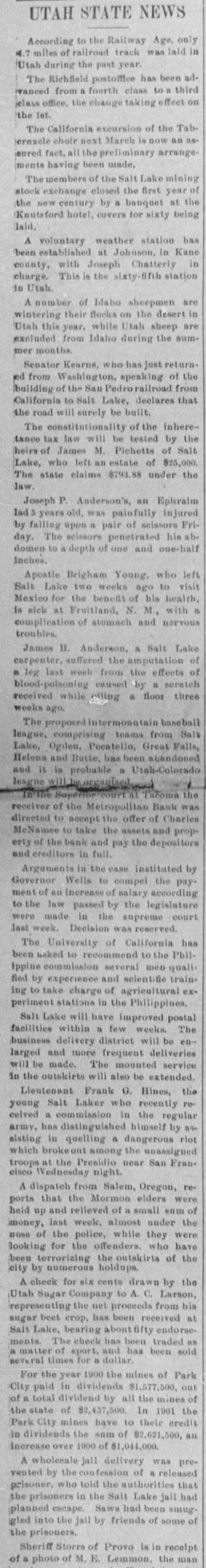UTAH STATE NEWS According to the Railway Age, only 4.7 miles of railroad track was laid in Utah during the past year. The Richfield postoffice has been advanced from a fourth class to a third jelass office, the change taking effect on the 1st. The California excursion of the Tabernacle choir next March is now an assured fact, all the preliminary arrangements having been made, The members of the Salt Lake mining stock exchange closed the first year of the new century by a banquet at the Knutsford hotel, covers for sixty being laid, A voluntary weather station has been established at Johnson, in Kane county, with Joseph Chatterly in charge. This is the sixty-fifth station in Utah. A number of Idaho sheepmen are wintering their flocks on the desert in Utah this year, while Utah sheep are excluded from Idaho during the summer months. Senator Kearns, who has just returnjed from Washington, speaking of the building of the San Pedro railroad from California to Salt Lake, declares that the road will surely be built. The constitutionality of the inheretance tax law will be tested by the heirs of James M. Pichetts of Salt Lake, who left an estate of $25,000. The state claims $793.88 under the law. Joseph P. Anderson's, an Ephraim Ind years old, was painfully injured by falling upon a pair of seissors Friday. The seissors penetrated his ab. domen to a depth of one and one-half inches. Apostle Brigham Young, who left Salt Lake two weeks ago to visit Mexico for the benefit of his health, is sick at Fruitland, N. M., with 1% complication of stomach and nervous troubles. James H. Anderson, A Salt Lake earpenter, suffered the amputation of a leg last week from the effects of blood-polsoning caused by a scratch received while ciling a floor three weeks ago, The proposed intermonatain baseball league, comprising teams from Salt Lake, Ogden, Pocatello, Great Falls, Helena and Butte, has been standoned and it is probable a Utah-Colorado league will be In'the the Tacoma receiver of the Metropolitan Bank was directed to accept the offer of Charles McNamee to take the assets and property of the bank and pay the depositors and creditors in full. Arguments to the case instituted by Governor Wells to compel the payment of an increase of salary according to the law passed by the legislature were made in the supreme court last week. Decision was reserved. The University of California has been asked to recommend to the Philippine commission several men qualified by experience and scientifie training to take charge of agricultural experiment stations in the Philippines, Salt Lake will have improved postal facilities within a few weeks. The business delivery district will be enlarged and more frequent deliveries will be made. The mounted service in the outskirts will also be extended. Lieutenant Frank G. Hines, the young Salt Laker who recently recelved a commission in the regular army, has distinguished himself by assisting in quelling a dangerous riot which broke ont among the unassigned troops at the Presidio near San Franeiseo Wednesday night. A dispatch from Salem, Oregon, reports that the Mormon elders were held up and relieved of a small sum of money, last week, almost under the nose of the police, while they were looking for the offenders. who have been terrorizing the outskirts of the city by numerous holdups. A check for six cents drawn by the Utah Sugar Company to A. C. Larson, representing the net proceeds from his sugar beet crop, has been received at Salt Lake, bearing about fifty endorsements. The check has been traded as a matter of sport, and has been sold several times for a dollar. For the year 1900 the mines of Park City paid in dividends $1,577,500, out of a total dividend by all the mines of the state of $2,437,500. In 1901 the Park City mines have to their credit in dividends the sum of $2,631,500, an increase over 1900 of $1,044,000. A wholesale jail delivery was prevented by the confession of a released prisoner, who told the authorities that the prisoners in the Salt Lake jull had planned escape. Saws had been smuggled into the jail by friends of some of the prisoners. Sheriff Storrs of Provo is in receipt of a photo of M. E. Lemmon, the man