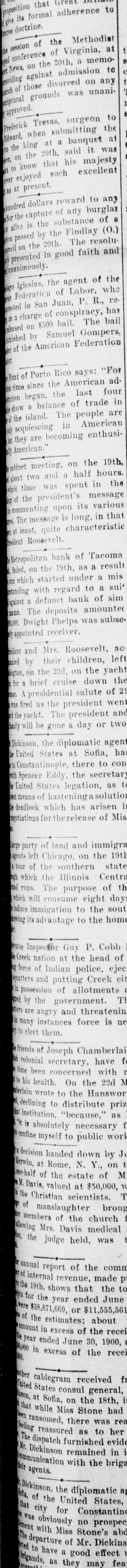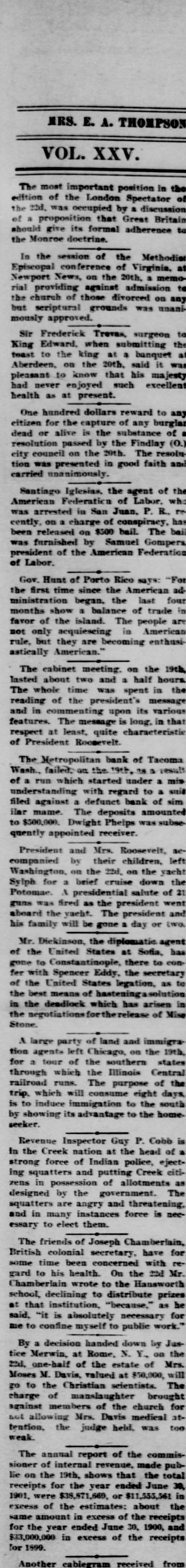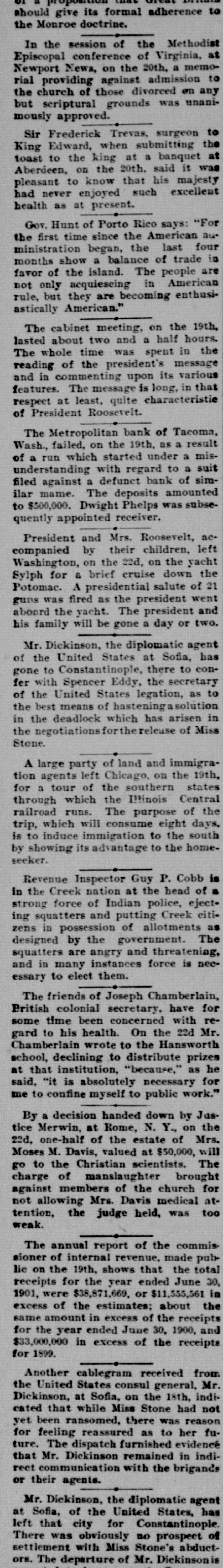 should give its formal adherence to the Monroe doctrine. In the session of the Methodist Episcopal conference of Virginia, at Newport News, on the 20th, a memorial providing against admission to the church of those divorced en any but scriptural grounds was unanimously approved. Sir Frederick Trevas, surgeon to King Edward, when submitting the toast to the king at a banquet at Aberdeen, on the 20th. said it was pleasant to know that his majesty had never enjoyed such excellent health as at present. Gov. Hunt of Porto Rico says: "For the first time since the American auministration began, the last four months show a balance of trade in favor of the island. The people are not only acquiescing in American rule, but they are becoming enthusiastically American." The cabinet meeting, on the 19th, lasted about two and a half hours. The whole time was spent in the reading of the president's message and in commenting upon its various features. The message is long, in that respect at least, quite characteristic of President Roosevelt. The Metropolitan bank of Tacoma, Wash., failed, on the 19th, as a result of a run which started under a misunderstanding with regard to a suit filed against a defunct bank of similar mame. The deposits amounted to $500,000. Dwight Phelps was subsequently appointed receiver. President and Mrs. Roosevelt, accompanied by their children, left Washington, on the 22d, on the yacht Sylph for a brief cruise down the Potomac. A presidential salute of 21 guns was fired as the president went aboard the yacht. The president and his family will be gone a day or two. Mr. Dickinson, the diplomatic agent of the United States at Sofia, has gone to Constantinople, there to confer with Spencer Eddy, the secretary of the United States legation, as to the best means of hasteningasolution in the deadlock which has arisen in the negotiations for the release of Miss Stone. A large party of land and immigration agents left Chicago, on the 19th, for a tour of the southern states through which the I!!!nois Central railroad runs. The purpose of the trip, which will consume eight days, is to induce immigation to the south by showing its advantage to the homeseeker. Revenue Inspector Guy P. Cobb is in the Creek nation at the head of a strong force of Indian police, ejecting squatters and putting Creek citizens in possession of allotments as designed by the government. The squatters are angry and threatening, and in many instances force is necessary to elect them. The friends of Joseph Chamberlain, British colonial secretary, have for some time been concerned with regard to his health. On the 22d Mr. Chamberlain wrote to the Hansworth school, declining to distribute prizes at that institution, "because," as he said, "it is absolutely necessary for me to confine myself to public work." By a decision handed down by Justice Merwin, at Rome, N. Y., on the 22d, one-half of the estate of Mrs. Moses M. Davis, valued at $50,000, will go to the Christian scientists. The charge of manslaughter brought against members of the church for not allowing Mrs. Davis medical attention, the judge held, was too weak. The annual report of the commissioner of internal revenue, made public on the 19th, shows that the total receipts for the year ended June 30, 1901, were $38,871,669, or $11,555,561 in excess of the estimates; about the same amount in excess of the receipts for the year ended June 30, 1900, and $33,000,000 in excess of the receipts for 1899. Another cablegram received from the United States consul general, Mr. Dickinson, at Sofia, on the 18th, indicated that while Miss Stone had not yet been ransomed, there was reason for feeling reassured as to her future. The dispatch furnished evidencé that Mr. Dickinson remained in indirect communication with the brigands or their agents. Mr. Dickinson, the diplomatic agent at Sofia, of the United States, has left that city for Constantinople. There was obviously no prospect of settlement with Miss Stone's abductors. The departure of Mr. Dickinsonis