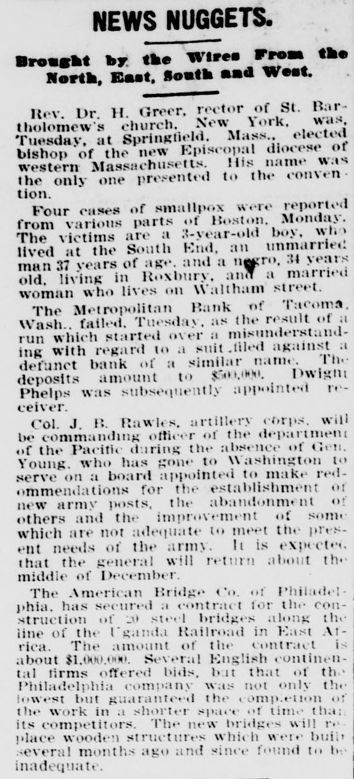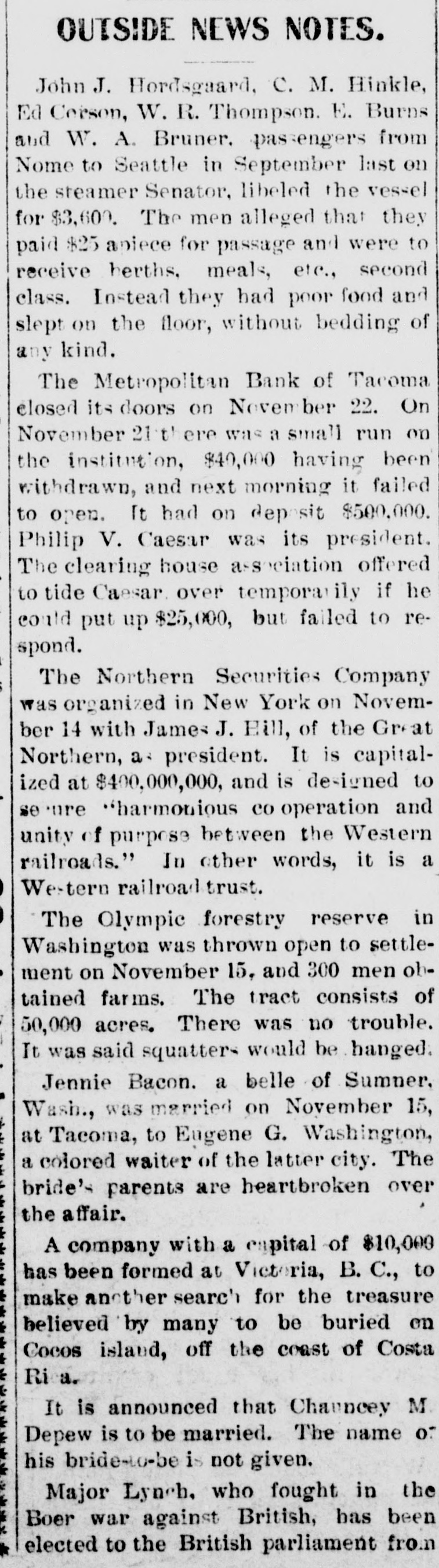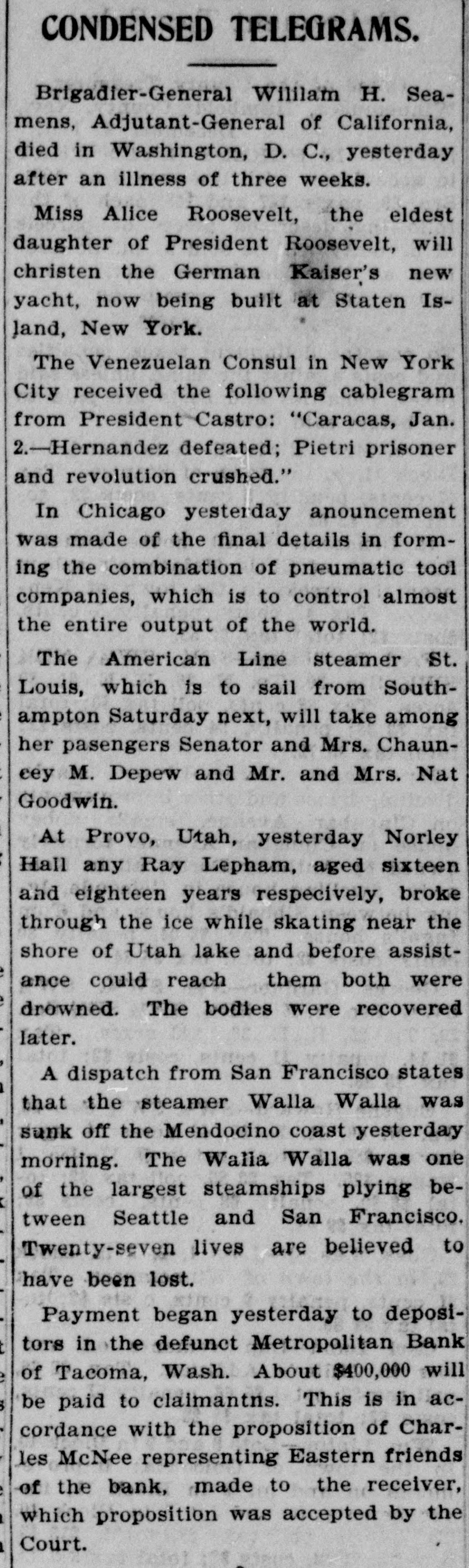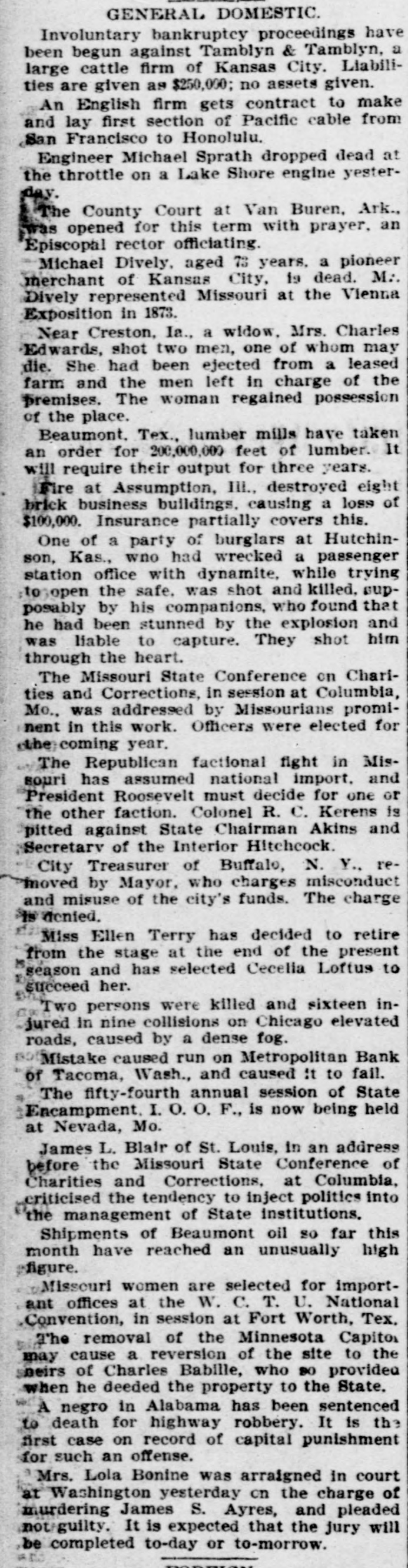should give its formal adherence to the Monroe doctrine. In the session of the Methodist Episcopal conference of Virginia, at Newport News, on the 20th, a memorial providing against admission to the church of those divorced en any but scriptural grounds was unanimously approved. Sir Frederick Trevas, surgeon to King Edward, when submitting the toast to the king at a banquet at Aberdeen, on the 20th. said it was pleasant to know that his majesty had never enjoyed such excellent health as at present. Gov. Hunt of Porto Rico says: "For the first time since the American auministration began, the last four months show a balance of trade in favor of the island. The people are not only acquiescing in American rule, but they are becoming enthusiastically American." The cabinet meeting, on the 19th, lasted about two and a half hours. The whole time was spent in the reading of the president's message and in commenting upon its various features. The message is long, in that respect at least, quite characteristic of President Roosevelt. The Metropolitan bank of Tacoma, Wash., failed, on the 19th, as a result of a run which started under a misunderstanding with regard to a suit filed against a defunct bank of similar mame. The deposits amounted to $500,000. Dwight Phelps was subsequently appointed receiver. President and Mrs. Roosevelt, accompanied by their children, left Washington, on the 22d, on the yacht Sylph for a brief cruise down the Potomac. A presidential salute of 21 guns was fired as the president went aboard the yacht. The president and his family will be gone a day or two. Mr. Dickinson, the diplomatic agent of the United States at Sofia, has gone to Constantinople, there to confer with Spencer Eddy, the secretary of the United States legation, as to the best means of hasteningasolution in the deadlock which has arisen in the negotiations for the release of Miss Stone. A large party of land and immigration agents left Chicago, on the 19th, for a tour of the southern states through which the I!!!nois Central railroad runs. The purpose of the trip, which will consume eight days, is to induce immigation to the south by showing its advantage to the homeseeker. Revenue Inspector Guy P. Cobb is in the Creek nation at the head of a strong force of Indian police, ejecting squatters and putting Creek citizens in possession of allotments as designed by the government. The squatters are angry and threatening, and in many instances force is necessary to elect them. The friends of Joseph Chamberlain, British colonial secretary, have for some time been concerned with regard to his health. On the 22d Mr. Chamberlain wrote to the Hansworth school, declining to distribute prizes at that institution, "because," as he said, "it is absolutely necessary for me to confine myself to public work." By a decision handed down by Justice Merwin, at Rome, N. Y., on the 22d, one-half of the estate of Mrs. Moses M. Davis, valued at $50,000, will go to the Christian scientists. The charge of manslaughter brought against members of the church for not allowing Mrs. Davis medical attention, the judge held, was too weak. The annual report of the commissioner of internal revenue, made public on the 19th, shows that the total receipts for the year ended June 30, 1901, were $38,871,669, or $11,555,561 in excess of the estimates; about the same amount in excess of the receipts for the year ended June 30, 1900, and $33,000,000 in excess of the receipts for 1899. Another cablegram received from the United States consul general, Mr. Dickinson, at Sofia, on the 18th, indicated that while Miss Stone had not yet been ransomed, there was reason for feeling reassured as to her future. The dispatch furnished evidencé that Mr. Dickinson remained in indirect communication with the brigands or their agents. Mr. Dickinson, the diplomatic agent at Sofia, of the United States, has left that city for Constantinople. There was obviously no prospect of settlement with Miss Stone's abductors. The departure of Mr. Dickinsonis