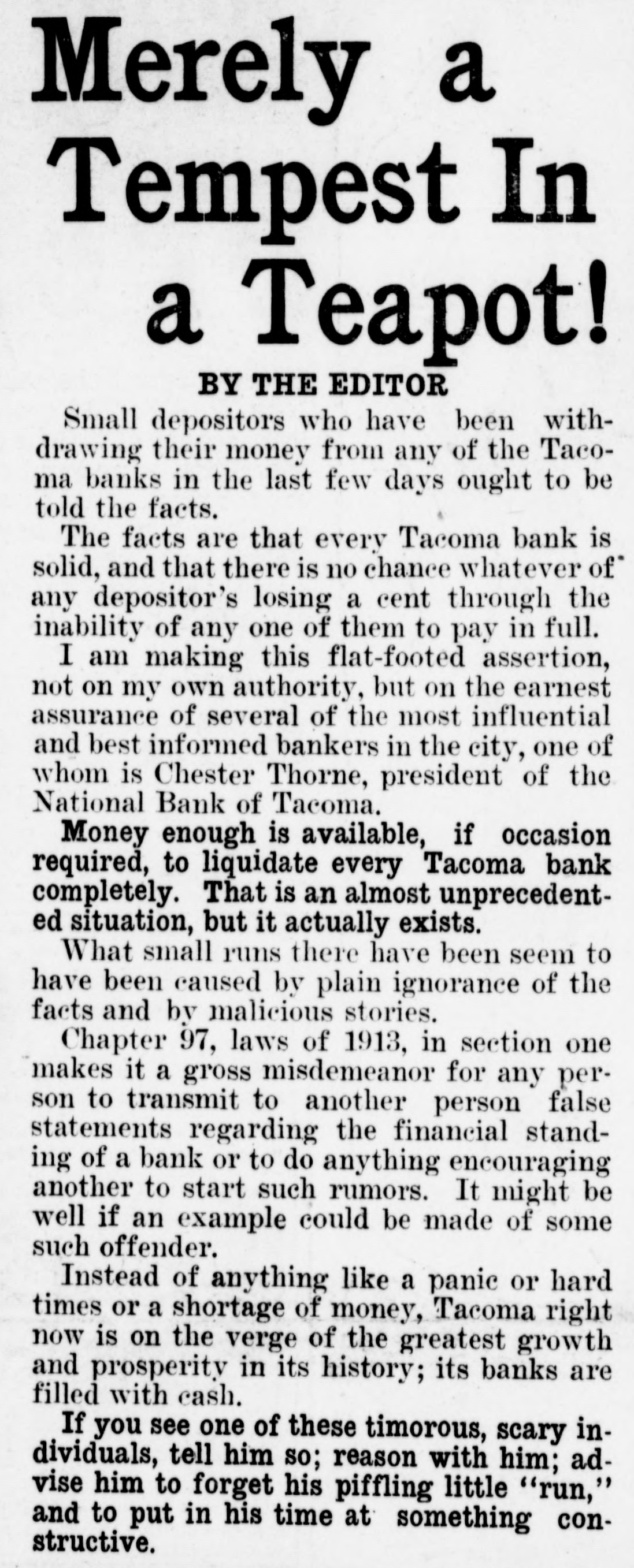 Merely a Tempest In a Teapot! BY THE EDITOR Small depositors who have been withdrawing their money from any of the Tacoma banks in the last few days ought to be told the facts. The facts are that every Tacoma bank is solid, and that there is no chance whatever of any depositor's losing a cent through the inability of any one of them to pay in full. I am making this flat-footed assertion, not on my own authority, but on the earnest assurance of several of the most influential and best informed bankers in the city, one of whom is Chester Thorne, president of the National Bank of Tacoma. Money enough is available, if occasion required, to liquidate every Tacoma bank completely. That is an almost unprecedented situation, but it actually exists. What small runs there have been seem to have been caused by plain ignorance of the facts and by malicious stories. Chapter 97, laws of 1913, in section one makes it a gross misdemeanor for any person to transmit to another person false statements regarding the financial standing of a bank or to do anything encouraging another to start such rumors. It might be well if an example could be made of some such offender. Instead of anything like a panic or hard times or a shortage of money, Tacoma right now is on the verge of the greatest growth and prosperity in its history; its banks are filled with cash. If you see one of these timorous, scary individuals, tell him so; reason with him; advise him to forget his piffling little "run," and to put in his time at something constructive.