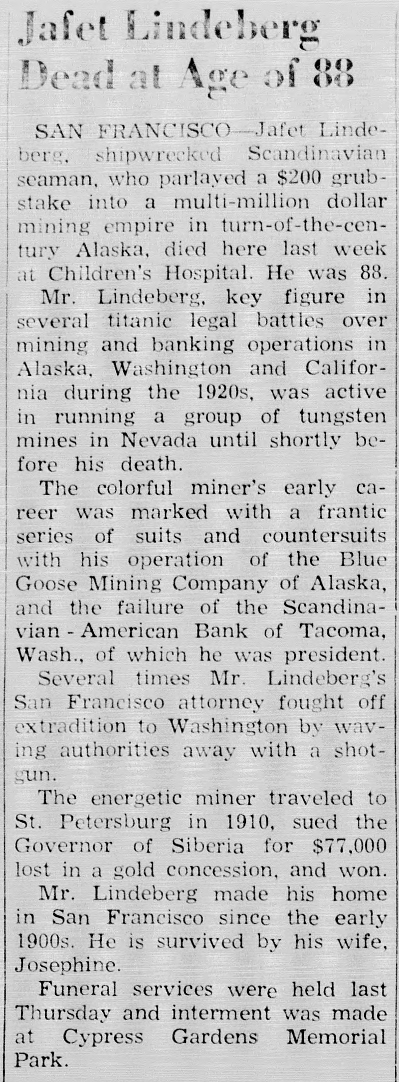 Jafet Lindeberg Dead at Age of SAN FRANCISCO-Jafet Lindeberg, shipwrecked Scandinavian seaman, who parlayed a $200 grubstake into a multi-million dollar mining empire in turn-of-the-century Alaska, died here last week at Children's Hospital. He was 88. Mr. Lindeberg, key figure in several titanic legal battles over mining and banking operations in Alaska, Washington and California during the 1920s, was active in running a group of tungsten mines in Nevada until shortly before his death. The colorful miner's early career was marked with a frantic series of suits and countersuits with his operation of the Blue Goose Mining Company of Alaska, and the failure of the Scandinavian - American Bank of Tacoma, Wash., of which he was president. Several times Mr. Lindeberg's San Francisco attorney fought off extradition to Washington by waving authorities away with a shotgun. The energetic miner traveled to St. Petersburg in 1910, sued the Governor of Siberia for $77,000 lost in a gold concession, and won. Mr. Lindeberg made his home in San Francisco since the early 1900s. He is survived by his wife, Josephine. Funeral services were held last Thursday and interment was made at Cypress Gardens Memorial Park.