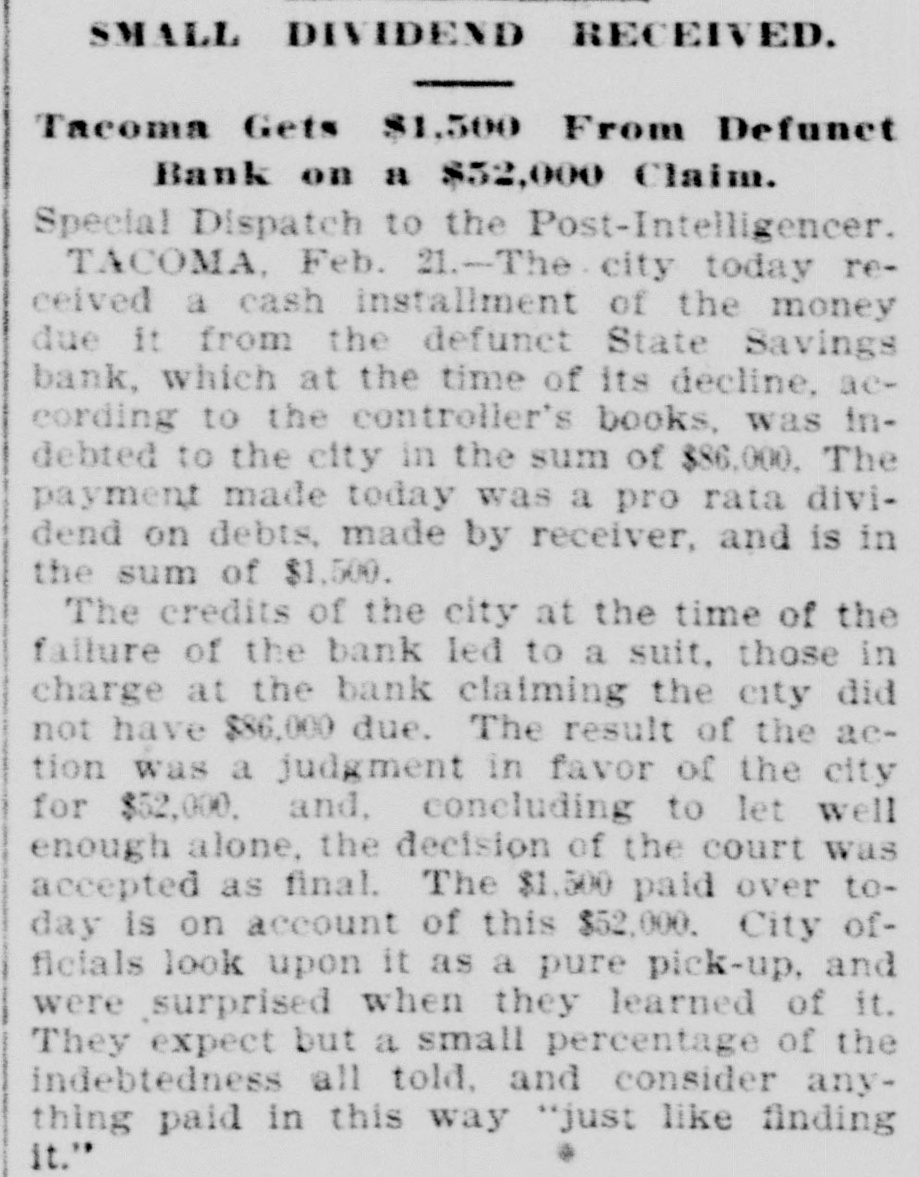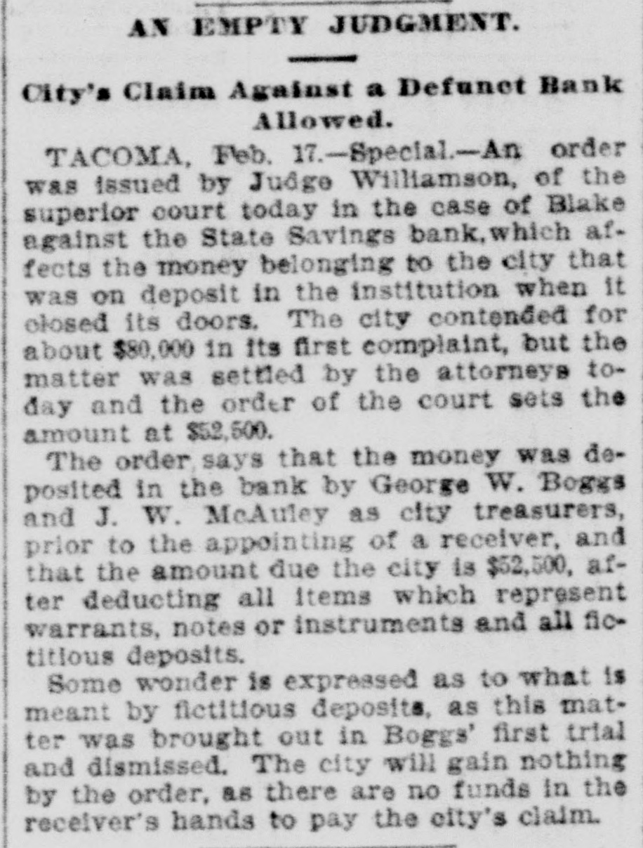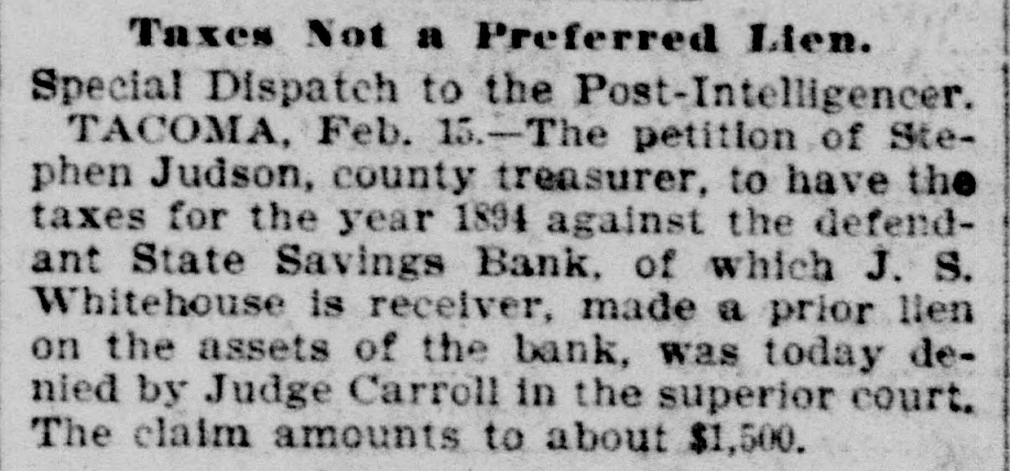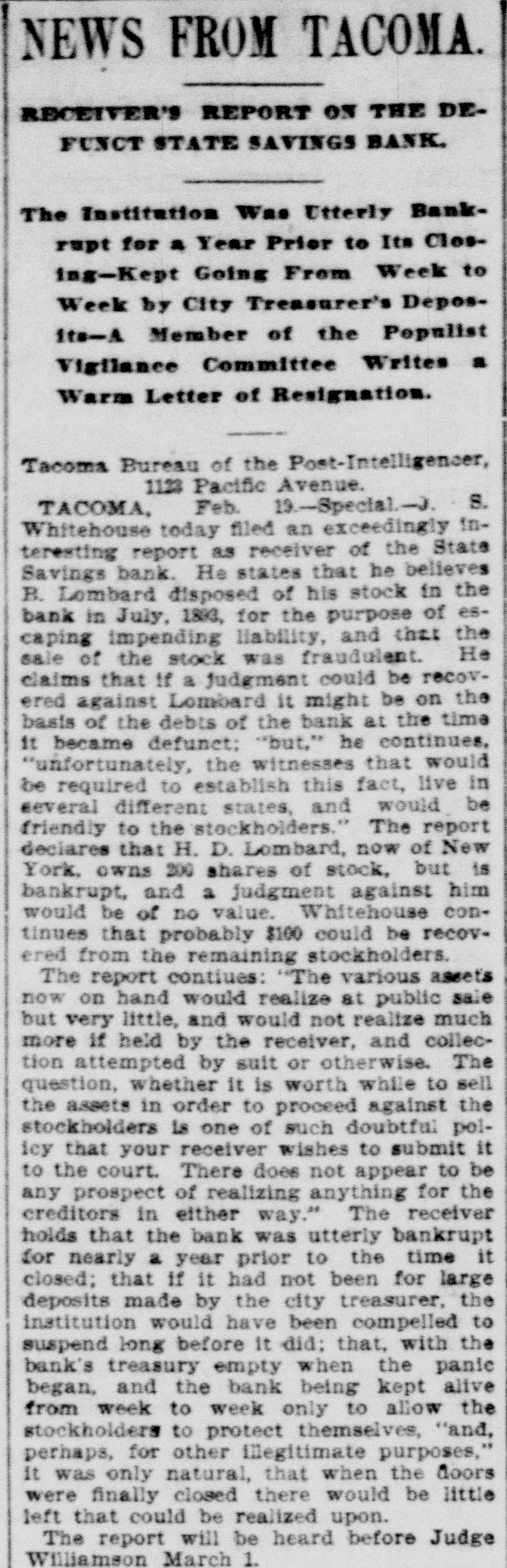 NEWS FROM TACOMA. RECEIVER'S REPORT ON THE DEFUNCT STATE SAVINGS BANK. The Institution Was Utterly Bankrupt for a Year Prior to Its Closing-Kept Going From Week to Week by City Treasurer's Deposits-A Member of the Populist Vigilance Committee Writes a Warm Letter of Resignation. Tacoma Bureau of the Post-Intelligencer, 1123 Pacific Avenue. TACOMA, Feb. 19.-Special.-J. S. Whitehouse today filed an exceedingly interesting report as receiver of the State Savings bank. He states that he believes B. Lombard disposed of his stock in the bank in July, 1893, for the purpose of escaping impending liability, and that the sale of the stock was fraudulent. He claims that If a judgment could be recovered against Lombard it might be on the basis of the debts of the bank at the time it became defunct; "but," he continues, "unfortunately, the witnesses that would be required to establish this fact, live in several different states, and would be friendly to the stockholders." The report declares that H. D. Lombard, now of New York, owns 200 shares of stock, but is bankrupt, and a judgment against him would be of no value. Whitehouse continues that probably $100 could be recovered from the remaining stockholders. The report contiues: "The various assets now on hand would realize at public sale but very little, and would not realize much more if held by the receiver, and collection attempted by suit or otherwise. The question, whether it is worth while to sell the assets in order to proceed against the stockholders is one of such doubtful policy that your receiver wishes to submit it to the court. There does not appear to be any prospect of realizing anything for the creditors in either way." The receiver holds that the bank was utterly bankrupt for nearly a year prior to the time it closed; that if it had not been for large deposits made by the city treasurer, the institution would have been compelled to suspend long before it did; that, with the bank's treasury empty when the panie began, and the bank being kept alive from week to week only to allow the stockholders to protect themselves, "and, perhaps, for other illegitimate purposes," it was only natural, that when the doors were finally closed there would be little left that could be realized upon. The report will be heard before Judge Williamson March 1.