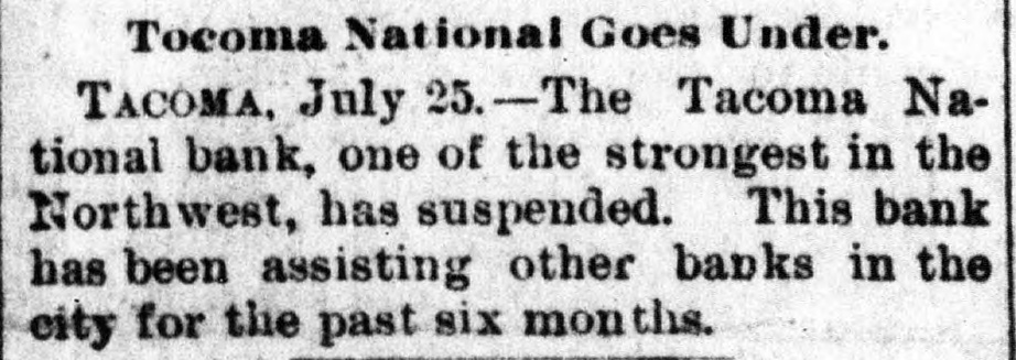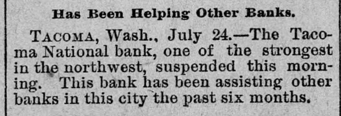 Has Been Helping Other Banks. TACOMA, Wash., July 24.-The Tacoma National bank, one of the strongest in the northwest, suspended this morning. This bank has been assisting other banks in this city the past six months.