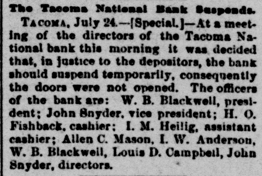 The Tacoma National Bank Suspends. TACOMA, July 24--Special.]-At a meet. ing of the directors of the Tacoma Na. tional bank this morning it was decided that, in justice to the depositors, the bank should suspend temporarily, consequently the doors were not opened. The officers of the bank are: W. B. Blackwell, president: John Snyder. vice president; H. O. Fishback. cashier: I. M. Heilig. assistant cashier: Allen C. Mason, I. W. Anderson, W. B. Blackweil, Louis D. Campbeil, John Snyder, directors.