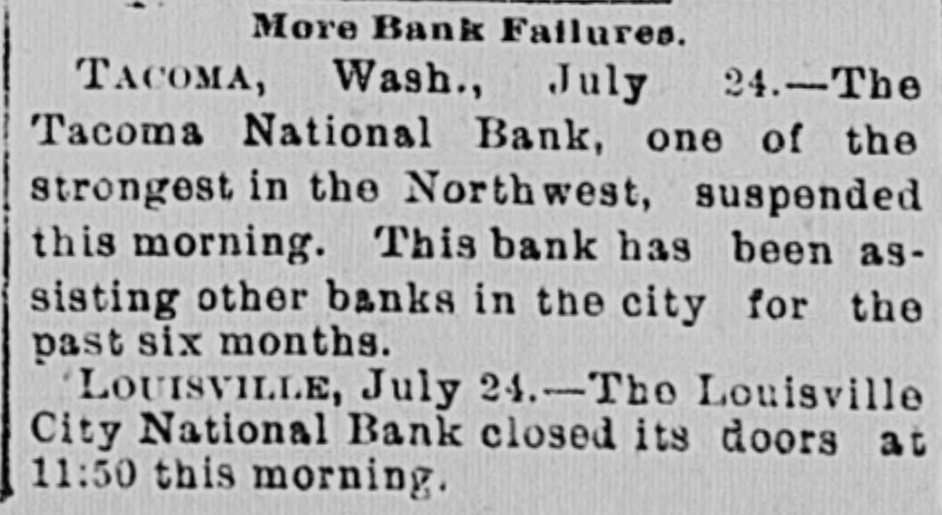 More Bank Failures. TACOMA, Wash., July 24.-The Tacoma National Bank, one of the strongest in the Northwest, suspended this morning. This bank has been assisting other banks in the city for the past six months. LOUISVILLE, July 24.-The Louisville City National Bank closed its doors at 11:50 this morning.