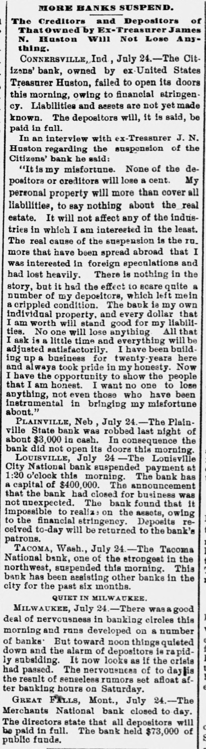 MORE BANKS SUSPEND. The Creditors and Depositors of That Owned by Ex-Treasurer James N. Huston will Not Lose Anything. CONNERSVILLE, Ind, July 24.-The Citizens' bank, owned by ex-United States Treasurer Huston, failed to open its doors this morning, owing to financial stringency. Liabilities and assets are not yet made known. The depositors will, it is said, be paid in full. In an interview with ex-Treasurer J. N. Huston regarding the suspension of the Citizens' bank he said: "It is my misfortune. None of the depositors or creditors will lose a cent. My personal property will more than cover all liabilities, to say nothing about the real estate. It will not affect any of the industries in which I am interested in the least. The real cause of the suspension is the IU. more that have been spread abroad that I was interested in foreign speculations and had lost heavily. There is nothing in the story, but it had the effect to scare quite a number of my depositors, which left mein a crippled condition. The bank 18 my own individual property, and every dollar that I am worth will stand good for my liabilities. No one will lose anything All that I ask is a little time and everything will be adjusted satisfactorily. I have been building up a business for twenty-years here and always took pride in my honesty. Now I have the opportunity to show the people that I am honest. I want no one to lose anything, not even those who have been instrumental in bringing my misfortune about." PLAINVILLE, Neb, July 24.-The Plainville State bank was robbed last night of about $3,000 in cash. In consequence the bank did not open its doors this morning. LOUISVILLE, July 24 -The Louisville City National bank suspended payment at 1:20 o'clock this morning. The bank has a capital of $400,000. The announcement that the bank had closed for business was not unexpected. The bank found that it impossible to realize on the assets, owing to the financial stringency. Deposits received to-day will be returned to the bank's patrons. TACOMA, Wash., July 24.-The Tacoma National bank, one of the strongest in the northwest, suspended this morning. This bank has been assisting other banks in the city for the past six months. QUIET IN MILWAUKEE. MILWAUKEE, July 24.-There was a good deal of nervousness in banking circles this morning and runs developed on & number of banks' But toward noon things quieted down and the alarm of depositors is rapidly subsiding. It now looks as if the crisis had passed. The nervousness of to daylis the result of senseless rumors set afloat after banking hours on Saturday. GREAT FALLS, Mont., July 24.-The Merchants National bank closed to day. The directors state that all depositors will be paid in full. The bank held $73,000 of in public funds.