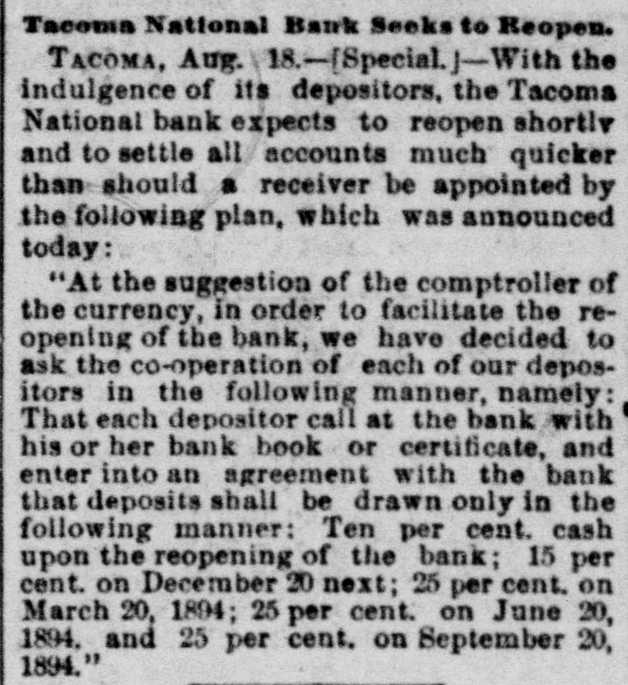 Tacoma National Bank Seeks to Reopen. TACOMA, Aug. 18.-[Special.j-With the indulgence of its depositors, the Tacoma National bank expects to reopen shortly and to settle all accounts much quicker than should a receiver be appointed by the following plan, which was announced today: "At the suggestion of the comptroller of the currency, in order to facilitate the reopening of the bank, we have decided to ask the co-operation of each of our depositors in the following manner, namely: That each depositor call at the bank with his or her bank book or certificate, and enter into an agreement with the bank that deposits shall be drawn only in the following manner: Ten per cent. cash upon the reopening of the bank; 15 per cent. on December 20 next; 25 per cent. on March 20, 1894; 25 per cent. on June 20, 1894. and 25 per cent. on September 20, 1894."