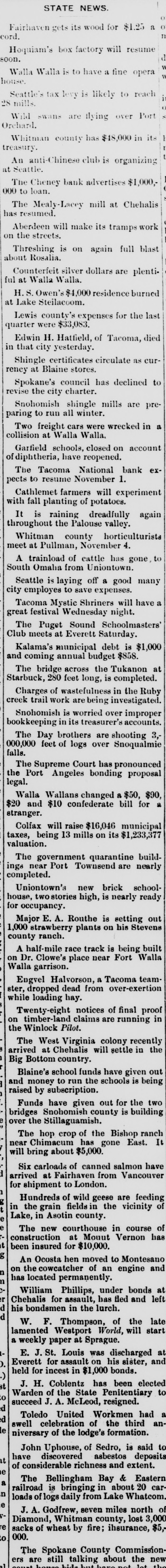 The Mealy-Lacey mill at Chehalis has resumed. Aberdeen will make its tramps work on the streets. Threshing is on again full blast about Rosalia. Counterfeit silver dollars are plentiful at Walla Walla. H. S. Owen's $4,000 residence burned at Lake Steilacoom. Lewis county's expenses for the last quarter were $33,083. Edwin H. Hatfield, of Tacoma, died in that city yesterday. Shingle certificates circulate as currency at Blaine stores. Spokane's council has declined to revise the city charter. Snohomish shingle mills are preparing to run all winter. Two freight cars were wrecked in a collision at Walla Walla. Garfield schools, closed on account of diphtheria, have reopened. The Tacoma National bank expects to resume November 1. Cathlemet farmers will experiment with fall planting of potatoes. It is raining dreadfully again throughout the Palouse valley. Whitman county horticulturists meet at Pullman, November 4. A trainload of cattle has gone, to South Omaha from Uniontown. Seattle is laying off a good many city employes to save expenses. Tacoma Mystic Shriners will have a great festival Wednesday night. The Puget Sound Schoolmasters' Club meets at Everett Saturday. Kalama's municipal debt is $1,000 and coming annual budget $858. The bridge across the Tukanon at Starbuck, 280 feet long, is completed. Charges of wastefulness in the Ruby creek trail work arebeing investigated. Snohomish is worried over improper bookkeeping in its treasurer's accounts. The Day brothers are shooting 3,000,000 falls. feet of logs over Snoqualmie The Supreme Court has pronounced legal. the Port Angeles bonding proposal Walla Wallans changed a $50, $90, $20 stranger. and $10 confederate bill for a Colfax will raise $16,046 municipal valuation. taxes, being 13 mills on its $1,233,377 The government quarantine buildcompleted. ings near Port Townsend are nearly Uniontown's new brick schoolhouse, stories high, is nearly ready for occupancy. Major E. A. Routhe is setting out 1,000 strawberry plants on his Stevens county ranch. A half-mile race track is being built on Dr. Clowe's place near Fort Walla Walla garrison. Engvel Halvorson, a Tacoma team. ster, dropped dead from over-exertion while loading hay. Twenty-eight notices of final proof on timber-land claims are running in the Winlock Pilot. The West Virginia colony recently arrived at Chehalis will settle in the Big Bottom country. Blaine's school funds have given out and money to run the schools is being raised by subscription. Funds have given out for the two bridges Snohomish county is building over the Stillaguamish. The hop crop of the Bishop ranch near Chimacum has gone East. It will bring about $5,000. Six carloads of canned salmon have arrived at Fairhaven from Vancouver for shipment to London. Hundreds of wild geese are feeding in the grain fields in the vicinity of Lake, in Asotin county. The new courthouse in course of construction at Mount Vernon has been insured for $10,000. An Ocosta hen moved to Montesano on the cowcatcher of an engine and has located permanently. William Phillips, under bonds at Chehalis for assault, has fled and left his bondsmen in the lurch. W. F. Thompson, of the late lamented Westport World, will start a weekly paper at Sprague. E. J. St. Louis was discharged at Everett for assault on his sister, and held for incest in $1,000 bonds. it J. H. Coblentz has been elected 0 Warden of the State Penitentiary to succeed J. A. McLeod, resigned. d d Toledo United Workmen had swell celebration of the third an- a le niversary of the lodge's formation. John Uphouse, of Sedro, is said to it have discovered asbestos deposits of considerable richness and extent. a The Bellingham Bay & Eastern railroad is bringing in about 20 carloads of logs daily from