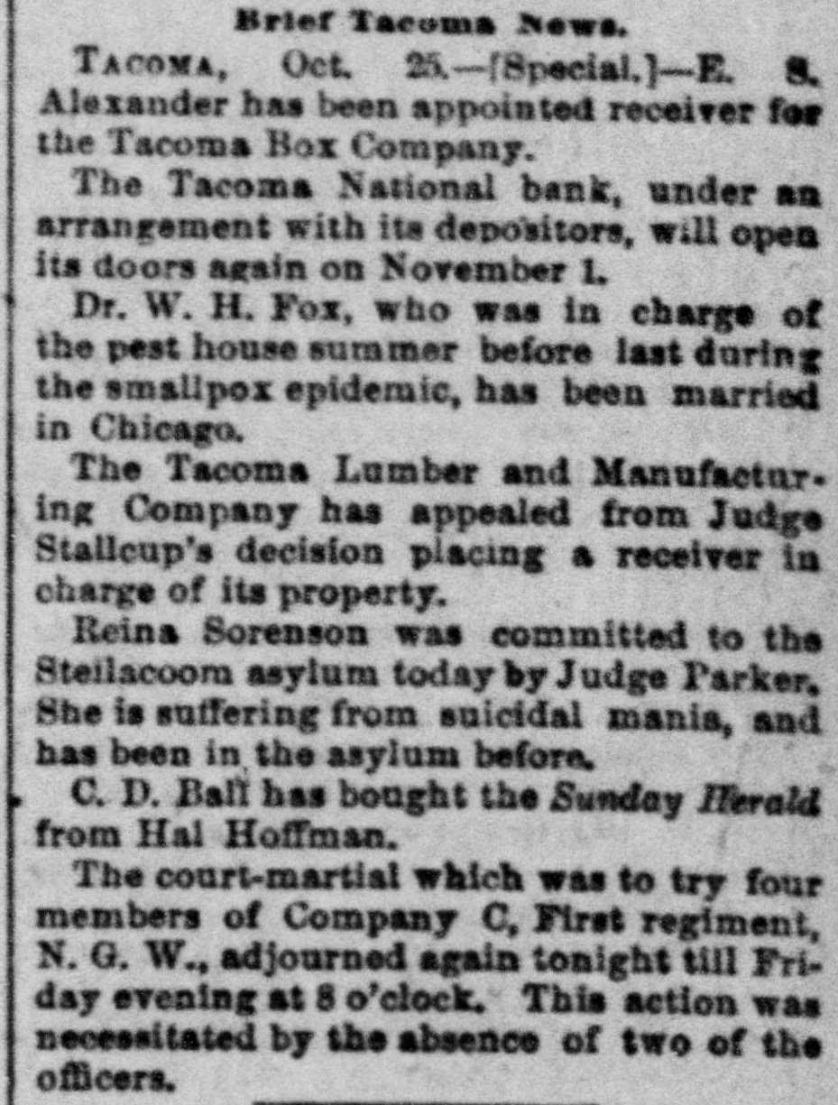 Brief Tacoma News. TACOMA, Oct. 25.-(Special.]-E. 8. Alexander has been appointed receiver for the Tacoma Box Company. The Tacoma National bank, under an arrangement with its depositors, will open its doors again on November 1. Dr. W. H. Fox, who was in charge of the pest house summer before last during the smallpox epidemic, has been married in Chicago. The Tacoma Lumber and Manufactur. ing Company has appealed from Judge Stallcup's decision placing a receiver in charge of its property. Reina Sorenson was committed to the Steilacoom asylum today by Judge Parker, She is suffering from suicidal mania, and has been in the asylum before, C. D. Ball has bought the Sunday Herald from Hal Hoffman. The court-martial which was to try four members of Company C, First regiment, N. G. W., adjourned again tonight till Friday evening at 8 o'clock. This action was necessitated by the absence of two of the officers.