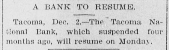 A BANK TO RESUME. Tacoma, Dec. 2.-The Tacoma National Bank, which suspended four months ago, will resume on Monday.