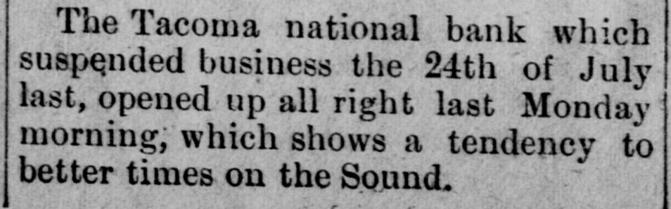 The Tacoma national bank which suspended business the 24th of July last, opened up all right last Monday morning, which shows a tendency to better times on the Sound.