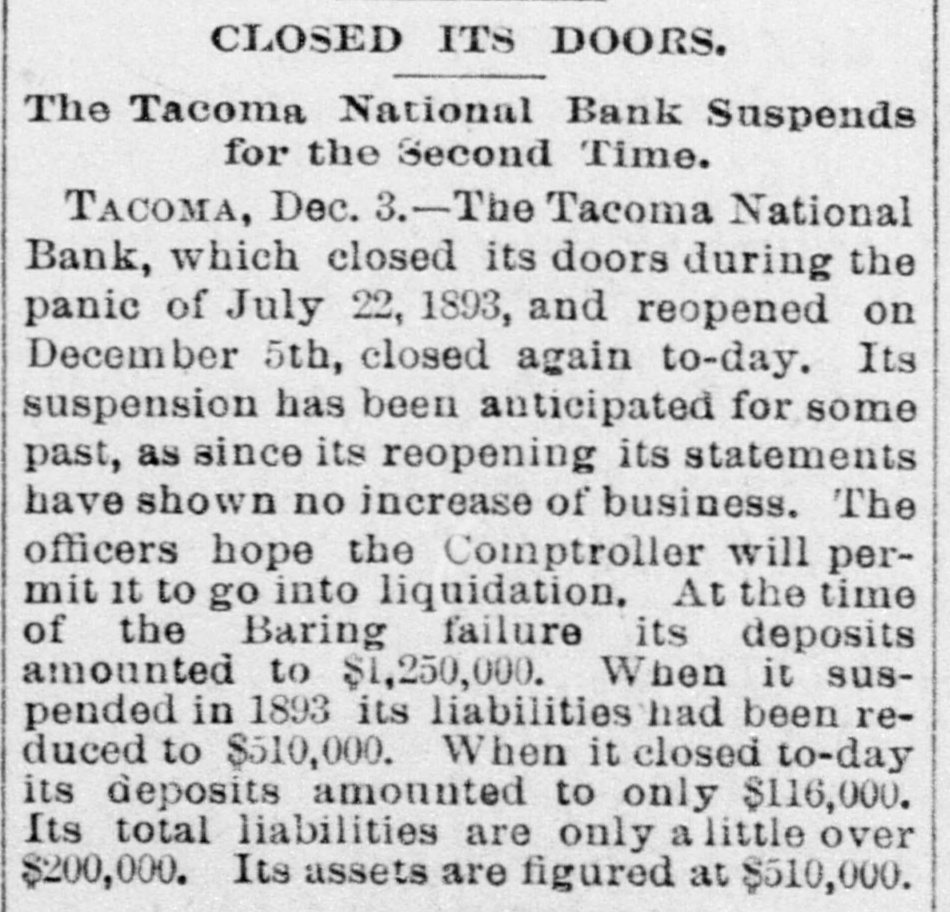 CLOSED ITS DOORS. The Tacoma National Bank Suspends for the Second Time. TACOMA, Dec. - The Tacoma National Bank, which closed its doors during the panic of July 22, 1893, and reopened on December 5th, closed again to-day. Its suspension has been anticipated for some past, as since its reopening its statements have shown no increase of business. The officers hope the Comptroller will permit it to go into liquidation. At the time of the Baring failure its deposits amounted to $1,250,000. When it suspended in 1893 its liabilities had been reduced to $510,000. When it closed to-day its deposits amounted to only $116,000. Its total liabilities are only a little over $200,000. Its assets are figured at $510,000.