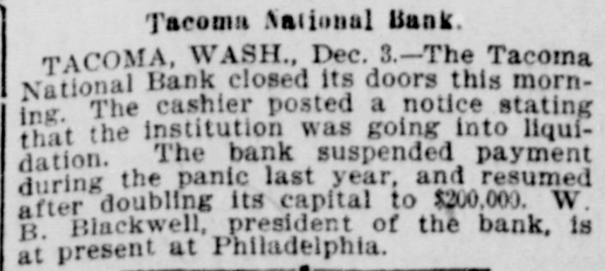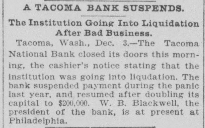 Tacoma National Bank. TACOMA, WASH., Dec. 3.-The Tacoma National Bank closed its doors this morning. The cashier posted a notice stating that the institution was going into liquidation. The bank suspended payment during the panic last year, and resumed after doubling its capital to $200,000. W. B. Blackwell, president of the bank, is at present at Philadelphia.