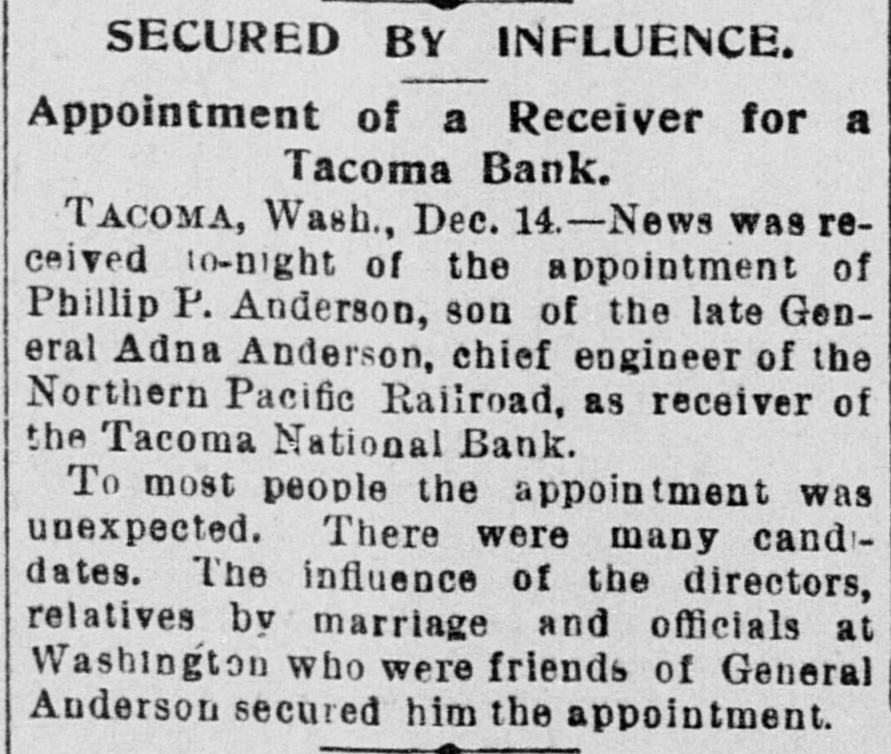 SECURED BY INFLUENCE. Appointment of a Receiver for a Tacoma Bank. Tacoma, Wash., Dec. 14.-News was received to-night of the appointment of Phillip P. Anderson, son of the late General Adna Anderson, chief engineer of the Northern Pacific Railroad, as receiver of the Tacoma National Bank. To most people the appointment was unexpected. There were many cand dates. The influence of the directors, relatives by marriage and officials at Washington who were friends of General Anderson secured him the appointment.